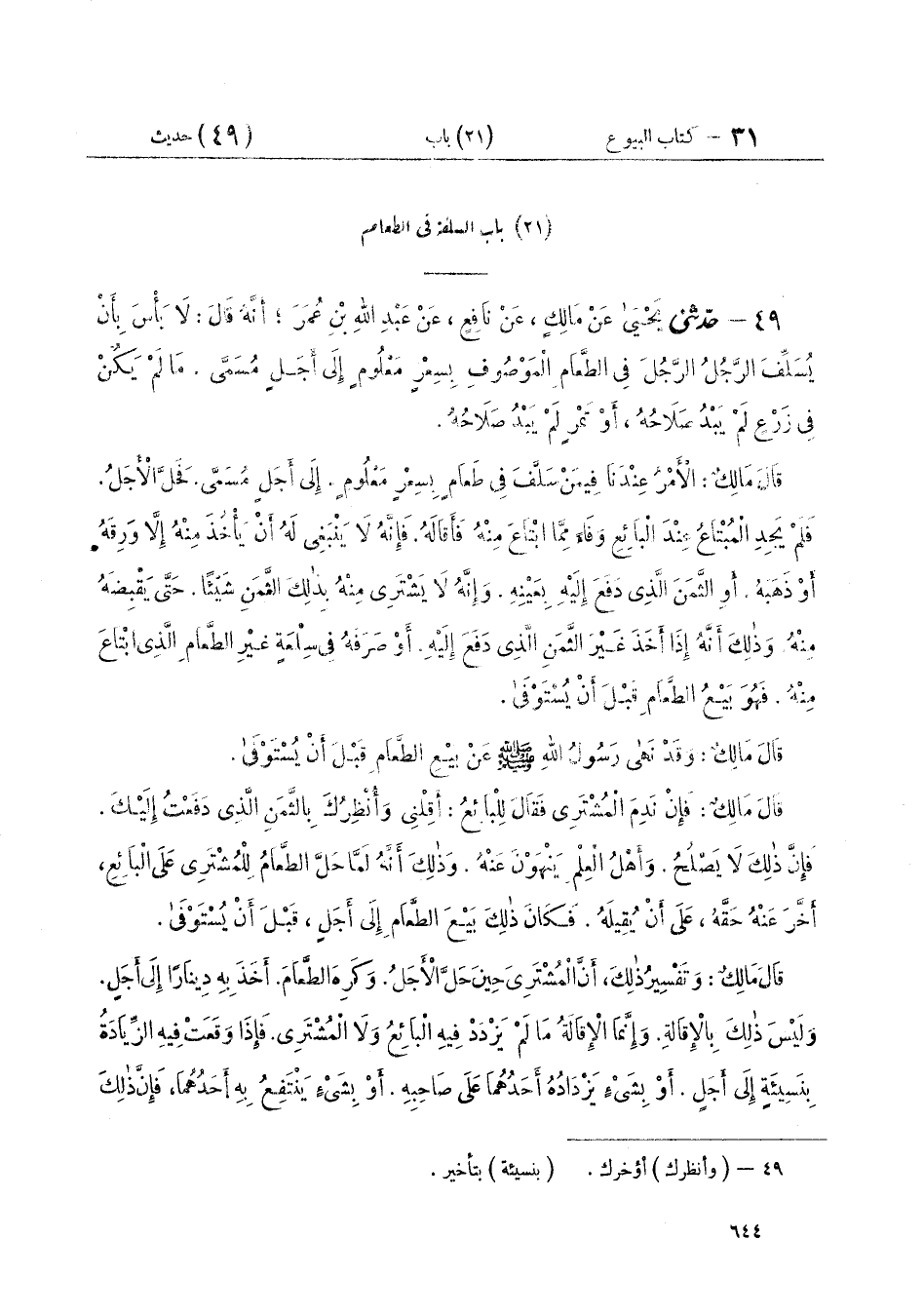 ٤٩ - حَدَّثَنِي يَحْيَى، عَنْ مَالِكٍ عَنْ نَافِعٍ، عَنْ عَبْدِ اللَّهِ بْنِ عُمَرَ أَنَّهُ قَالَ: «لَا بَأْسَ بِأَنْ يُسَلِّفَ الرَّجُلُ الرَّجُلَ فِي الطَّعَامِ الْمَوْصُوفِ بِسِعْرٍ مَعْلُومٍ إِلَى أَجَلٍ مُسَمًّى، مَا لَمْ يَكُنْ فِي زَرْعٍ لَمْ يَبْدُ صَلَاحُهُ، أَوْ تَمْرٍ لَمْ يَبْدُ صَلَاحُهُ» قَالَ مَالِكٌ: " الْأَمْرُ عِنْدَنَا فِيمَنْ سَلَّفَ فِي طَعَامٍ بِسِعْرٍ مَعْلُومٍ إِلَى أَجَلٍ مُسَمًّى، فَحَلَّ الْأَجَلُ فَلَمْ يَجِدِ الْمُبْتَاعُ عِنْدَ الْبَائِعِ وَفَاءً مِمَّا ابْتَاعَ مِنْهُ، فَأَقَالَهُ فَإِنَّهُ لَا يَنْبَغِي لَهُ أَنْ يَأْخُذَ مِنْهُ إِلَّا وَرِقَهُ أَوْ ذَهَبَهُ أَوِ الثَّمَنَ الَّذِي دَفَعَ إِلَيْهِ بِعَيْنِهِ، وَإِنَّهُ لَا يَشْتَرِي مِنْهُ بِذَلِكَ الثَّمَنِ شَيْئًا حَتَّى يَقْبِضَهُ مِنْهُ، وَذَلِكَ أَنَّهُ إِذَا أَخَذَ غَيْرَ الثَّمَنِ الَّذِي دَفَعَ إِلَيْهِ، أَوْ صَرَفَهُ فِي سِلْعَةٍ غَيْرِ الطَّعَامِ الَّذِي ابْتَاعَ مِنْهُ، فَهُوَ بَيْعُ الطَّعَامِ قَبْلَ أَنْ يُسْتَوْفَى، قَالَ مَالِكٌ: وَقَدْ نَهَى رَسُولُ اللَّهِ صَلَّى اللهُ عَلَيْهِ وَسَلَّمَ عَنْ بَيْعِ الطَّعَامِ قَبْلَ أَنْ يُسْتَوْفَى " قَالَ مَالِكٌ: " فَإِنْ نَدِمَ الْمُشْتَرِي، فَقَالَ لِلْبَائِعِ: أَقِلْنِي وَأُنْظِرُكَ بِالثَّمَنِ الَّذِي دَفَعْتُ إِلَيْكَ، فَإِنَّ ذَلِكَ لَا يَصْلُحُ، وَأَهْلُ الْعِلْمِ يَنْهَوْنَ عَنْهُ، وَذَلِكَ أَنَّهُ لَمَّا حَلَّ الطَّعَامُ لِلْمُشْتَرِي عَلَى الْبَائِعِ، أَخَّرَ عَنْهُ حَقَّهُ عَلَى أَنْ يُقِيلَهُ فَكَانَ ذَلِكَ بَيْعَ الطَّعَامِ إِلَى أَجَلٍ قَبْلَ أَنْ يُسْتَوْفَى " قَالَ مَالِكٌ: «وَتَفْسِيرُ ذَلِكَ أَنَّ الْمُشْتَرِيَ حِينَ حَلَّ الْأَجَلُ، وَكَرِهَ الطَّعَامَ أَخَذَ بِهِ دِينَارًا إِلَى أَجَلٍ، وَلَيْسَ ذَلِكَ بِالْإِقَالَةِ، وَإِنَّمَا الْإِقَالَةُ مَا لَمْ يَزْدَدْ فِيهِ الْبَائِعُ، وَلَا الْمُشْتَرِي، فَإِذَا وَقَعَتْ فِيهِ الزِّيَادَةُ بِنَسِيئَةٍ إِلَى أَجَلٍ، أَوْ بِشَيْءٍ يَزْدَادُهُ أَحَدُهُمَا عَلَى صَاحِبِهِ، أَوْ بِشَيْءٍ يَنْتَفِعُ بِهِ أَحَدُهُمَا، فَإِنَّ ذَلِكَ ⦗٦٤٥⦘ لَيْسَ بِالْإِقَالَةِ، وَإِنَّمَا تَصِيرُ الْإِقَالَةُ إِذَا فَعَلَا ذَلِكَ بَيْعًا، وَإِنَّمَا أُرْخِصَ فِي الْإِقَالَةِ وَالشِّرْكِ، وَالتَّوْلِيَةِ مَا لَمْ يَدْخُلْ شَيْئًا مِنْ ذَلِكَ زِيَادَةٌ أَوْ نُقْصَانٌ، أَوْ نَظِرَةٌ، فَإِنْ دَخَلَ ذَلِكَ زِيَادَةٌ أَوْ نُقْصَانٌ أَوْ نَظِرَةٌ صَارَ بَيْعًا يُحِلُّهُ مَا يُحِلُّ الْبَيْعَ وَيُحَرِّمُهُ مَا يُحَرِّمُ الْبَيْعَ» قَالَ مَالِكٌ: «مَنْ سَلَّفَ فِي حِنْطَةٍ شَامِيَّةٍ، فَلَا بَأْسَ أَنْ يَأْخُذَ مَحْمُولَةً بَعْدَ مَحِلِّ الْأَجَلِ» قَالَ مَالِكٌ: «وَكَذَلِكَ مَنْ سَلَّفَ فِي صِنْفٍ مِنَ الْأَصْنَافِ، فَلَا بَأْسَ أَنْ يَأْخُذَ خَيْرًا مِمَّا سَلَّفَ فِيهِ أَوْ أَدْنَى بَعْدَ مَحِلِّ الْأَجَلِ، وَتَفْسِيرُ ذَلِكَ أَنْ يُسَلِّفَ الرَّجُلُ فِي حِنْطَةٍ مَحْمُولَةٍ، فَلَا بَأْسَ أَنْ يَأْخُذَ شَعِيرًا أَوْ شَامِيَّةً، وَإِنْ سَلَّفَ فِي تَمْرٍ عَجْوَةٍ، فَلَا بَأْسَ أَنْ يَأْخُذَ صَيْحَانِيًّا أَوْ جَمْعًا، وَإِنْ سَلَّفَ فِي زَبِيبٍ أَحْمَرَ، فَلَا بَأْسَ أَنْ يَأْخُذَ أَسْوَدَ إِذَا كَانَ ذَلِكَ كُلُّهُ بَعْدَ مَحِلِّ الْأَجَلِ، إِذَا كَانَتْ مَكِيلَةُ ذَلِكَ سَوَاءً بِمِثْلِ كَيْلِ مَا سَلَّفَ فِيهِ»