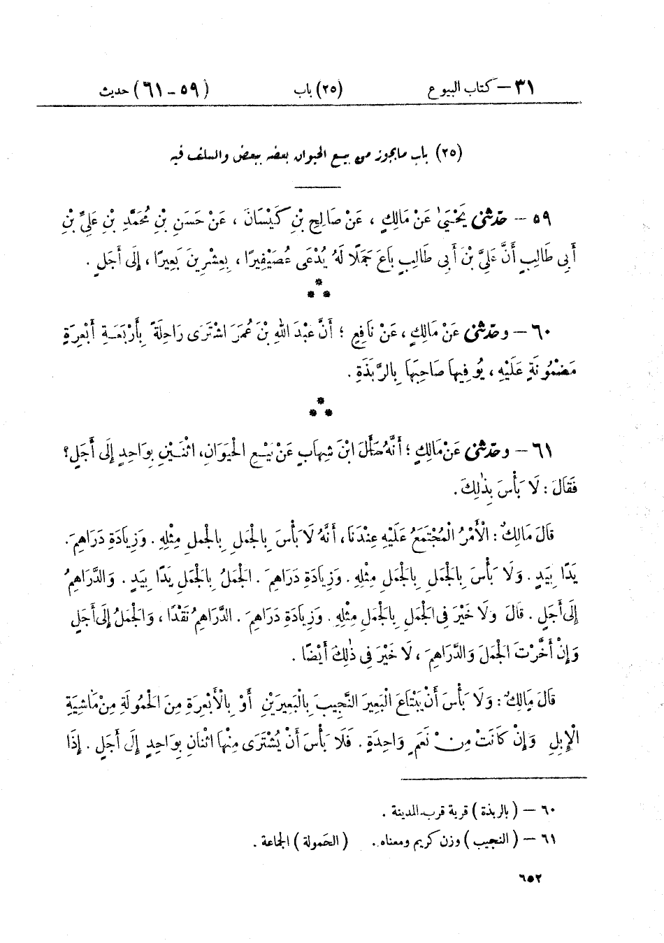 ٥٩ - حَدَّثَنِي يَحْيَى، عَنْ مَالِكٍ، عَنْ صَالِحِ بْنِ كَيْسَانَ، عَنْ حَسَنِ بْنِ مُحَمَّدِ بْنِ عَلِيِّ بْنِ أَبِي طَالِبٍ، أَنَّ عَلِيَّ بْنَ أَبِي طَالِبٍ «بَاعَ جَمَلًا لَهُ يُدْعَى عُصَيْفِيرًا بِعِشْرِينَ بَعِيرًا إِلَى أَجَلٍ»