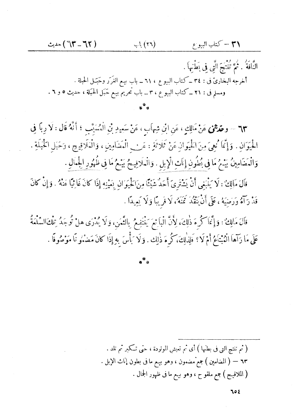 ٦٣ - وَحَدَّثَنِي عَنْ مَالِكٍ، عَنِ ابْنِ شِهَابٍ، عَنْ سَعِيدِ بْنِ الْمُسَيِّبِ أَنَّهُ قَالَ: " لَا رِبًا فِي الْحَيَوَانِ، وَإِنَّمَا نُهِيَ مِنَ الْحَيَوَانِ عَنْ ثَلَاثَةٍ: عَنِ الْمَضَامِينِ وَالْمَلَاقِيحِ وَحَبَلِ الْحَبَلَةِ، وَالْمَضَامِينُ بَيْعُ مَا فِي بُطُونِ إِنَاثِ الْإِبِلِ، وَالْمَلَاقِيحُ بَيْعُ مَا فِي ظُهُورِ الْجِمَالِ " قَالَ مَالِكٌ: «لَا يَنْبَغِي أَنْ يَشْتَرِيَ أَحَدٌ شَيْئًا مِنَ الْحَيَوَانِ بِعَيْنِهِ إِذَا كَانَ غَائِبًا عَنْهُ، وَإِنْ كَانَ قَدْ رَآهُ وَرَضِيَهُ عَلَى أَنْ يَنْقُدَ ثَمَنَهُ لَا قَرِيبًا وَلَا بَعِيدًا» قَالَ مَالِكٌ: «وَإِنَّمَا كُرِهَ ذَلِكَ، لِأَنَّ الْبَائِعَ يَنْتَفِعُ بِالثَّمَنِ، وَلَا يُدْرَى هَلْ تُوجَدُ تِلْكَ السِّلْعَةُ عَلَى مَا رَآهَا الْمُبْتَاعُ أَمْ لَا؟ فَلِذَلِكَ كُرِهَ ذَلِكَ، وَلَا بَأْسَ بِهِ، إِذَا كَانَ مَضْمُونًا مَوْصُوفًا»