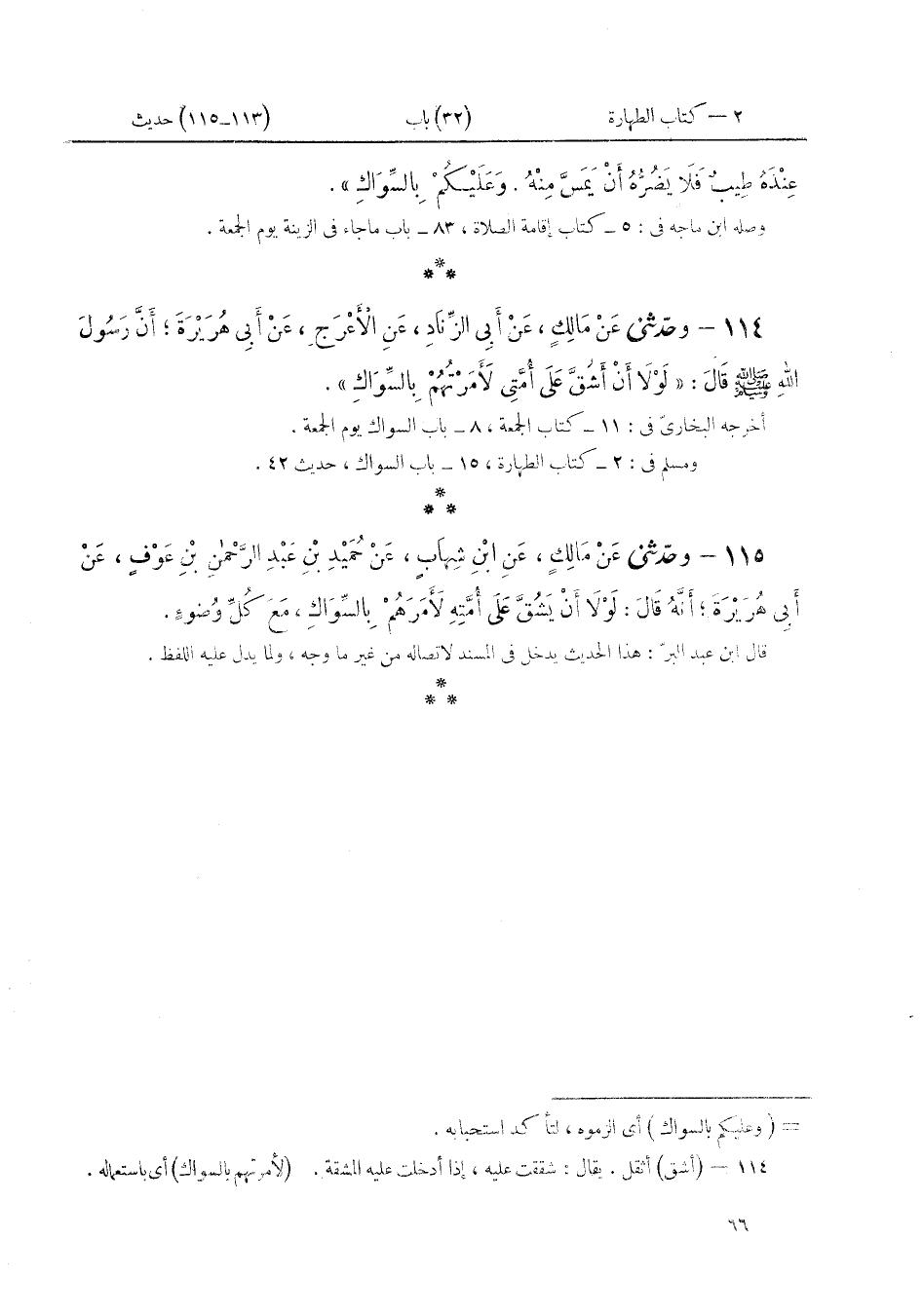 ١١٤ - ، وَحَدَّثَنِي عَنْ مَالِكٍ، عَنْ أَبِي الزِّنَادِ، عَنِ الْأَعْرَجِ، عَنْ أَبِي هُرَيْرَةَ أَنَّ رَسُولَ اللَّهِ صَلَّى اللهُ عَلَيْهِ وَسَلَّمَ قَالَ: «لَوْلَا أَنْ أَشُقَّ عَلَى أُمَّتِي لَأَمَرْتُهُمْ بِالسِّوَاكِ»