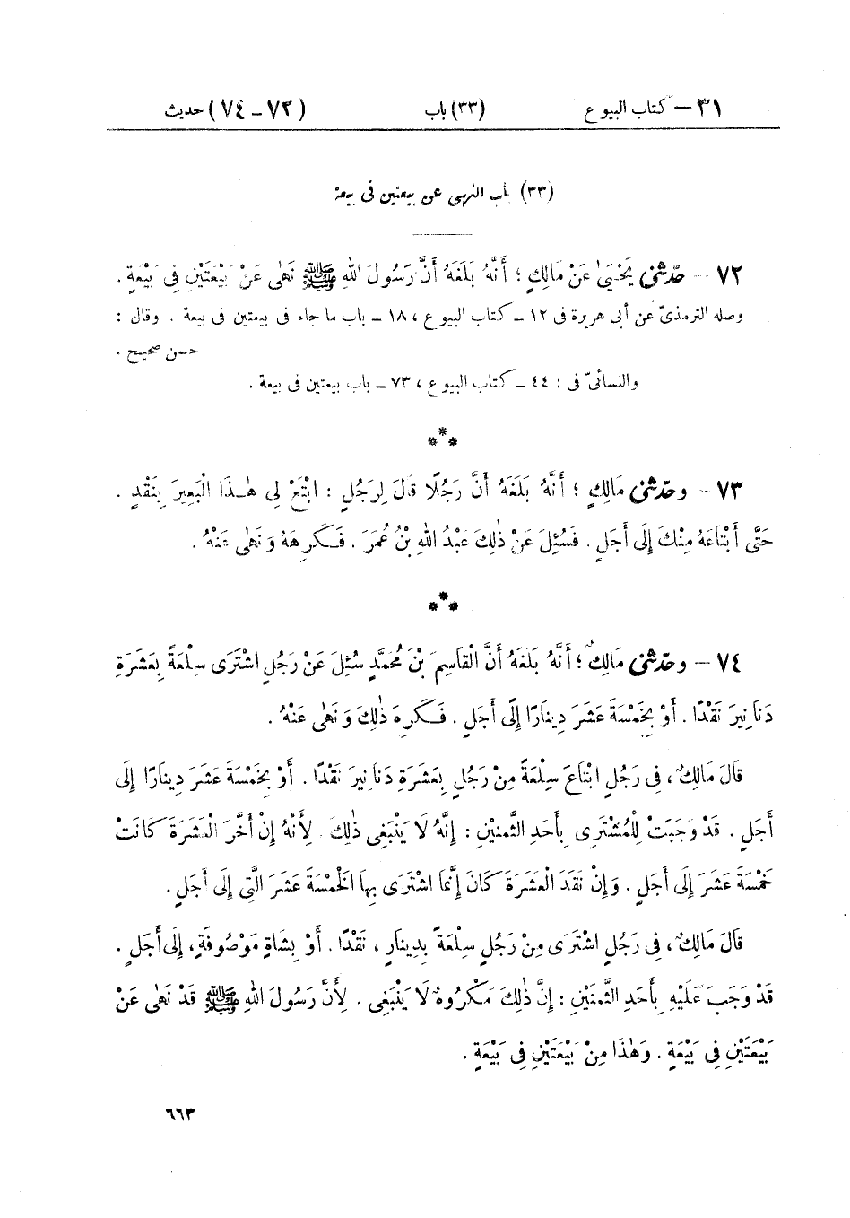 ٧٢ - حَدَّثَنِي يَحْيَى، عَنْ مَالِكٍ أَنَّهُ بَلَغَهُ، أَنَّ رَسُولَ اللَّهِ صَلَّى اللهُ عَلَيْهِ وَسَلَّمَ: «نَهَى عَنْ بَيْعَتَيْنِ فِي بَيْعَةٍ»