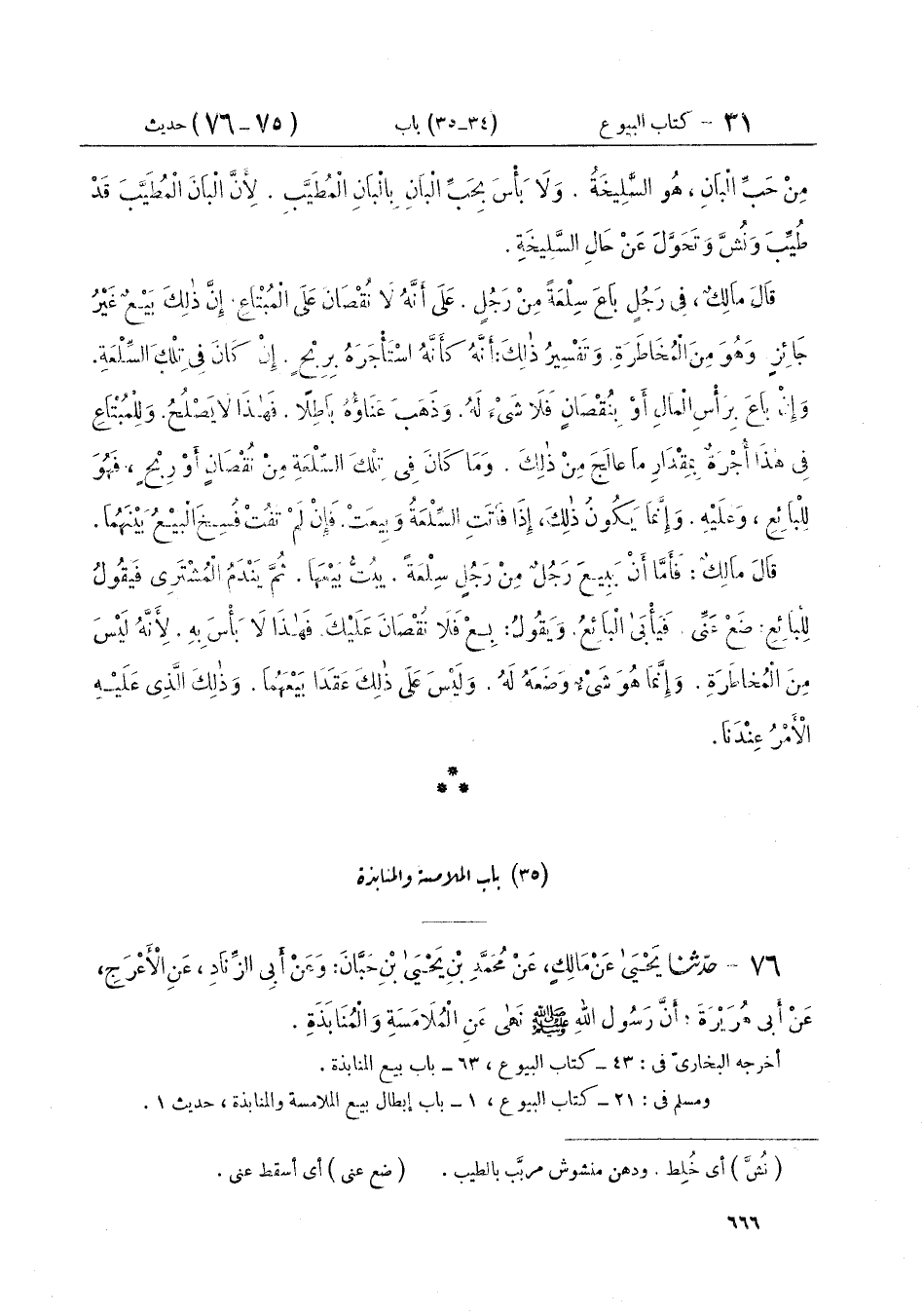 ٧٦ - حَدَّثَنَا يَحْيَى، عَنْ مَالِكٍ، عَنْ مُحَمَّدِ بْنِ يَحْيَى بْنِ حَبَّانَ، وَعَنْ أَبِي الزِّنَادِ، عَنِ الْأَعْرَجِ، عَنْ أَبِي هُرَيْرَةَ، أَنَّ رَسُولَ اللَّهِ صَلَّى اللهُ عَلَيْهِ وَسَلَّمَ: «نَهَى عَنِ الْمُلَامَسَةِ وَالْمُنَابَذَةِ» ⦗٦٦٧⦘ قَالَ مَالِكٌ: " وَالْمُلَامَسَةُ: أَنْ يَلْمِسَ الرَّجُلُ الثَّوْبَ، وَلَا يَنْشُرُهُ، وَلَا يَتَبَيَّنُ مَا فِيهِ، أَوْ يَبْتَاعَهُ لَيْلًا، وَلَا يَعْلَمُ مَا فِيهِ، وَالْمُنَابَذَةُ أَنْ يَنْبِذَ الرَّجُلُ إِلَى الرَّجُلِ ثَوْبَهُ، وَيَنْبِذَ الْآخَرُ إِلَيْهِ ثَوْبَهُ عَلَى غَيْرِ تَأَمُّلٍ مِنْهُمَا، وَيَقُولُ كُلُّ وَاحِدٍ مِنْهُمَا هَذَا بِهَذَا، فَهَذَا الَّذِي نُهِيَ عَنْهُ مِنَ الْمُلَامَسَةِ وَالْمُنَابَذَةِ " قَالَ مَالِكٌ: «فِي السَّاجِ الْمُدْرَجِ فِي جِرَابِهِ، أَوِ الثَّوْبِ الْقُبْطِيِّ الْمُدْرَجِ فِي طَيِّهِ، إِنَّهُ لَا يَجُوزُ بَيْعُهُمَا، حَتَّى يُنْشَرَا، وَيُنْظَرَ إِلَى مَا فِي أَجْوَافِهِمَا، وَذَلِكَ أَنَّ بَيْعَهُمَا مِنْ بَيْعِ الْغَرَرِ، وَهُوَ مِنَ الْمُلَامَسَةِ» قَالَ مَالِكٌ: «وَبَيْعُ الْأَعْدَالِ عَلَى الْبَرْنَامَجِ، مُخَالِفٌ لِبَيْعِ السَّاجِ فِي جِرَابِهِ، وَالثَّوْبِ فِي طَيِّهِ، وَمَا أَشْبَهَ ذَلِكَ، فَرَقَ بَيْنَ ذَلِكَ الْأَمْرُ الْمَعْمُولُ بِهِ، وَمَعْرِفَةُ ذَلِكَ فِي صُدُورِ النَّاسِ، وَمَا مَضَى مِنْ عَمَلِ الْمَاضِينَ فِيهِ، وَأَنَّهُ لَمْ يَزَلْ مِنْ بُيُوعِ النَّاسِ الْجَائِزَةِ، وَالتِّجَارَةِ بَيْنَهُمِ الَّتِي لَا يَرَوْنَ بِهَا بَأْسًا، لِأَنَّ بَيْعَ الْأَعْدَالِ عَلَى الْبَرْنَامَجِ عَلَى غَيْرِ نَشْرٍ، لَا يُرَادُ بِهِ الْغَرَرُ، وَلَيْسَ يُشْبِهُ الْمُلَامَسَةَ»