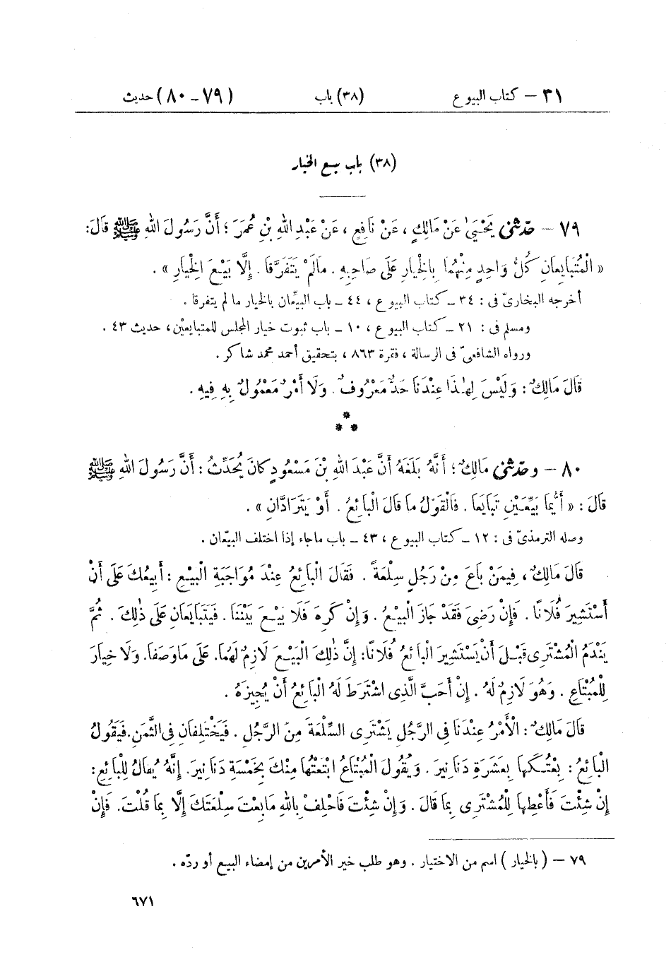 ٧٩ - حَدَّثَنِي يَحْيَى، عَنْ مَالِكٍ عَنْ نَافِعٍ، عَنْ عَبْدِ اللَّهِ بْنِ عُمَرَ أَنَّ رَسُولَ اللَّهِ صَلَّى اللهُ عَلَيْهِ وَسَلَّمَ قَالَ: «الْمُتَبَايِعَانِ كُلُّ وَاحِدٍ مِنْهُمَا بِالْخِيَارِ عَلَى صَاحِبِهِ، مَا لَمْ يَتَفَرَّقَا إِلَّا بَيْعَ الْخِيَارِ» قَالَ مَالِكٌ: «وَلَيْسَ لِهَذَا عِنْدَنَا حَدٌّ مَعْرُوفٌ، وَلَا أَمْرٌ مَعْمُولٌ بِهِ فِيهِ»