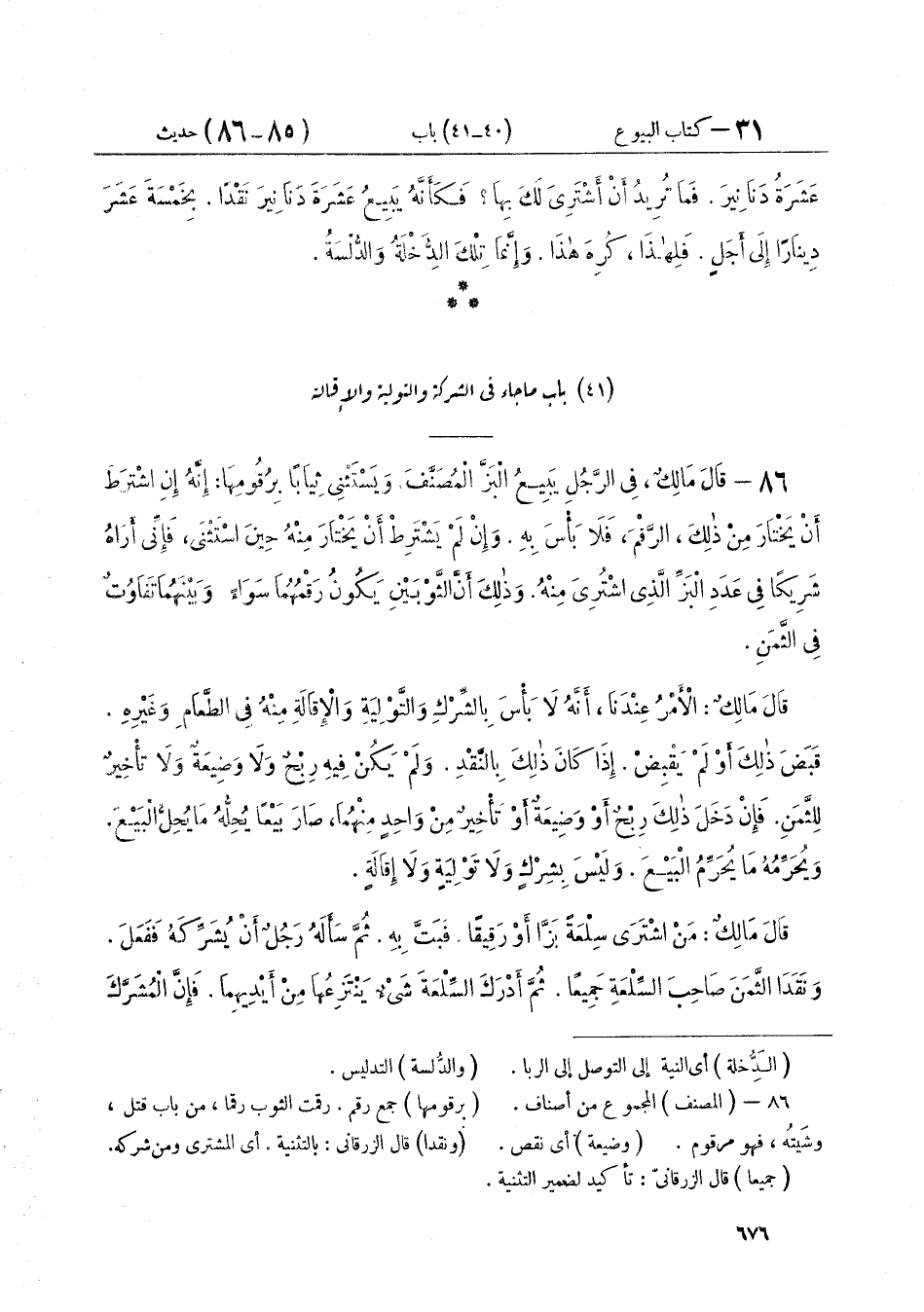 ٨٦ - قَالَ مَالِكٌ: فِي الرَّجُلِ يَبِيعُ الْبَزَّ الْمُصَنَّفَ، وَيَسْتَثْنِي ثِيَابًا بِرُقُومِهَا، إِنَّهُ إِنِ اشْتَرَطَ أَنْ يَخْتَارَ مِنْ ذَلِكَ الرَّقْمَ، فَلَا بَأْسَ بِهِ، وَإِنْ لَمْ يَشْتَرِطْ أَنْ يَخْتَارَ مِنْهُ حِينَ اسْتَثْنَى، فَإِنِّي أَرَاهُ شَرِيكًا فِي عَدَدِ الْبَزِّ الَّذِي اشْتُرِيَ مِنْهُ، وَذَلِكَ أَنَّ الثَّوْبَيْنِ يَكُونُ رَقْمُهُمَا سَوَاءً وَبَيْنَهُمَا تَفَاوُتٌ فِي الثَّمَنِ " قَالَ مَالِكٌ: «الْأَمْرُ عِنْدَنَا أَنَّهُ لَا بَأْسَ بِالشِّرْكِ وَالتَّوْلِيَةِ وَالْإِقَالَةِ مِنْهُ فِي الطَّعَامِ وَغَيْرِهِ، قَبَضَ ذَلِكَ أَوْ لَمْ يَقْبِضْ، إِذَا كَانَ ذَلِكَ بِالنَّقْدِ، وَلَمْ يَكُنْ فِيهِ رِبْحٌ، وَلَا وَضِيعَةٌ، وَلَا تَأْخِيرٌ لِلثَّمَنِ، فَإِنْ دَخَلَ ذَلِكَ رِبْحٌ أَوْ وَضِيعَةٌ أَوْ تَأْخِيرٌ مِنْ وَاحِدٍ مِنْهُمَا، صَارَ بَيْعًا يُحِلُّهُ مَا يُحِلُّ الْبَيْعَ، وَيُحَرِّمُهُ مَا يُحَرِّمُ الْبَيْعَ، وَلَيْسَ بِشِرْكٍ وَلَا تَوْلِيَةٍ وَلَا إِقَالَةٍ» قَالَ مَالِكٌ: مَنِ اشْتَرَى سِلْعَةً بَزًّا أَوْ رَقِيقًا، فَبَتَّ بِهِ، ثُمَّ سَأَلَهُ رَجُلٌ أَنْ يُشَرِّكَهُ فَفَعَلَ، وَنَقَدَا الثَّمَنَ صَاحِبَ السِّلْعَةِ جَمِيعًا، ثُمَّ أَدْرَكَ السِّلْعَةَ شَيْءٌ يَنْتَزِعُهَا مِنْ أَيْدِيهِمَا، فَإِنَّ الْمُشَرَّكَ ⦗٦٧٧⦘ يَأْخُذُ مِنِ الَّذِي أَشْرَكَهُ الثَّمَنَ، وَيَطْلُبُ الَّذِي أَشْرَكَ بَيِّعَهُ الَّذِي بَاعَهُ السِّلْعَةَ بِالثَّمَنِ كُلِّهِ، إِلَّا أَنْ يَشْتَرِطَ الْمُشَرِّكُ عَلَى الَّذِي أَشْرَكَ بِحَضْرَةِ الْبَيْعِ، وَعِنْدَ مُبَايَعَةِ الْبَائِعِ الْأَوَّلِ، وَقَبْلَ أَنْ يَتَفَاوَتَ ذَلِكَ أَنَّ عُهْدَتَكَ عَلَى الَّذِي ابْتَعْتُ مِنْهُ، وَإِنْ تَفَاوَتَ ذَلِكَ، وَفَاتَ الْبَائِعَ الْأَوَّلَ فَشَرْطُ الْآخَرِ بَاطِلٌ وَعَلَيْهِ الْعُهْدَةُ " قَالَ مَالِكٌ: " فِي الرَّجُلِ يَقُولُ لِلرَّجُلِ: اشْتَرِ هَذِهِ السِّلْعَةَ بَيْنِي وَبَيْنَكَ، وَانْقُدْ عَنِّي وَأَنَا أَبِيعُهَا لَكَ: إِنَّ ذَلِكَ لَا يَصْلُحُ. حِينَ قَالَ: انْقُدْ عَنِّي وَأَنَا أَبِيعُهَا لَكَ. وَإِنَّمَا ذَلِكَ سَلَفٌ يُسْلِفُهُ إِيَّاهُ، عَلَى أَنْ يَبِيعَهَا لَهُ. وَلَوْ أَنَّ تِلْكَ السِّلْعَةَ هَلَكَتْ. أَوْ فَاتَتْ. أَخَذَ ذَلِكَ الرَّجُلُ الَّذِي نَقَدَ الثَّمَنَ. مِنْ شَرِيكِهِ مَا نَقَدَ عَنْهُ فَهَذَا مِنَ السَّلَفِ الَّذِي يَجُرُّ مَنْفَعَةً " قَالَ مَالِكٌ: " وَلَوْ أَنَّ رَجُلًا ابْتَاعَ سِلْعَةً، فَوَجَبَتْ لَهُ، ثُمَّ قَالَ لَهُ رَجُلٌ: أَشْرِكْنِي بِنِصْفِ هَذِهِ السِّلْعَةِ، وَأَنَا أَبِيعُهَا لَكَ جَمِيعًا، كَانَ ذَلِكَ حَلَالًا لَا بَأْسَ بِهِ، وَتَفْسِيرُ ذَلِكَ أَنَّ هَذَا بَيْعٌ جَدِيدٌ. بَاعَهُ نِصْفَ السِّلْعَةِ، عَلَى أَنْ يَبِيعَ لَهُ النِّصْفَ الْآخَرَ "