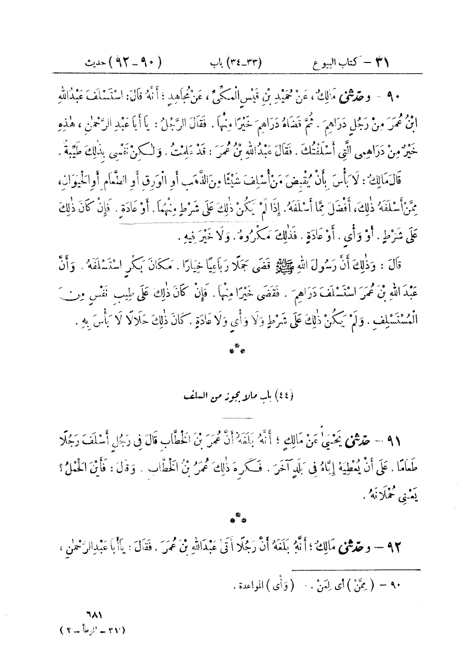 ٩٢ - وَحَدَّثَنِي عَنْ مَالِكٍ أَنَّهُ بَلَغَهُ أَنَّ رَجُلًا أَتَى عَبْدَ اللَّهِ بْنَ عُمَرَ فَقَالَ: يَا أَبَا عَبْدِ الرَّحْمَنِ: ⦗٦٨٢⦘ إِنِّي أَسْلَفْتُ رَجُلًا سَلَفًا، وَاشْتَرَطْتُ عَلَيْهِ أَفْضَلَ مِمَّا أَسْلَفْتُهُ، فَقَالَ عَبْدُ اللَّهِ بْنُ عُمَرَ: «فَذَلِكَ الرِّبَا»، قَالَ: فَكَيْفَ تَأْمُرُنِي يَا أَبَا عَبْدِ الرَّحْمَنِ؟ فَقَالَ عَبْدُ اللَّهِ: " السَّلَفُ عَلَى ثَلَاثَةِ وُجُوهٍ: سَلَفٌ تُسْلِفُهُ تُرِيدُ بِهِ وَجْهَ اللَّهِ، فَلَكَ وَجْهُ اللَّهِ، وَسَلَفٌ تُسْلِفُهُ تُرِيدُ بِهِ وَجْهَ صَاحِبِكَ، فَلَكَ وَجْهُ صَاحِبِكَ، وَسَلَفٌ تُسْلِفُهُ لِتَأْخُذَ خَبِيثًا بِطَيِّبٍ، فَذَلِكَ الرِّبَا "، قَالَ: فَكَيْفَ تَأْمُرُنِي يَا أَبَا عَبْدِ الرَّحْمَنِ؟ قَالَ: «أَرَى أَنْ تَشُقَّ الصَّحِيفَةَ، فَإِنْ أَعْطَاكَ مِثْلَ الَّذِي أَسْلَفْتَهُ قَبِلْتَهُ، وَإِنْ أَعْطَاكَ دُونَ الَّذِي أَسْلَفْتَهُ فَأَخَذْتَهُ أُجِرْتَ، وَإِنْ أَعْطَاكَ أَفْضَلَ مِمَّا أَسْلَفْتَهُ طَيِّبَةً بِهِ نَفْسُهُ، فَذَلِكَ شُكْرٌ شَكَرَهُ لَكَ وَلَكَ أَجْرُ مَا أَنْظَرْتَهُ»