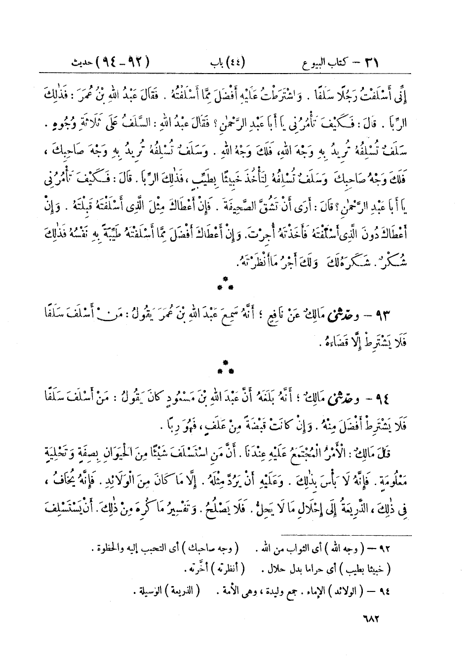 ٩٤ - وَحَدَّثَنِي مَالِكٍ أَنَّهُ بَلَغَهُ، أَنَّ عَبْدَ اللَّهِ بْنَ مَسْعُودٍ كَانَ يَقُولُ: «مَنْ أَسْلَفَ سَلَفًا فَلَا يَشْتَرِطْ أَفْضَلَ مِنْهُ، وَإِنْ كَانَتْ قَبْضَةً مِنْ عَلَفٍ فَهُوَ رِبًا» قَالَ مَالِكٌ الْأَمْرُ الْمُجْتَمَعُ عَلَيْهِ عِنْدَنَا أَنَّ مَنِ اسْتَسْلَفَ شَيْئًا مِنَ الْحَيَوَانِ بِصِفَةٍ وَتَحْلِيَةٍ مَعْلُومَةٍ فَإِنَّهُ لَا بَأْسَ بِذَلِكَ وَعَلَيْهِ أَنْ يَرُدَّ مِثْلَهُ إِلَّا مَا كَانَ مِنَ الْوَلَائِدِ فَإِنَّهُ يُخَافُ فِي ذَلِكَ الذَّرِيعَةُ إِلَى إِحْلَالِ مَا لَا يَحِلُّ فَلَا يَصْلُحُ وَتَفْسِيرُ مَا كُرِهَ مِنْ ذَلِكَ أَنْ يَسْتَسْلِفَ ⦗٦٨٣⦘ الرَّجُلُ الْجَارِيَةَ فَيُصِيبُهَا مَا بَدَا لَهُ ثُمَّ يَرُدُّهَا إِلَى صَاحِبِهَا بِعَيْنِهَا فَذَلِكَ لَا يَصْلُحُ وَلَا يَحِلُّ وَلَمْ يَزَلْ أَهْلُ الْعِلْمِ يَنْهَوْنَ عَنْهُ وَلَا يُرَخِّصُونَ فِيهِ لِأَحَدٍ