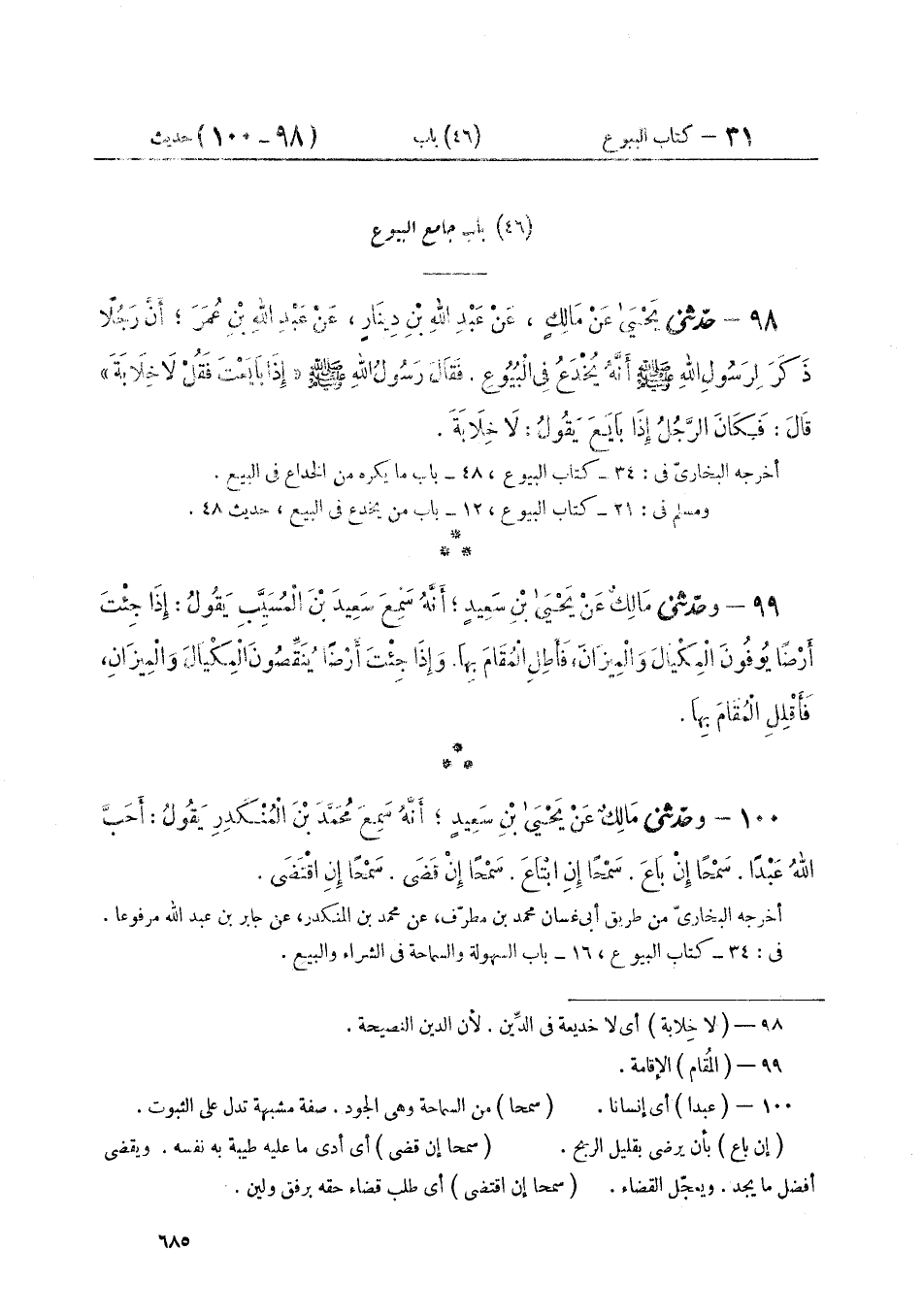 ٩٨ - حَدَّثَنِي يَحْيَى، عَنْ مَالِكٍ، عَنْ عَبْدِ اللَّهِ بْنِ دِينَارٍ، عَنْ عَبْدِ اللَّهِ بْنِ عُمَرَ أَنَّ رَجُلًا ذَكَرَ لِرَسُولِ اللَّهِ صَلَّى اللهُ عَلَيْهِ وَسَلَّمَ أَنَّهُ يُخْدَعُ فِي الْبُيُوعِ، فَقَالَ رَسُولُ اللَّهِ صَلَّى اللهُ عَلَيْهِ وَسَلَّمَ: " إِذَا بَايَعْتَ فَقُلْ: لَا خِلَابَةَ "، قَالَ: فَكَانَ الرَّجُلُ إِذَا بَايَعَ يَقُولُ لَا خِلَابَةَ