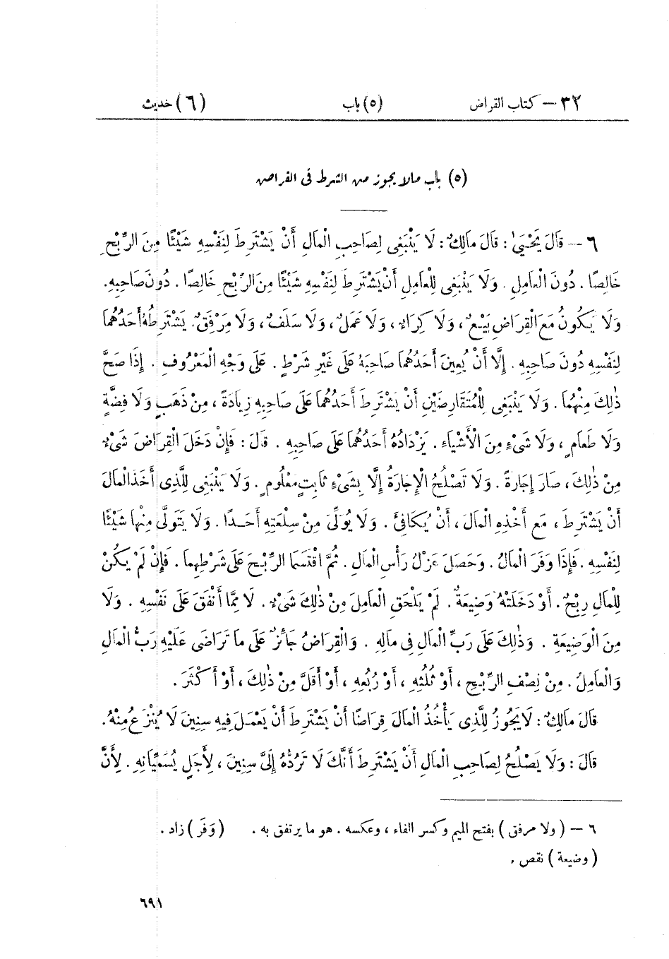 ٦ - قَالَ يَحْيَى: قَالَ مَالِكٌ: " لَا يَنْبَغِي لِصَاحِبِ الْمَالِ أَنْ يَشْتَرِطَ لِنَفْسِهِ شَيْئًا مِنَ الرِّبْحِ خَالِصًا. دُونَ الْعَامِلِ. وَلَا يَنْبَغِي لِلْعَامِلِ أَنْ يَشْتَرِطَ لِنَفْسِهِ شَيْئًا مِنَ الرِّبْحِ خَالِصًا. دُونَ صَاحِبِهِ. وَلَا يَكُونُ مَعَ الْقِرَاضِ بَيْعٌ، وَلَا كِرَاءٌ، وَلَا عَمَلٌ، وَلَا سَلَفٌ، وَلَا مِرْفَقٌ يَشْتَرِطُهُ أَحَدُهُمَا لِنَفْسِهِ دُونَ صَاحِبِهِ. إِلَّا أَنْ يُعِينَ أَحَدُهُمَا صَاحِبَهُ عَلَى غَيْرِ شَرْطٍ. عَلَى وَجْهِ الْمَعْرُوفِ. إِذَا صَحَّ ذَلِكَ مِنْهُمَا. وَلَا يَنْبَغِي لِلْمُتَقَارِضَيْنِ أَنْ يَشْتَرِطَ أَحَدُهُمَا عَلَى صَاحِبِهِ زِيَادَةً، مِنْ ذَهَبٍ وَلَا فِضَّةٍ وَلَا طَعَامٍ، وَلَا شَيْءٍ مِنَ الْأَشْيَاءِ. يَزْدَادُهُ أَحَدُهُمَا عَلَى صَاحِبِهِ. قَالَ: فَإِنْ دَخَلَ الْقِرَاضَ شَيْءٌ مِنْ ذَلِكَ، صَارَ إِجَارَةً، وَلَا تَصْلُحُ الْإِجَارَةُ إِلَّا بِشَيْءٍ ثَابِتٍ مَعْلُومٍ، وَلَا يَنْبَغِي لِلَّذِي أَخَذَ الْمَالَ أَنْ يَشْتَرِطَ، مَعَ أَخْذِهِ الْمَالَ، أَنْ يُكَافِئَ. وَلَا يُوَلِّيَ مِنْ سِلْعَتِهِ أَحَدًا، وَلَا يَتَوَلَّى مِنْهَا شَيْئًا لِنَفْسِهِ، فَإِذَا وَفَرَ الْمَالُ. وَحَصَلَ عَزْلُ رَأْسِ الْمَالِ، ثُمَّ اقْتَسَمَا الرِّبْحَ عَلَى شَرْطِهِمَا. فَإِنْ لَمْ يَكُنْ لِلْمَالِ رِبْحٌ. أَوْ دَخَلَتْهُ وَضِيعَةٌ. لَمْ يَلْحَقِ الْعَامِلَ مِنْ ذَلِكَ شَيْءٌ. لَا مِمَّا أَنْفَقَ عَلَى نَفْسِهِ. وَلَا مِنَ الْوَضِيعَةِ، وَذَلِكَ عَلَى رَبِّ الْمَالِ فِي مَالِهِ، وَالْقِرَاضُ جَائِزٌ عَلَى مَا تَرَاضَى عَلَيْهِ رَبُّ الْمَالِ، وَالْعَامِلُ مِنْ نِصْفِ الرِّبْحِ أَوْ ثُلُثِهِ أَوْ رُبُعِهِ أَوْ أَقَلَّ مِنْ ذَلِكَ أَوْ أَكْثَرَ " قَالَ مَالِكٌ: «لَا يَجُوزُ لِلَّذِي يَأْخُذُ الْمَالَ قِرَاضًا أَنْ يَشْتَرِطَ أَنْ يَعْمَلَ فِيهِ سِنِينَ لَا يُنْزَعُ مِنْهُ». قَالَ: «وَلَا يَصْلُحُ لِصَاحِبِ الْمَالِ أَنْ يَشْتَرِطَ أَنَّكَ لَا تَرُدُّهُ إِلَيَّ سِنِينَ، لِأَجَلٍ يُسَمِّيَانِهِ. لِأَنَّ ⦗٦٩٢⦘ الْقِرَاضَ لَا يَكُونُ إِلَى أَجَلٍ. وَلَكِنْ يَدْفَعُ رَبُّ الْمَالِ مَالَهُ إِلَى الَّذِي يَعْمَلُ لَهُ فِيهِ، فَإِنْ بَدَا لِأَحَدِهِمَا أَنْ يَتْرُكَ ذَلِكَ. وَالْمَالُ نَاضٌّ لَمْ يَشْتَرِ بِهِ شَيْئًا، تَرَكَهُ. وَأَخَذَ صَاحِبُ الْمَالِ مَالَهُ، وَإِنْ بَدَا لِرَبِّ الْمَالِ أَنْ يَقْبِضَهُ، بَعْدَ أَنْ يَشْتَرِيَ بِهِ سِلْعَةً. فَلَيْسَ ذَلِكَ لَهُ، حَتَّى يُبَاعَ الْمَتَاعُ، وَيَصِيرَ عَيْنًا، فَإِنْ بَدَا لِلْعَامِلِ أَنْ يَرُدَّهُ، وَهُوَ عَرْضٌ، لَمْ يَكُنْ ذَلِكَ لَهُ. حَتَّى يَبِيعَهُ، فَيَرُدَّهُ عَيْنًا كَمَا أَخَذَهُ» قَالَ مَالِكٌ: «وَلَا يَصْلُحُ لِمَنْ دَفَعَ إِلَى رَجُلٍ مَالًا قِرَاضًا، أَنْ يَشْتَرِطَ عَلَيْهِ الزَّكَاةَ فِي حِصَّتِهِ مِنَ الرِّبْحِ خَاصَّةً، لِأَنَّ رَبَّ الْمَالِ، إِذَا اشْتَرَطَ ذَلِكَ، فَقَدِ اشْتَرَطَ لِنَفْسِهِ، فَضْلًا مِنَ الرِّبْحِ ثَابِتًا. فِيمَا سَقَطَ عَنْهُ مِنْ حِصَّةِ الزَّكَاةِ. الَّتِي تُصِيبُهُ مِنْ حِصَّتِهِ. وَلَا يَجُوزُ لِرَجُلٍ أَنْ يَشْتَرِطَ عَلَى مَنْ قَارَضَهُ، أَنْ لَا يَشْتَرِيَ إِلَّا مِنْ فُلَانٍ. لِرَجُلٍ يُسَمِّيهِ. فَذَلِكَ غَيْرُ جَائِزٍ. لِأَنَّهُ يَصِيرُ لَهُ أَجِيرًا بِأَجْرٍ لَيْسَ بِمَعْرُوفٍ» قَالَ مَالِكٌ: " فِي الرَّجُلِ يَدْفَعُ إِلَى رَجُلٍ مَالًا قِرَاضًا. وَيَشْتَرِطُ عَلَى الَّذِي دَفَعَ إِلَيْهِ الْمَالَ الضَّمَانَ، قَالَ: لَا يَجُوزُ لِصَاحِبِ الْمَالِ أَنْ يَشْتَرِطَ فِي مَالِهِ غَيْرَ مَا وُضِعَ الْقِرَاضُ عَلَيْهِ، وَمَا مَضَى مِنْ سُنَّةِ الْمُسْلِمِينَ فِيهِ، فَإِنْ نَمَا الْمَالُ عَلَى شَرْطِ الضَّمَانِ. كَان