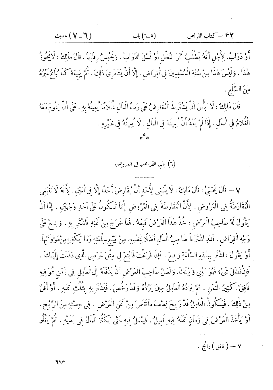 ٧ - قَالَ يَحْيَى: قَالَ مَالِكٌ: " لَا يَنْبَغِي لِأَحَدٍ أَنْ يُقَارِضَ أَحَدًا إِلَّا فِي الْعَيْنِ لِأَنَّهُ لَا تَنْبَغِي الْمُقَارَضَةُ فِي الْعُرُوضِ، لِأَنَّ الْمُقَارَضَةَ فِي الْعُرُوضِ إِنَّمَا تَكُونُ عَلَى أَحَدِ وَجْهَيْنِ، إِمَّا أَنْ يَقُولَ لَهُ صَاحِبُ الْعَرْضِ، خُذْ هَذَا الْعَرْضَ فَبِعْهُ. فَمَا خَرَجَ مِنْ ثَمَنِهِ فَاشْتَرِ بِهِ. وَبِعْ عَلَى وَجْهِ الْقِرَاضِ. فَقَدِ اشْتَرَطَ صَاحِبُ الْمَالِ فَضْلًا لِنَفْسِهِ مِنْ بَيْعِ سِلْعَتِهِ، وَمَا يَكْفِيهِ مِنْ مَئُونَتِهَا أَوْ يَقُولَ: اشْتَرِ بِهَذِهِ السِّلْعَةِ وَبِعْ. فَإِذَا فَرَغْتَ فَابْتَعْ لِي مِثْلَ عَرْضِي الَّذِي دَفَعْتُ إِلَيْكَ. فَإِنْ فَضَلَ شَيْءٌ فَهُوَ بَيْنِي وَبَيْنَكَ. وَلَعَلَّ صَاحِبَ الْعَرْضِ أَنْ يَدْفَعَهُ إِلَى الْعَامِلِ فِي زَمَنٍ هُوَ فِيهِ نَافِقٌ. كَثِيرُ الثَّمَنِ. ثُمَّ يَرُدَّهُ الْعَامِلُ حِينَ يَرُدُّهُ وَقَدْ رَخُصَ. فَيَشْتَرِيَهُ بِثُلُثِ ثَمَنِهِ. أَوْ أَقَلَّ مِنْ ذَلِكَ. فَيَكُونُ الْعَامِلُ قَدْ رَبِحَ نِصْفَ مَا نَقَصَ مِنْ ثَمَنِ الْعَرْضِ. فِي حِصَّتِهِ مِنَ الرِّبْحِ. أَوْ يَأْخُذَ الْعَرْضَ فِي زَمَانٍ ثَمَنُهُ فِيهِ قَلِيلٌ. فَيَعْمَلُ فِيهِ حَتَّى يَكْثُرَ الْمَالُ فِي يَدَيْهِ. ثُمَّ يَغْلُو ⦗٦٩٤⦘ ذَلِكَ الْعَرْضُ وَيَرْتَفِعُ ثَمَنُهُ حِينَ يَرُدُّهُ. فَيَشْتَرِيهِ بِكُلِّ مَا فِي يَدَيْهِ. فَيَذْهَبُ عَمَلُهُ وَعِلَاجُهُ بَاطِلًا، فَهَذَا غَرَرٌ لَا يَصْلُحُ. فَإِنْ جُهِلَ ذَلِكَ. حَتَّى يَمْضِيَ نُظِرَ إِلَى قَدْرِ أَجْرِ الَّذِي دُفِعَ إِلَيْهِ الْقِرَاضُ، فِي بَيْعِهِ إِيَّاهُ، وَعِلَاجِهِ فَيُعْطَاهُ. ثُمَّ يَكُونُ الْمَالُ قِرَاضًا مِنْ يَوْمَ نَضَّ الْمَالُ. وَاجْتَمَعَ عَيْنًا. وَيُرَدُّ إِلَى قِرَاضٍ مِثْلِهِ "