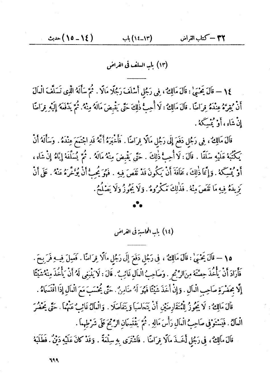١٤ - قَالَ يَحْيَى: قَالَ مَالِكٌ: فِي رَجُلٍ أَسْلَفَ رَجُلًا مَالًا، ثُمَّ سَأَلَهُ الَّذِي تَسَلَّفَ الْمَالَ أَنْ يُقِرَّهُ عِنْدَهُ قِرَاضًا قَالَ مَالِكٌ: «لَا أُحِبُّ ذَلِكَ حَتَّى يَقْبِضَ مَالَهُ مِنْهُ، ثُمَّ يَدْفَعَهُ إِلَيْهِ قِرَاضًا إِنْ شَاءَ أَوْ يُمْسِكَهُ» قَالَ مَالِكٌ: فِي رَجُلٍ دَفَعَ إِلَى رَجُلٍ مَالًا قِرَاضًا. فَأَخْبَرَهُ أَنَّهُ قَدِ اجْتَمَعَ عِنْدَهُ. وَسَأَلَهُ أَنْ يَكْتُبَهُ عَلَيْهِ سَلَفًا. قَالَ: لَا أُحِبُّ ذَلِكَ. حَتَّى يَقْبِضَ مِنْهُ مَالَهُ، ثُمَّ يُسَلِّفَهُ إِيَّاهُ إِنْ شَاءَ، أَوْ يُمْسِكَهُ. وَإِنَّمَا ذَلِكَ مَخَافَةَ أَنْ يَكُونَ قَدْ نَقَصَ فِيهِ، فَهُوَ يُحِبُّ أَنْ يُؤَخِّرَهُ عَنْهُ. عَلَى أَنْ يَزِيدَهُ فِيهِ مَا نَقَصَ مِنْهُ، فَذَلِكَ مَكْرُوهٌ وَلَا يَجُوزُ وَلَا يَصْلُحُ "