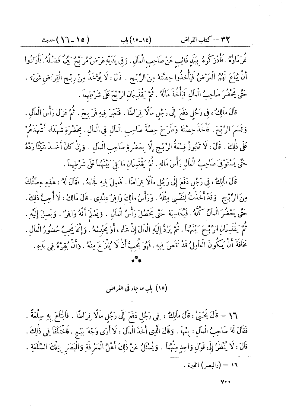 ١٦ - قَالَ يَحْيَى: قَالَ مَالِكٌ: فِي رَجُلٍ دَفَعَ إِلَى رَجُلٍ مَالًا قِرَاضًا فَابْتَاعَ بِهِ سِلْعَةً، فَقَالَ لَهُ صَاحِبُ الْمَالِ: بِعْهَا، وَقَالَ الَّذِي أَخَذَ الْمَالَ: لَا أَرَى وَجْهَ بَيْعٍ، فَاخْتَلَفَا فِي ذَلِكَ، قَالَ: «لَا يُنْظَرُ إِلَى قَوْلِ وَاحِدٍ مِنْهُمَا، وَيُسْأَلُ عَنْ ذَلِكَ أَهْلُ الْمَعْرِفَةِ وَالْبَصَرِ بِتِلْكَ السِّلْعَةِ، ⦗٧٠١⦘ فَإِنْ رَأَوْا وَجْهَ بَيْعٍ بِيعَتْ عَلَيْهِمَا، وَإِنْ رَأَوْا وَجْهَ انْتِظَارٍ انْتُظِرَ بِهَا» قَالَ مَالِكٌ: فِي رَجُلٍ أَخَذَ مِنْ رَجُلٍ مَالًا قِرَاضًا فَعَمِلَ فِيهِ، ثُمَّ سَأَلَهُ صَاحِبُ الْمَالِ عَنْ مَالِهِ، فَقَالَ: هُوَ عِنْدِي وَافِرٌ، فَلَمَّا آخَذَهُ بِهِ، قَالَ: قَدْ هَلَكَ عِنْدِي مِنْهُ كَذَا وَكَذَا لِمَالٍ يُسَمِّيهِ، وَإِنَّمَا قُلْتُ لَكَ ذَلِكَ لِكَيْ تَتْرُكَهُ عِنْدِي، قَالَ: لَا يَنْتَفِعُ بِإِنْكَارِهِ بَعْدَ إِقْرَارِهِ أَنَّهُ عِنْدَهُ، وَيُؤْخَذُ بِإِقْرَارِهِ عَلَى نَفْسِهِ، إِلَّا أَنْ يَأْتِيَ فِي هَلَاكِ ذَلِكَ الْمَالِ بِأَمْرٍ يُعْرَفُ بِهِ قَوْلُهُ، فَإِنْ لَمْ يَأْتِ بِأَمْرٍ مَعْرُوفٍ أُخِذَ بِإِقْرَارِهِ، وَلَمْ يَنْفَعْهُ إِنْكَارُهُ " قَالَ مَالِكٌ: وَكَذَلِكَ أَيْضًا لَوْ قَالَ: رَبِحْتُ فِي الْمَالِ كَذَا وَكَذَا، فَسَأَلَهُ رَبُّ الْمَالِ: أَنْ يَدْفَعَ إِلَيْهِ مَالَهُ وَرِبْحَهُ، فَقَالَ: مَا رَبِحْتُ فِيهِ شَيْئًا؟ وَمَا قُلْتُ ذَلِكَ إِلَّا لِأَنْ تُقِرَّهُ فِي يَدِي، فَذَلِكَ لَا يَنْفَعُهُ، وَيُؤْخَذُ بِمَا أَقَرَّ بِهِ، إِلَّا أَنْ يَأْتِيَ بِأَمْرٍ يُعْرَفُ بِهِ قَوْلُهُ وَصِدْقُهُ، فَلَا يَلْزَمُهُ ذَلِكَ " قَالَ مَالِكٌ: فِي رَجُلٍ دَفَعَ إِلَى رَجُلٍ مَالًا قِرَاضًا فَرَبِحَ فِيهِ رِبْحًا، فَقَالَ الْعَامِلُ: قَارَضْتُكَ عَلَى أَنَّ لِي الثُّلُثَيْنِ، وَقَالَ صَاحِبُ الْمَالِ: قَارَضْتُكَ عَلَى أَنَّ لَكَ الثُّلُثَ، قَالَ مَالِكٌ: «الْقَوْلُ قَوْلُ الْعَامِلِ، وَعَلَيْهِ فِي ذَلِكَ، الْيَمِينُ. إِذَا كَانَ مَا قَالَ يُشْبِهُ قِرَاضَ مِثْلِهِ. وَكَانَ ذَلِكَ نَحْوًا مِمَّا يَتَقَارَضُ عَلَيْهِ النَّاسُ. وَإِنْ جَاءَ بِأَمْرٍ يُسْتَنْكَرُ، لَيْسَ عَلَى مِثْلِهِ يَتَقَارَضُ النَّاسُ، لَمْ يُصَدَّقْ وَرُدَّ إِلَى قِرَاضِ مِثْلِهِ» قَالَ مَالِكٌ: فِي رَجُلٍ أَعْطَى رَجُلًا مِائَةَ دِينَارٍ قِرَاضًا فَاشْتَرَى بِهَا سِلْعَةً. ثُمَّ ذَهَبَ لِيَدْفَعَ إِلَى رَبِّ السِّلْعَةِ الْمِائَةَ دِينَارٍ. فَوَجَدَهَا قَدْ سُرِقَتْ. فَقَالَ رَبُّ الْمَالِ: بِعِ السِّلْعَةَ. فَإِنْ كَانَ فِيهَا فَضْلٌ كَانَ لِي، وَإِنْ كَانَ فِيهَا نُقْصَانٌ كَانَ عَلَيْكَ. لِأَنَّكَ أَنْتَ ضَيَّعْتَ. وَقَالَ الْمُقَارَضُ:⦗٧٠٢⦘ بَلْ عَلَيْكَ وَفَاءُ حَقِّ هَذَا، إِنَّمَا اشْتَرَيْتُهَا بِمَالِكَ الَّذِي أَعْطَيْتَنِي، قَالَ مَالِكٌ: " يَلْزَمُ الْعَامِلَ الْمُشْتَرِيَ أَدَاءُ ثَمَنِهَا إِلَى الْبَائِعِ، وَيُقَالُ لِصَاحِبِ الْمَالِ الْقِرَاضِ: إِنْ شِئْتَ فَأَدِّ الْمِائَةَ الدِّينَارِ إِلَى الْمُقَارَضِ، وَالسِّلْعَةُ بَيْنَكُمَا. وَتَكُونُ قِرَاضًا عَلَى مَا كَانَتْ عَلَيْهِ الْمِائَةُ الْأُولَى. وَإِنْ شِئْتَ فَابْرَأْ مِنَ السِّلْعَةِ، فَإِنْ دَفَعَ الْمِائَةَ دِينَارٍ إِلَى الْعَامِلِ كَانَتْ قِرَاضًا عَلَى سُنَّةِ الْقِرَاضِ الْأَوَّلِ. وَإِنْ أَبَى كَانَتِ السِّلْعَةُ لِلْعَامِلِ وَكَانَ عَلَيْهِ ثَمَنُهَا " قَالَ مَالِكٌ: فِي الْمُتَقَارِضَيْنِ إِذَا تَفَاصَلَا فَبَقِيَ بِيَدِ الْعَامِلِ مِنَ الْمَتَاعِ الَّذِي يَعْمَلُ فِيهِ خَلَقُ الْقِرْبَةِ أَوْ خَلَقُ الثَّوْبِ أَوْ مَا أَشْبَهَ ذَلِكَ. قَالَ مَالِكٌ: كُلُّ شَيْءٍ مِنْ ذَلِكَ كَانَ تَافِهًا، لَا خَطْبَ لَهُ، فَه