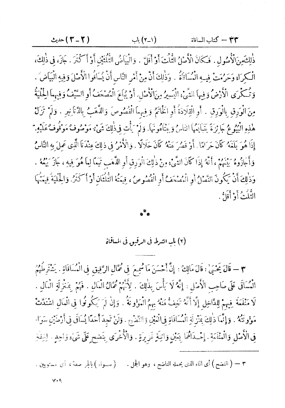 ٣ - قَالَ يَحْيَى: قَالَ مَالِكٌ: " إِنَّ أَحْسَنَ مَا سُمِعَ فِي عُمَّالِ الرَّقِيقِ فِي الْمُسَاقَاةِ. يَشْتَرِطُهُمُ الْمُسَاقَى عَلَى صَاحِبِ الْأَصْلِ: إِنَّهُ لَا بَأْسَ بِذَلِكَ. لِأَنَّهُمْ عُمَّالُ الْمَالِ. فَهُمْ بِمَنْزِلَةِ الْمَالِ. لَا مَنْفَعَةَ فِيهِمْ لِلدَّاخِلِ إِلَّا أَنَّهُ تَخِفُّ عَنْهُ بِهِمُ الْمَئُونَةُ، وَإِنْ لَمْ يَكُونُوا فِي الْمَالِ اشْتَدَّتْ مَئُونَتُهُ، وَإِنَّمَا ذَلِكَ بِمَنْزِلَةِ الْمُسَاقَاةِ فِي الْعَيْنِ وَالنَّضْحِ. وَلَنْ تَجِدَ أَحَدًا يُسَاقَى فِي أَرْضَيْنِ سَوَاءٍ فِي الْأَصْلِ وَالْمَنْفَعَةِ. إِحْدَاهُمَا بِعَيْنٍ وَاثِنَةٍ غَزِيرَةٍ. وَالْأُخْرَى بِنَضْحٍ عَلَى شَيْءٍ وَاحِدٍ، لِخِفَّةِ ⦗٧١٠⦘ مُؤْنَةِ الْعَيْنِ. وَشِدَّةِ مُؤْنَةِ النَّضْحِ، قَالَ: وَعَلَى ذَلِكَ، الْأَمْرُ عِنْدَنَا ". قَالَ: «وَالْوَاثِنَةُ الثَّابِتُ مَاؤُهَا الَّتِي لَا تَغُورُ وَلَا تَنْقَطِعُ» قَالَ مَالِكٌ: «وَلَيْسَ لِلْمُسَاقَى أَنْ يَعْمَلَ بِعُمَّالِ الْمَالِ فِي غَيْرِهِ، وَلَا أَنْ يَشْتَرِطَ ذَلِكَ عَلَى الَّذِي سَاقَاهُ» قَالَ مَالِكٌ: «وَلَا يَجُوزُ لِلَّذِي سَاقَى أَنْ يَشْتَرِطَ عَلَى رَبِّ الْمَالِ رَقِيقًا يَعْمَلُ بِهِمْ فِي الْحَائِطِ. لَيْسُوا فِيهِ حِينَ سَاقَاهُ إِيَّاهُ» قَالَ مَالِكٌ: «وَلَا يَنْبَغِي لِرَبِّ الْمَالِ أَنْ يَشْتَرِطَ عَلَى الَّذِي دَخَلَ فِي مَالِهِ بِمُسَاقَاةٍ، أَنْ يَأْخُذَ مِنْ رَقِيقِ الْمَالِ أَحَدًا يُخْرِجُهُ مِنَ الْمَالِ. وَإِنَّمَا مُسَاقَاةُ الْمَالِ عَلَى حَالِهِ الَّذِي هُوَ عَلَيْهِ» قَالَ: «فَإِنْ كَانَ صَاحِبُ الْمَالِ يُرِيدُ أَنْ يُخْرِجَ مِنْ رَقِيقِ الْمَالِ أَحَدًا، فَلْيُخْرِجْهُ قَبْلَ الْمُسَاقَاةِ. أَوْ يُرِيدُ أَنْ يُدْخِلَ فِيهِ أَحَدًا، فَلْيَفْعَلْ ذَلِكَ قَبْلَ الْمُسَاقَاةِ. ثُمَّ لِيُسَاقِي بَعْدَ ذَلِكَ إِنْ شَاءَ» قَالَ: «وَمَنْ مَاتَ مِنَ الرَّقِيقِ أَوْ غَابَ أَوْ مَرِضَ، فَعَلَى رَبِّ الْمَالِ أَنْ يُخْلِفَهُ»