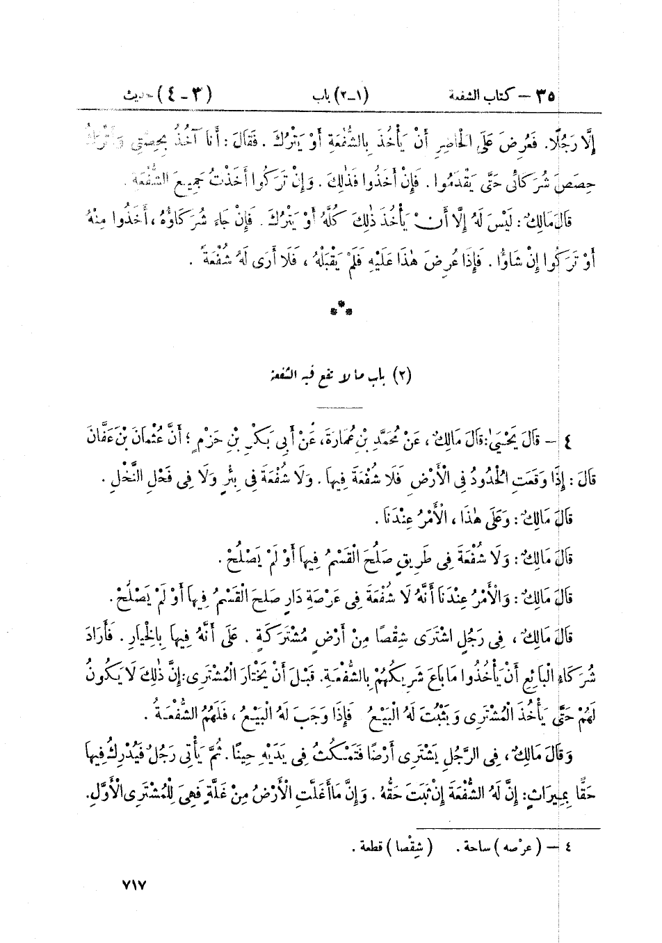 ٤ - قَالَ يَحْيَى: قَالَ مَالِكٌ عَنْ مُحَمَّدِ بْنِ عُمَارَةَ، عَنْ أَبِي بَكْرِ بْنِ حَزْمٍ، أَنَّ عُثْمَانَ بْنَ عَفَّانَ قَالَ: «إِذَا وَقَعَتِ الْحُدُودُ فِي الْأَرْضِ، فَلَا شُفْعَةَ فِيهَا، وَلَا شُفْعَةَ فِي بِئْرٍ وَلَا فِي فَحْلِ النَّخْلِ» قَالَ مَالِكٌ: «وَعَلَى هَذَا الْأَمْرُ عِنْدَنَا» قَالَ مَالِكٌ: «وَلَا شُفْعَةَ فِي طَرِيقٍ صَلُحَ الْقَسْمُ فِيهَا أَوْ لَمْ يَصْلُحْ» قَالَ مَالِكٌ: «وَالْأَمْرُ عِنْدَنَا أَنَّهُ لَا شُفْعَةَ فِي عَرْصَةِ دَارٍ صَلُحَ الْقَسْمُ فِيهَا أَوْ لَمْ يَصْلُحْ» قَالَ مَالِكٌ: «فِي رَجُلٍ اشْتَرَى شِقْصًا مِنْ أَرْضٍ مُشْتَرَكَةٍ، عَلَى أَنَّهُ فِيهَا بِالْخِيَارِ، فَأَرَادَ شُرَكَاءُ الْبَائِعِ أَنْ يَأْخُذُوا مَا بَاعَ شَرِيكُهُمْ بِالشُّفْعَةِ قَبْلَ أَنْ يَخْتَارَ الْمُشْتَرِي، إِنَّ ذَلِكَ لَا يَكُونُ لَهُمْ. حَتَّى يَأْخُذَ الْمُشْتَرِي، وَيَثْبُتَ لَهُ الْبَيْعُ. فَإِذَا وَجَبَ لَهُ الْبَيْعُ فَلَهُمُ الشُّفْعَةُ» وقَالَ مَالِكٌ: " فِي الرَّجُلِ يَشْتَرِي أَرْضًا فَتَمْكُثُ فِي يَدَيْهِ حِينًا. ثُمَّ يَأْتِي رَجُلٌ فَيُدْرِكُ فِيهَا حَقًّا بِمِيرَاثٍ: إِنَّ لَهُ الشُّفْعَةَ إِنْ ثَبَتَ حَقُّهُ. وَإِنَّ مَا أَغَلَّتِ الْأَرْضُ مِنْ غَلَّةٍ فَهِيَ لِلْمُشْتَرِي الْأَوَّلِ. ⦗٧١٨⦘ إِلَى يَوْمِ يَثْبُتُ حَقُّ الْآخَرِ. لِأَنَّهُ قَدْ كَانَ ضَمِنَهَا لَوْ هَلَكَ مَا كَانَ فِيهَا مِنْ غِرَاسٍ، أَوْ ذَهَبَ بِهِ سَيْلٌ " قَالَ: «فَإِنْ طَالَ الزَّمَانُ، أَوْ هَلَكَ الشُّهُودُ، أَوْ مَاتَ الْبَائِعُ أَوِ الْمُشْتَرِي، أَوْ هُمَا حَيَّانِ، فَنُسِيَ أَصْلُ الْبَيْعِ وَالِاشْتِرَاءِ لِطُولِ الزَّمَانِ، فَإِنَّ الشُّفْعَةَ تَنْقَطِعُ. وَيَأْخُذُ حَقَّهُ الَّذِي ثَبَتَ لَهُ، وَإِنْ كَانَ أَمْرُهُ عَلَى غَيْرِ هَذَا الْوَجْهِ فِي حَدَاثَةِ الْعَهْدِ وَقُرْبِهِ، وَأَنَّهُ يَرَى أَنَّ الْبَائِعَ غَيَّبَ الثَّمَنَ وَأَخْفَاهُ لِيَقْطَعَ بِذَلِكَ حَقَّ صَاحِبِ الشُّفْعَةِ، قُوِّمَتِ الْأَرْضُ عَلَى قَدْرِ مَا يُرَى أَنَّهُ ثَمَنُهَا. فَيَصِيرُ ثَمَنُهَا إِلَى ذَلِكَ. ثُمَّ يُنْظَرُ إِلَى مَا زَادَ فِي الْأَرْضِ مِنْ بِنَاءٍ أَوْ غِرَاسٍ أَوْ عِمَارَةٍ. فَيَكُونُ عَلَى مَا يَكُونُ عَلَيْهِ مَنِ ابْتَاعَ الْأَرْضَ بِثَمَنٍ مَعْلُومٍ ثُمَّ بَنَى فِيهَا وَغَرَسَ. ثُمَّ أَخَذَهَا صَاحِبُ الشُّفْعَةِ بَعْدَ ذَلِكَ» قَالَ مَالِكٌ: «وَالشُّفْعَةُ ثَابِتَةٌ فِي مَالِ الْمَيِّتِ كَمَا هِيَ فِي مَالِ الْحَيِّ. فَإِنْ خَشِيَ أَهْلُ الْمَيِّتِ أَنْ يَنْكَسِرَ مَالُ الْمَيِّتِ، قَسَمُوهُ ثُمَّ بَاعُوهُ فَلَيْسَ عَلَيْهِمْ فِيهِ شُفْعَةٌ» قَالَ مَالِكٌ: «وَلَا شُفْعَةَ عِنْدَنَا فِي عَبْدٍ وَلَا وَلِيدَةٍ. وَلَا بَعِيرٍ وَلَا بَقَرَةٍ وَلَا شَاةٍ. وَلَا فِي شَيْءٍ مِنَ الْحَيَوَانِ. وَلَا فِي ثَوْبٍ وَلَا فِي بِئْرٍ لَيْسَ لَهَا بَيَاضٌ. إِنَّمَا الشُّفْعَةُ فِيمَا يَصْلُحُ أَنَّهُ يَنْقَسِمُ وَتَقَعُ فِيهِ الْحُدُودُ مِنَ الْأَرْضِ. فَأَمَّا مَا لَا يَصْلُحُ فِيهِ الْقَسْمُ فَلَا شُفْعَةَ فِيهِ» قَالَ مَالِكٌ: «وَمَنِ اشْتَرَى أَرْضًا فِيهَا شُفْعَةٌ لِنَاسٍ حُضُورٍ، فَلْيَرْفَعْهُمْ إِلَى السُّلْطَانِ. فَإِمَّا أَنْ يَسْتَحِقُّوا، وَإِمَّا أَنْ يُسَلِّمَ لَهُ السُّلْطَانُ. فَإِنْ تَرَكَهُمْ فَلَمْ يَرْفَعْ أَمْرَهُمْ إِلَى السُّلْطَانِ. وَقَدْ عَلِمُوا بِاشْتِرَائِهِ. فَتَرَكُوا ذَلِكَ حَتَّى طَالَ زَمَانُهُ ثُمَّ جَاءُوا يَطْلُبُونَ شُفْعَتَهُمْ. فَلَا أَرَى ذَلِكَ لَهُمْ»