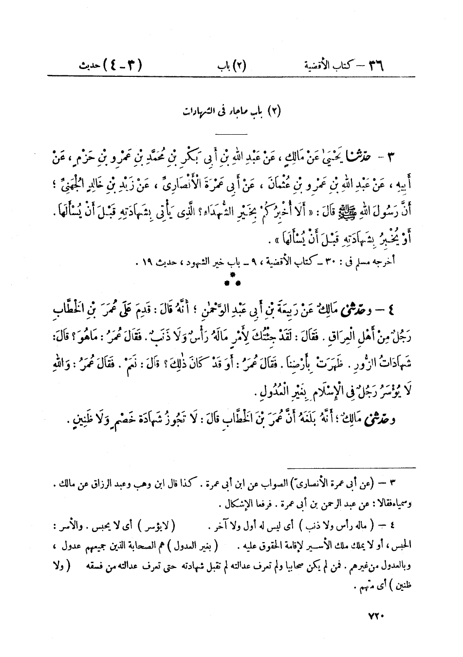 ٣ - حَدَّثَنَا يَحْيَى، عَنْ مَالِكٍ، عَنْ عَبْدِ اللَّهِ بْنِ أَبِي بَكْرِ بْنِ مُحَمَّدِ بْنِ عَمْرِو بْنِ حَزْمٍ، عَنْ أَبِيهِ، عَنْ عَبْدِ اللَّهِ بْنِ عَمْرِو بْنِ عُثْمَانَ، عَنْ أَبِي عَمْرَةَ الْأَنْصَارِيِّ، عَنْ زَيْدِ بْنِ خَالِدٍ الْجُهَنِيِّ أَنَّ رَسُولَ اللَّهِ صَلَّى اللهُ عَلَيْهِ وَسَلَّمَ قَالَ: «أَلَا أُخْبِرُكُمْ بِخَيْرِ الشُّهَدَاءِ. الَّذِي يَأْتِي بِشَهَادَتِهِ قَبْلَ أَنْ يُسْأَلَهَا، أَوْ يُخْبِرُ بِشَهَادَتِهِ قَبْلَ أَنْ يُسْأَلَهَا»