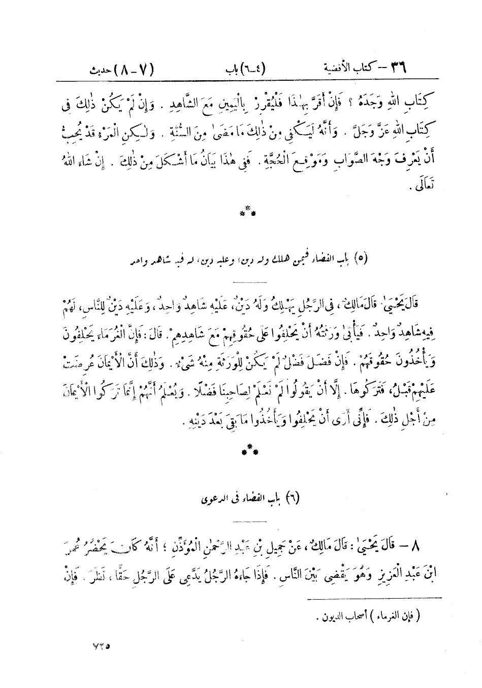 ٨ - قَالَ يَحْيَى: قَالَ مَالِكٌ، عَنْ جَمِيلِ بْنِ عَبْدِ الرَّحْمَنِ الْمُؤَذِّنِ، أَنَّهُ كَانَ يَحْضُرُ عُمَرَ بْنَ عَبْدِ الْعَزِيزِ وَهُوَ " يَقْضِي بَيْنَ النَّاسِ، فَإِذَا جَاءَهُ الرَّجُلُ يَدَّعِي عَلَى الرَّجُلِ حَقًّا: نَظَرَ، فَإِنْ ⦗٧٢٦⦘ كَانَتْ بَيْنَهُمَا مُخَالَطَةٌ أَوْ مُلَابَسَةٌ أَحْلَفَ الَّذِي ادُّعِيَ عَلَيْهِ. وَإِنْ لَمْ يَكُنْ شَيْءٌ مِنْ ذَلِكَ لَمْ يُحَلِّفْهُ " قَالَ مَالِكٌ: «وَعَلَى ذَلِكَ الْأَمْرُ عِنْدَنَا، أَنَّهُ مَنِ ادَّعَى عَلَى رَجُلٍ بِدَعْوَى، نُظِرَ فَإِنْ كَانَتْ بَيْنَهُمَا مُخَالَطَةٌ أَوْ مُلَابَسَةٌ أُحْلِفَ الْمُدَّعَى عَلَيْهِ. فَإِنْ حَلَفَ بَطَلَ ذَلِكَ الْحَقُّ عَنْهُ، وَإِنْ أَبَى أَنْ يَحْلِفَ، وَرَدَّ الْيَمِينَ عَلَى الْمُدَّعِي، فَحَلَفَ طَالِبُ الْحَقِّ، أَخَذَ حَقَّهُ»