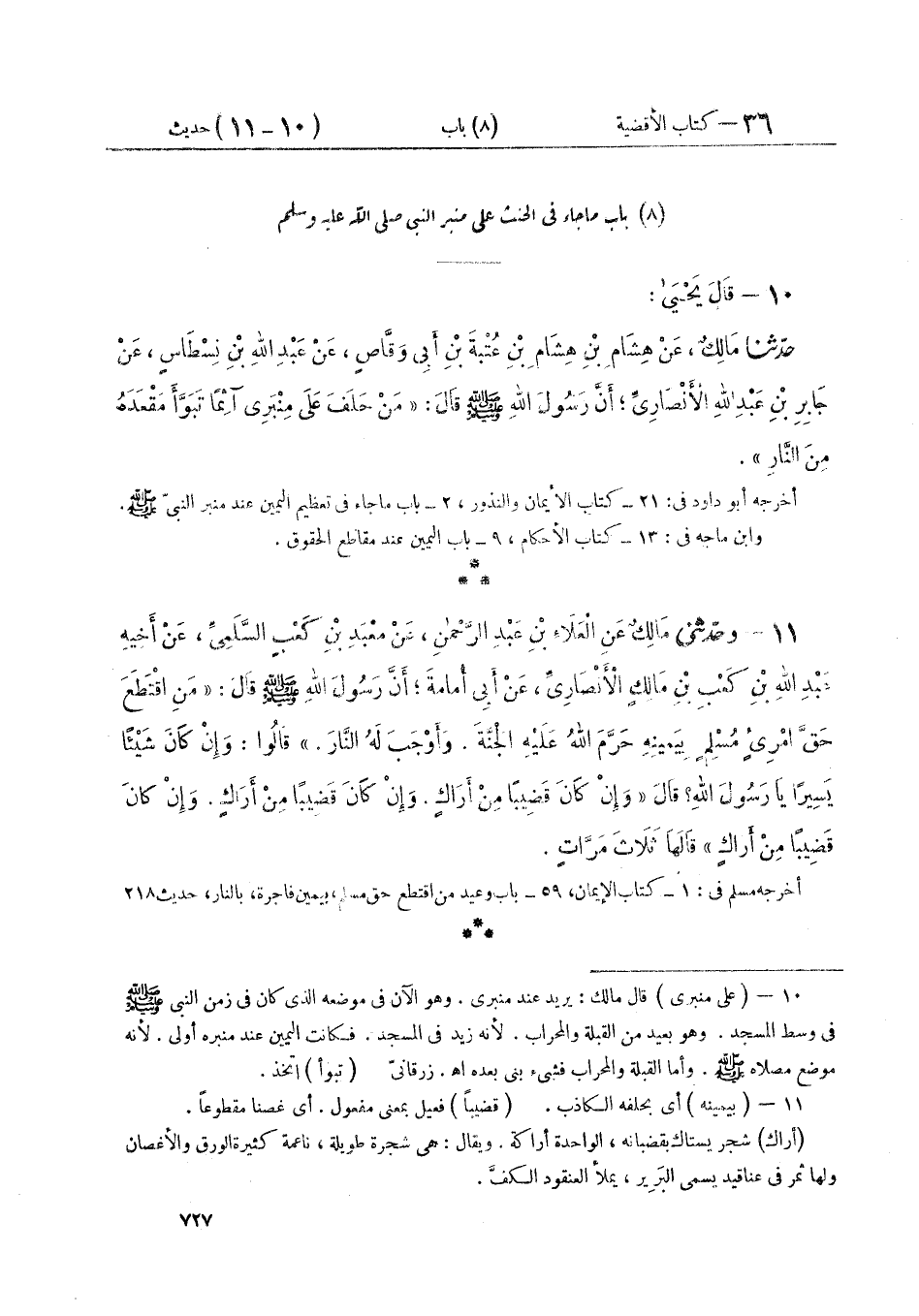 ١١ - وَحَدَّثَنِي مَالِكٌ، عَنِ الْعَلَاءِ بْنِ عَبْدِ الرَّحْمَنِ، عَنْ مَعْبَدِ بْنِ كَعْبٍ السَّلَمِيِّ، عَنْ أَخِيهِ عَبْدِ اللَّهِ بْنِ كَعْبِ بْنِ مَالِكٍ الْأَنْصَارِيِّ، عَنْ أَبِي أُمَامَةَ أَنَّ رَسُولَ اللَّهِ صَلَّى اللهُ عَلَيْهِ وَسَلَّمَ قَالَ: «مَنِ اقْتَطَعَ حَقَّ امْرِئٍ مُسْلِمٍ بِيَمِينِهِ، حَرَّمَ اللَّهُ عَلَيْهِ الْجَنَّةَ، وَأَوْجَبَ لَهُ النَّارَ»، قَالُوا: وَإِنْ كَانَ شَيْئًا يَسِيرًا يَا رَسُولَ اللَّهِ؟ قَالَ: «وَإِنْ كَانَ قَضِيبًا مِنْ أَرَاكٍ، وَإِنْ كَانَ قَضِيبًا مِنْ أَرَاكٍ، وَإِنْ كَانَ قَضِيبًا مِنْ أَرَاكٍ» قَالَهَا ثَلَاثَ مَرَّاتٍ