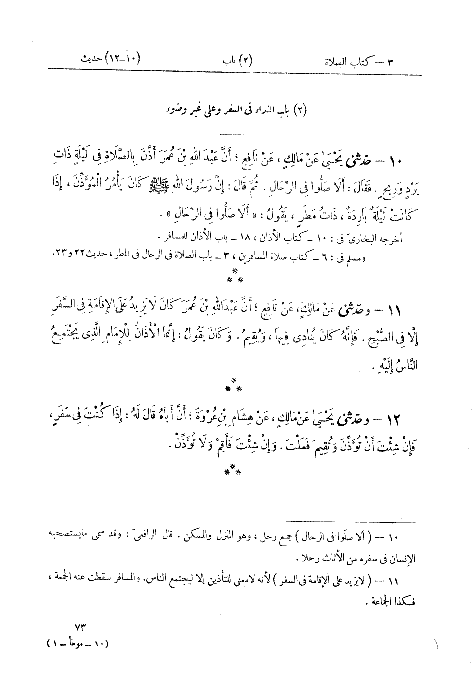 ١٠ - حَدَّثَنِي يَحْيَى، عَنْ مَالِكٍ عَنْ نَافِعٍ، أَنَّ عَبْدَ اللَّهِ بْنَ عُمَرَ أَذَّنَ بِالصَّلَاةِ فِي لَيْلَةٍ ذَاتِ بَرْدٍ وَرِيحٍ، فَقَالَ: أَلَا صَلُّوا فِي الرِّحَالِ، ثُمَّ قَالَ: إِنَّ رَسُولَ اللَّهِ صَلَّى اللهُ عَلَيْهِ وَسَلَّمَ كَانَ يَأْمُرُ الْمُؤَذِّنَ، إِذَا كَانَتْ لَيْلَةٌ بَارِدَةٌ ذَاتُ مَطَرٍ يَقُولُ: «أَلَا صَلُّوا فِي الرِّحَالِ»