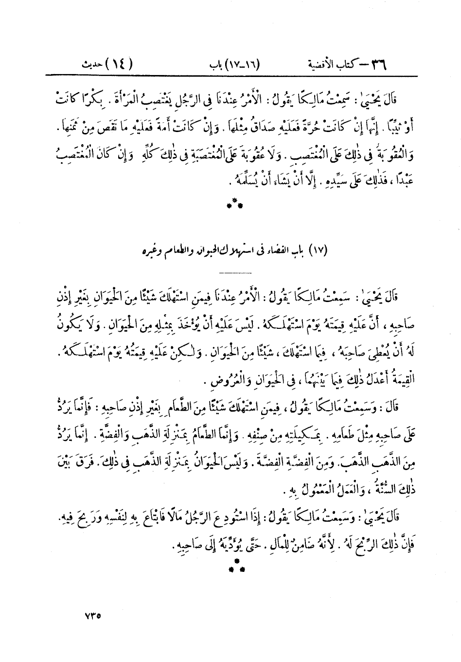 قَالَ يَحْيَى: سَمِعْتُ مَالِكًا يَقُولُ: «الْأَمْرُ عِنْدَنَا فِيمَنِ اسْتَهْلَكَ شَيْئًا مِنَ الْحَيَوَانِ بِغَيْرِ إِذْنِ صَاحِبِهِ، أَنَّ عَلَيْهِ قِيمَتَهُ يَوْمَ اسْتَهْلَكَهُ، لَيْسَ عَلَيْهِ أَنْ يُؤْخَذَ بِمِثْلِهِ مِنَ الْحَيَوَانِ، وَلَا يَكُونُ لَهُ أَنْ يُعْطِيَ صَاحِبَهُ، فِيمَا اسْتَهْلَكَ شَيْئًا مِنَ الْحَيَوَانِ، وَلَكِنْ عَلَيْهِ قِيمَتُهُ يَوْمَ اسْتَهْلَكَهُ، الْقِيمَةُ أَعْدَلُ ذَلِكَ فِيمَا بَيْنَهُمَا فِي الْحَيَوَانِ وَالْعُرُوضِ» قَالَ: وسَمِعْتُ مَالِكًا يَقُولُ: فِيمَنِ اسْتَهْلَكَ شَيْئًا مِنَ الطَّعَامِ بِغَيْرِ إِذْنِ صَاحِبِهِ فَإِنَّمَا «يَرُدُّ عَلَى صَاحِبِهِ، مِثْلَ طَعَامِهِ بِمَكِيلَتِهِ مِنْ صِنْفِهِ، وَإِنَّمَا الطَّعَامُ بِمَنْزِلَةِ الذَّهَبِ وَالْفِضَّةِ، إِنَّمَا يَرُدُّ مِنَ الذَّهَبِ الذَّهَبَ، وَمِنَ الْفِضَّةِ الْفِضَّةَ، وَلَيْسَ الْحَيَوَانُ بِمَنْزِلَةِ الذَّهَبِ فِي ذَلِكَ. فَرَقَ بَيْنَ ذَلِكَ السُّنَّةُ، وَالْعَمَلُ الْمَعْمُولُ بِهِ» قَالَ يَحْيَى، وسَمِعْتُ مَالِكًا يَقُولُ: «إِذَا اسْتُوْدِعَ الرَّجُلُ مَالًا فَابْتَاعَ بِهِ لِنَفْسِهِ وَرَبِحَ فِيهِ. فَإِنَّ ذَلِكَ الرِّبْحَ لَهُ، لِأَنَّهُ ضَامِنٌ لِلْمَالِ. حَتَّى يُؤَدِّيَهُ إِلَى صَاحِبِهِ»