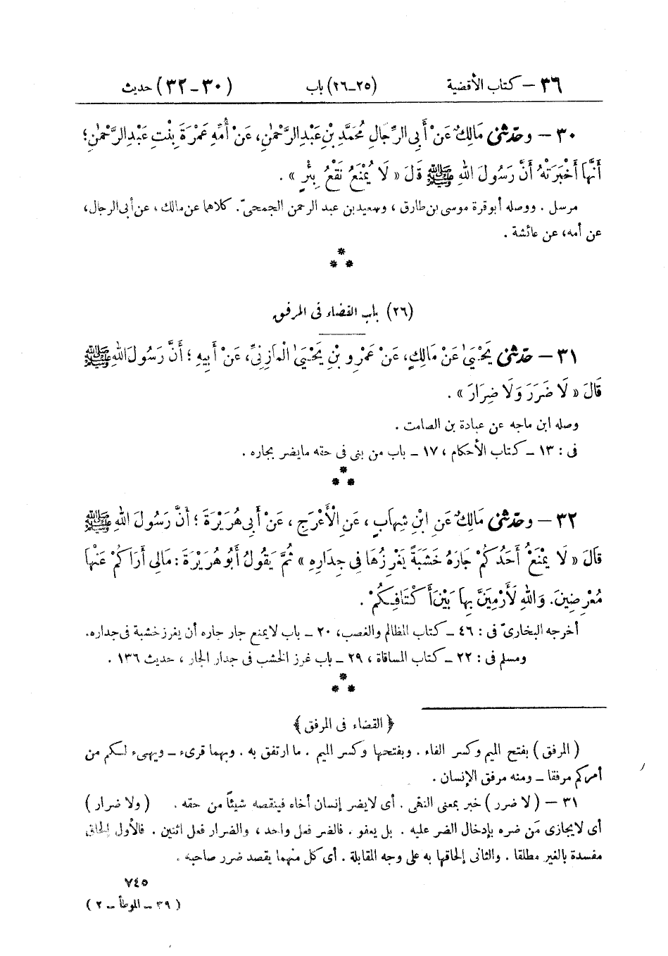 ٣١ - حَدَّثَنِي يَحْيَى، عَنْ مَالِكٍ، عَنْ عَمْرِو بْنِ يَحْيَى الْمَازِنِيِّ، عَنْ أَبِيهِ، أَنَّ رَسُولَ اللَّهِ صَلَّى اللهُ عَلَيْهِ وَسَلَّمَ قَالَ: «لَا ضَرَرَ وَلَا ضِرَارَ»