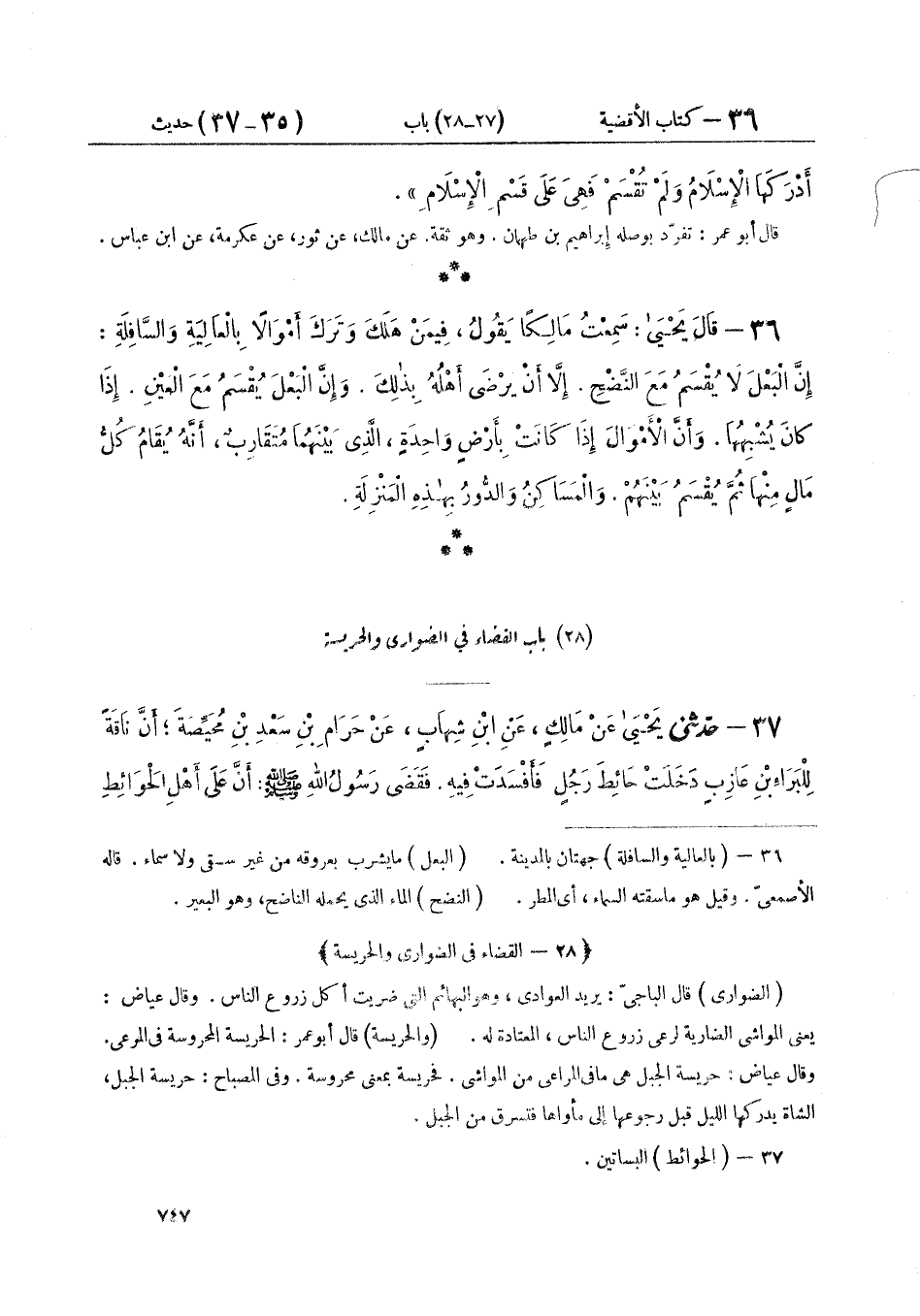 ٣٧ - حَدَّثَنِي يَحْيَى، عَنْ مَالِكٍ، عَنِ ابْنِ شِهَابٍ، عَنْ حَرَامِ بْنِ سَعْدِ بْنِ مُحَيِّصَةَ، أَنَّ نَاقَةً لِلْبَرَاءِ بْنِ عَازِبٍ دَخَلَتْ حَائِطَ رَجُلٍ فَأَفْسَدَتْ فِيهِ. فَقَضَى رَسُولُ اللَّهِ صَلَّى اللهُ عَلَيْهِ وَسَلَّمَ: «أَنَّ عَلَى أَهْلِ الْحَوَائِطِ ⦗٧٤٨⦘ حِفْظَهَا بِالنَّهَارِ، وَأَنَّ مَا أَفْسَدَتِ الْمَوَاشِي بِاللَّيْلِ ضَامِنٌ عَلَى أَهْلِهَا»