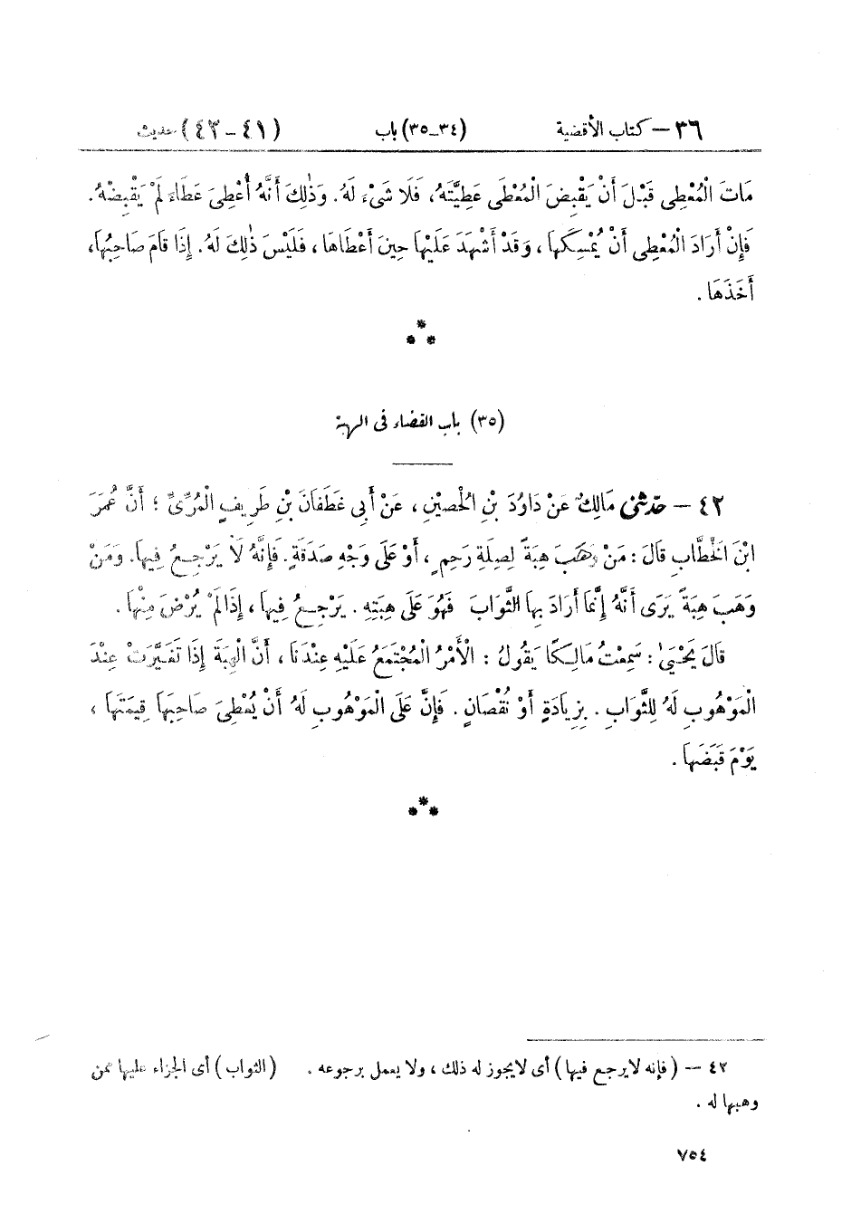 ٤٢ - حَدَّثَنِي مَالِكٌ، عَنْ دَاوُدَ بْنِ الْحُصَيْنِ، عَنْ أَبِي غَطَفَانَ بْنِ طَرِيفٍ الْمُرِّيِّ، أَنَّ عُمَرَ بْنَ الْخَطَّابِ قَالَ: «مَنْ وَهَبَ هِبَةً لِصِلَةِ رَحِمٍ، أَوْ عَلَى وَجْهِ صَدَقَةٍ، فَإِنَّهُ لَا يَرْجِعُ فِيهَا، وَمَنْ وَهَبَ هِبَةً يَرَى أَنَّهُ إِنَّمَا أَرَادَ بِهَا الثَّوَابَ، فَهُوَ عَلَى هِبَتِهِ يَرْجِعُ فِيهَا إِذَا لَمْ يُرْضَ مِنْهَا» قَالَ يَحْيَى: سَمِعْتُ مَالِكًا يَقُولُ: «الْأَمْرُ الْمُجْتَمَعُ عَلَيْهِ عِنْدَنَا، أَنَّ الْهِبَةَ إِذَا تَغَيَّرَتْ عِنْدَ الْمَوْهُوبِ لَهُ لِلثَّوَابِ. بِزِيَادَةٍ أَوْ نُقْصَانٍ. فَإِنَّ عَلَى الْمَوْهُوبِ لَهُ أَنْ يُعْطِيَ صَاحِبَهَا قِيمَتَهَا، يَوْمَ قَبَضَهَا»