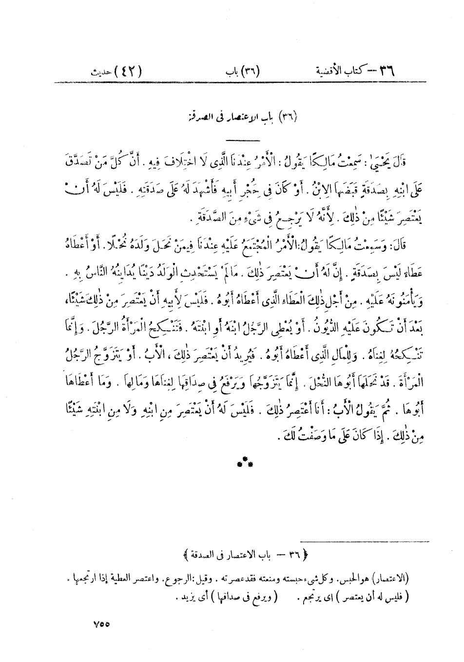 قَالَ يَحْيَى: سَمِعْتُ مَالِكًا يَقُولُ: «الْأَمْرُ عِنْدَنَا الَّذِي لَا اخْتِلَافَ فِيهِ، أَنَّ كُلَّ مَنْ تَصَدَّقَ عَلَى ابْنِهِ بِصَدَقَةٍ قَبَضَهَا الِابْنُ. أَوْ كَانَ فِي حَجْرِ أَبِيهِ فَأَشْهَدَ لَهُ عَلَى صَدَقَتِهِ. فَلَيْسَ لَهُ أَنْ يَعْتَصِرَ شَيْئًا مِنْ ذَلِكَ. لِأَنَّهُ لَا يَرْجِعُ فِي شَيْءٍ مِنَ الصَّدَقَةِ» قَالَ وسَمِعْتُ مَالِكًا: " يَقُولُ الْأَمْرُ الْمُجْتَمَعُ عَلَيْهِ عِنْدَنَا فِيمَنْ نَحَلَ وَلَدَهُ نُحْلًا، أَوْ أَعْطَاهُ عَطَاءً لَيْسَ بِصَدَقَةٍ. إِنَّ لَهُ أَنْ يَعْتَصِرَ ذَلِكَ. مَا لَمْ يَسْتَحْدِثِ الْوَلَدُ دَيْنًا يُدَايِنُهُ النَّاسُ بِهِ. وَيَأْمَنُونَهُ عَلَيْهِ. مِنْ أَجْلِ ذَلِكَ الْعَطَاءِ الَّذِي أَعْطَاهُ أَبُوهُ. فَلَيْسَ لِأَبِيهِ أَنْ يَعْتَصِرَ مِنْ ذَلِكَ شَيْئًا، بَعْدَ أَنْ تَكُونَ عَلَيْهِ الدُّيُونُ. أَوْ يُعْطِي الرَّجُلُ ابْنَهُ أَوِ ابْنَتَهُ. فَتَنْكِحُ الْمَرْأَةُ الرَّجُلَ. وَإِنَّمَا تَنْكِحُهُ لِغِنَاهُ. وَلِلْمَالِ الَّذِي أَعْطَاهُ أَبُوهُ. فَيُرِيدُ أَنْ يَعْتَصِرَ ذَلِكَ الْأَبُ. أَوْ يَتَزَوَّجُ الرَّجُلُ الْمَرْأَةَ قَدْ نَحَلَهَا أَبُوهَا النُّحْلَ. إِنَّمَا يَتَزَوَّجُهَا وَيَرْفَعُ فِي صِدَاقِهَا لِغِنَاهَا وَمَالِهَا. وَمَا أَعْطَاهَا أَبُوهَا. ثُمَّ يَقُولُ الْأَبُ: أَنَا أَعْتَصِرُ ذَلِكَ. فَلَيْسَ لَهُ أَنْ يَعْتَصِرَ مِنِ ابْنِهِ وَلَا مِنِ ابْنَتِهِ شَيْئًا مِنْ ذَلِكَ. إِذَا كَانَ عَلَى مَا وَصَفْتُ لَكَ "
