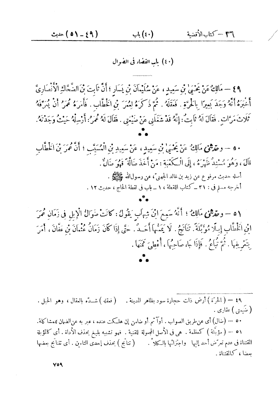 ٥١ - وَحَدَّثَنِي مَالِكٌ، أَنَّهُ سَمِعَ ابْنَ شِهَابٍ يَقُولُ: كَانَتْ ضَوَالُّ الْإِبِلِ فِي زَمَانِ عُمَرَ بْنِ الْخَطَّابِ إِبِلًا مُؤَبَّلَةً تَنَاتَجُ. لَا يَمَسُّهَا أَحَدٌ. حَتَّى إِذَا كَانَ زَمَانُ عُثْمَانَ بْنِ عَفَّانَ، أَمَرَ بِتَعْرِيفِهَا. ثُمَّ تُبَاعُ. فَإِذَا جَاءَ صَاحِبُهَا. أُعْطِيَ ثَمَنَهَا "