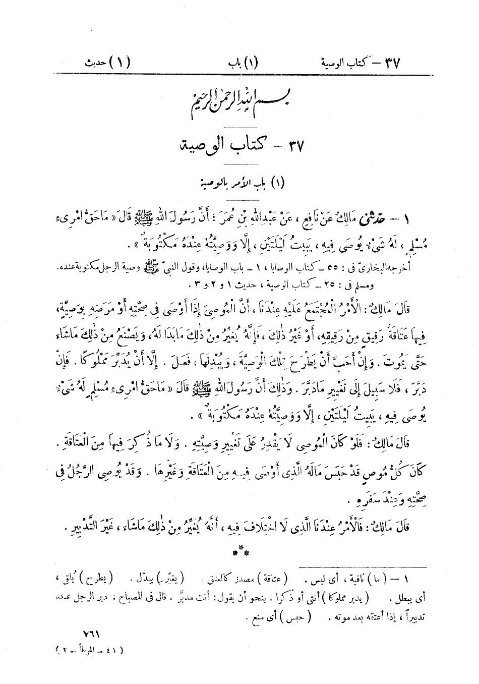 ١ - حَدَّثَنِي مَالِكٌ، عَنْ نَافِعٍ، عَنْ عَبْدِ اللَّهِ بْنِ عُمَرَ، أَنَّ رَسُولَ اللَّهِ صَلَّى اللهُ عَلَيْهِ وَسَلَّمَ قَالَ: «مَا حَقُّ امْرِئٍ مُسْلِمٍ، لَهُ شَيْءٌ يُوصَى فِيهِ، يَبِيتُ لَيْلَتَيْنِ إِلَّا وَوَصِيَّتُهُ عِنْدَهُ مَكْتُوبَةٌ» قَالَ مَالِكٌ، عَنْ نَافِعٍ، عَنْ عَبْدِ اللَّهِ بْنِ عُمَرَ، أَنَّ رَسُولَ اللَّهِ صَلَّى اللهُ عَلَيْهِ وَسَلَّمَ قَالَ: «مَا حَقُّ امْرِئٍ مُسْلِمٍ، لَهُ شَيْءٌ يُوصَى فِيهِ، يَبِيتُ لَيْلَتَيْنِ إِلَّا وَوَصِيَّتُهُ عِنْدَهُ مَكْتُوبَةٌ» قَالَ مَالِكٌ: «الْأَمْرُ الْمُجْتَمَعُ عَلَيْهِ عِنْدَنَا، أَنَّ الْمُوصِيَ إِذَا أَوْصَى فِي صِحَّتِهِ أَوْ مَرَضِهِ بِوَصِيَّةٍ، فِيهَا عَتَاقَةُ رَقِيقٍ مِنْ رَقِيقِهِ، أَوْ غَيْرُ ذَلِكَ، فَإِنَّهُ يُغَيِّرُ مِنْ ذَلِكَ مَا بَدَا لَهُ وَيَصْنَعُ مِنْ ذَلِكَ مَا شَاءَ حَتَّى يَمُوتَ. وَإِنْ أَحَبَّ أَنْ يَطْرَحَ تِلْكَ الْوَصِيَّةَ، وَيُبْدِلَهَا، فَعَلَ. إِلَّا أَنْ يُدَبِّرَ مَمْلُوكًا. فَإِنْ دَبَّرَ، فَلَا سَبِيلَ إِلَى تَغْيِيرِ مَا دَبَّرَ». وَذَلِكَ أَنَّ رَسُولَ اللَّهِ صَلَّى اللهُ عَلَيْهِ وَسَلَّمَ قَالَ: «مَا حَقُّ امْرِئٍ مُسْلِمٍ. لَهُ شَيْءٌ يُوصَى فِيهِ. يَبِيتُ لَيْلَتَيْنِ إِلَّا وَوَصِيَّتُهُ عِنْدَهُ مَكْتُوبَةٌ» قَالَ مَالِكٌ: «فَلَوْ كَانَ الْمُوصِي لَا يَقْدِرُ عَلَى تَغْيِيرِ وَصِيَّتِهِ، وَلَا مَا ذُكِرَ فِيهَا مِنَ الْعَتَاقَةِ. كَانَ كُلُّ مُوصٍ قَدْ حَبَسَ مَالَهُ الَّذِي أَوْصَى فِيهِ مِنَ الْعَتَاقَةِ وَغَيْرِهَا، وَقَدْ يُوصِي الرَّجُلُ فِي صِحَّتِهِ وَعِنْدَ سَفَرِهِ» قَالَ مَالِكٌ: «فَالْأَمْرُ عِنْدَنَا الَّذِي لَا اخْتِلَافَ فِيهِ، أَنَّهُ يُغَيِّرُ مِنْ ذَلِكَ مَا شَاءَ غَيْرَ التَّدْبِيرِ»