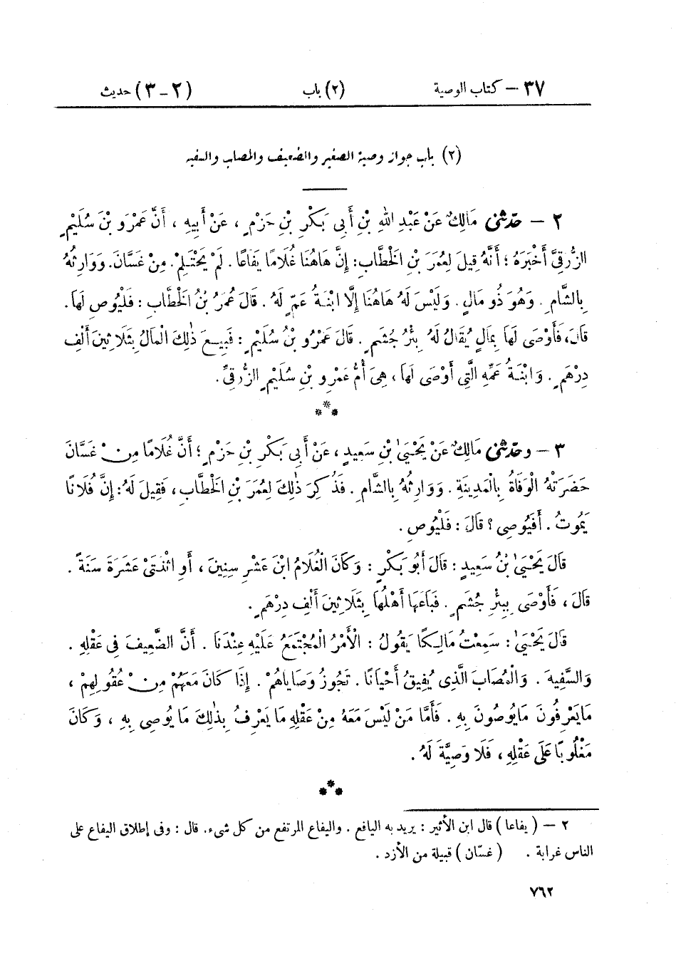 ٣ - وَحَدَّثَنِي مَالِكٌ، عَنْ يَحْيَى بْنِ سَعِيدٍ، عَنْ أَبِي بَكْرِ بْنِ حَزْمٍ أَنَّ غُلَامًا مِنْ غَسَّانَ، حَضَرَتْهُ الْوَفَاةُ بِالْمَدِينَةِ، وَوَارِثُهُ بِالشَّامِ، فَذُكِرَ ذَلِكَ لِعُمَرَ بْنِ الْخَطَّابِ فَقِيلَ لَهُ: إِنَّ فُلَانًا يَمُوتُ أَفَيُوصِي؟ قَالَ: «فَلْيُوصِ» قَالَ يحْيَى بْنُ سَعِيدٍ، قَالَ أَبُو بَكْرٍ: وَكَانَ الْغُلَامُ ابْنَ عَشْرِ سِنِينَ أَوِ اثْنَتَيْ عَشَرَةَ سَنَةً، قَالَ: فَأَوْصَى بِبِئْرِ جُشَمٍ فَبَاعَهَا أَهْلُهَا بِثَلَاثِينَ أَلْفَ دِرْهَمٍ قَالَ يَحْيَى: سَمِعْتُ مَالِكًا يَقُولُ: «الْأَمْرُ الْمُجْتَمَعُ عَلَيْهِ عِنْدَنَا. أَنَّ الضَّعِيفَ فِي عَقْلِهِ، وَالسَّفِيهَ، وَالْمُصَابَ الَّذِي يُفِيقُ أَحْيَانًا. تَجُوزُ وَصَايَاهُمْ. إِذَا كَانَ مَعَهُمْ مِنْ عُقُولِهِمْ، مَا يَعْرِفُونَ مَا يُوصُونَ بِهِ. فَأَمَّا مَنْ لَيْسَ مَعَهُ مِنْ عَقْلِهِ مَا يَعْرِفُ بِذَلِكَ مَا يُوصِي بِهِ، وَكَانَ مَغْلُوبًا عَلَى عَقْلِهِ، فَلَا وَصِيَّةَ لَهُ»