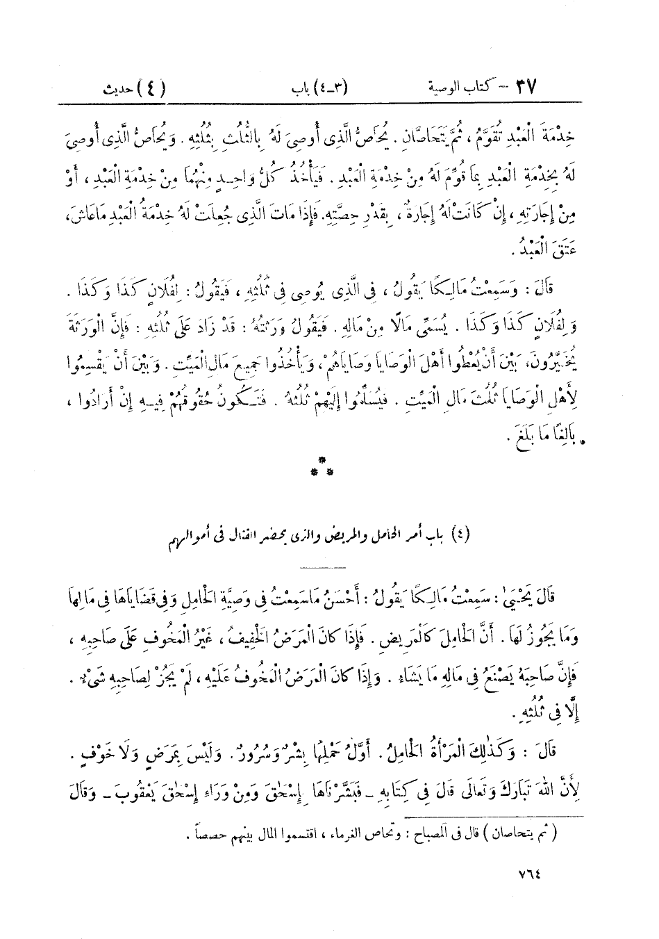قَالَ يَحْيَى: سَمِعْتُ مَالِكًا يَقُولُ: أَحْسَنُ مَا سَمِعْتُ فِي وَصِيَّةِ الْحَامِلِ وَفِي قَضَايَاهَا فِي مَالِهَا وَمَا يَجُوزُ لَهَا. «أَنَّ الْحَامِلَ كَالْمَرِيضِ. فَإِذَا كَانَ الْمَرَضُ الْخَفِيفُ، غَيْرُ الْمَخُوفِ عَلَى صَاحِبِهِ، فَإِنَّ صَاحِبَهُ يَصْنَعُ فِي مَالِهِ مَا يَشَاءُ. وَإِذَا كَانَ الْمَرَضُ الْمَخُوفُ عَلَيْهِ، لَمْ يَجُزْ لِصَاحِبِهِ شَيْءٌ إِلَّا فِي ثُلُثِهِ» قَالَ: " وَكَذَلِكَ الْمَرْأَةُ الْحَامِلُ أَوَّلُ. حَمْلِهَا بِشْرٌ وَسُرُورٌ. وَلَيْسَ بِمَرَضٍ وَلَا خَوْفٍ. لِأَنَّ اللَّهَ تَبَارَكَ وَتَعَالَى قَالَ فِي كِتَابِهِ: {فَبَشَّرْنَاهَا بِإِسْحَاقَ وَمِنْ وَرَاءِ إِسْحَاقَ يَعْقُوبَ} وَقَالَ: ⦗٧٦٥⦘ {حَمَلَتْ حَمْلًا خَفِيفًا فَمَرَّتْ بِهِ فَلَمَّا أَثْقَلَتْ دَعَوَا اللَّهَ رَبَّهُمَا لَئِنْ آتَيْتَنَا صَالِحًا لَنَكُونَنَّ مِنَ الشَّاكِرِينَ} [الأعراف: ١٨٩] فَالْمَرْأَةُ الْحَامِلُ إِذَا أَثْقَلَتْ لَمْ يَجُزْ لَهَا قَضَاءٌ إِلَّا فِي ثُلُثِهَا فَأَوَّلُ الْإِتْمَامِ سِتَّةُ أَشْهُرٍ. قَالَ اللَّهُ تَبَارَكَ وَتَعَالَى فِي كِتَابِهِ: {وَالْوَالِدَاتُ يُرْضِعْنَ أَوْلَادَهُنَّ حَوْلَيْنِ كَامِلَيْنِ} [البقرة: ٢٣٣] وَقَالَ: {وَحَمْلُهُ وَفِصَالُهُ ثَلَاثُونَ شَهْرًا} [الأحقاف: ١٥] فَإِذَا مَضَتْ لِلْحَامِلِ سِتَّةُ أَشْهُرٍ مِنْ يَوْمَ حَمَلَتْ لَمْ يَجُزْ لَهَا قَضَاءٌ فِي مَالِهَا إِلَّا فِي الثُّلُثِ ". قَالَ: وَسَمِعْتُ مَالِكًا يَقُولُ فِي الرَّجُلِ يَحْضُرُ الْقِتَالَ: «إِنَّهُ إِذَا زَحَفَ فِي الصَّفِّ لِلْقِتَالِ، لَمْ يَجُزْ لَهُ أَنْ يَقْضِيَ فِي مَالِهِ شَيْئًا. إِلَّا فِي الثُّلُثِ. وَإِنَّهُ بِمَنْزِلَةِ الْحَامِلِ وَالْمَرِيضِ الْمَخُوفِ عَلَيْهِ مَا كَانَ بِتِلْكَ الْحَالِ»