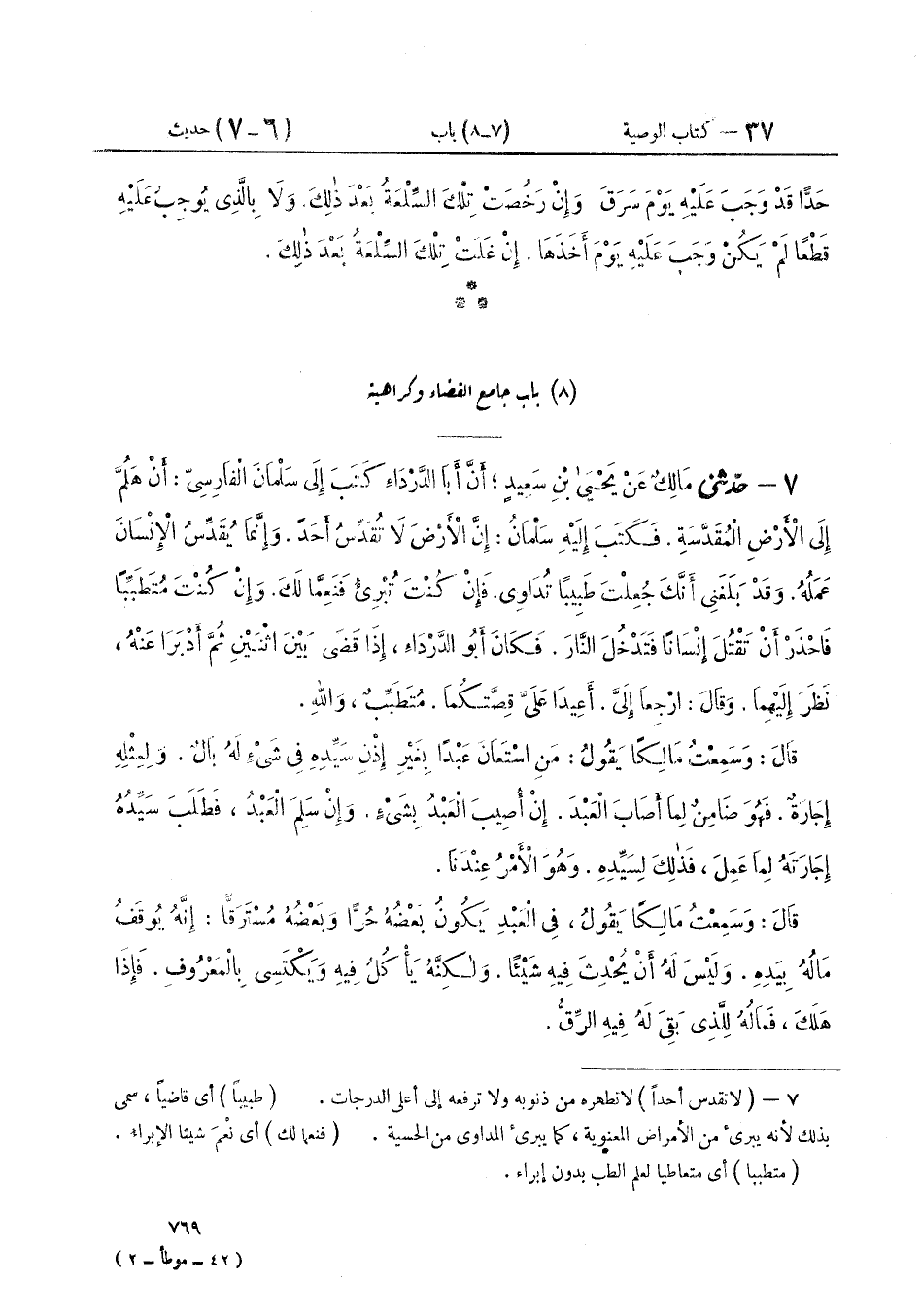 ٧ - حَدَّثَنِي مَالِكٌ، عَنْ يَحْيَى بْنِ سَعِيدٍ أَنَّ أَبَا الدَّرْدَاءِ، كَتَبَ إِلَى سَلْمَانَ الْفَارِسِيِّ، أَنْ هَلُمَّ إِلَى الْأَرْضِ الْمُقَدَّسَةِ فَكَتَبَ إِلَيْهِ سَلْمَانُ: «إِنَّ الْأَرْضَ لَا تُقَدِّسُ أَحَدًا. وَإِنَّمَا يُقَدِّسُ الْإِنْسَانَ عَمَلُهُ. وَقَدْ بَلَغَنِي أَنَّكَ جُعِلْتَ طَبِيبًا تُدَاوِي فَإِنْ كُنْتَ تُبْرِئُ فَنَعِمَّا لَكَ. وَإِنْ كُنْتَ مُتَطَبِّبًا فَاحْذَرْ أَنْ تَقْتُلَ إِنْسَانًا فَتَدْخُلَ النَّارَ» فَكَانَ أَبُو الدَّرْدَاءِ إِذَا قَضَى بَيْنَ اثْنَيْنِ ثُمَّ أَدْبَرَا عَنْهُ نَظَرَ إِلَيْهِمَا. وَقَالَ: ارْجِعَا إِلَيَّ أَعِيدَا عَلَيَّ قِصَّتَكُمَا مُتَطَبِّبٌ وَاللَّهِ. قَالَ: وَسَمِعْتُ مَالِكًا يَقُولُ: «مَنِ اسْتَعَانَ عَبْدًا بِغَيْرِ إِذْنِ سَيِّدِهِ فِي شَيْءٍ لَهُ بَالٌ. وَلِمِثْلِهِ إِجَارَةٌ فَهُوَ ضَامِنٌ لِمَا أَصَابَ الْعَبْدَ. إِنْ أُصِيبَ الْعَبْدُ بِشَيْءٍ. وَإِنْ سَلِمَ الْعَبْدُ، فَطَلَبَ سَيِّدُهُ إِجَارَتَهُ لِمَا عَمِلَ، فَذَلِكَ لِسَيِّدِهِ. وَهُوَ الْأَمْرُ عِنْدَنَا» قَالَ: وسَمِعْتُ مَالِكًا، يَقُولُ فِي الْعَبْدِ: «يَكُونُ بَعْضُهُ حُرًّا وَبَعْضُهُ مُسْتَرَقًّا، إِنَّهُ يُوقَفُ مَالُهُ بِيَدِهِ. وَلَيْسَ لَهُ أَنْ يُحْدِثَ فِيهِ شَيْئًا. وَلَكِنَّهُ يَأْكُلُ فِيهِ وَيَكْتَسِي بِالْمَعْرُوفِ فَإِذَا هَلَكَ. فَمَالُهُ لِلَّذِي بَقِيَ لَهُ فِيهِ الرِّقُّ» ⦗٧٧٠⦘ قَالَ: وَسَمِعْتُ مَالِكًا يَقُولُ: «الْأَمْرُ عِنْدَنَا أَنَّ الْوَالِدَ يُحَاسِبُ وَلَدَهُ بِمَا أَنْفَقَ عَلَيْهِ مِنْ يَوْمِ يَكُونُ لِلْوَلَدِ مَالٌ. نَاضًّا كَانَ أَوْ عَرْضًا إِنْ أَرَادَ الْوَالِدُ ذَلِكَ».