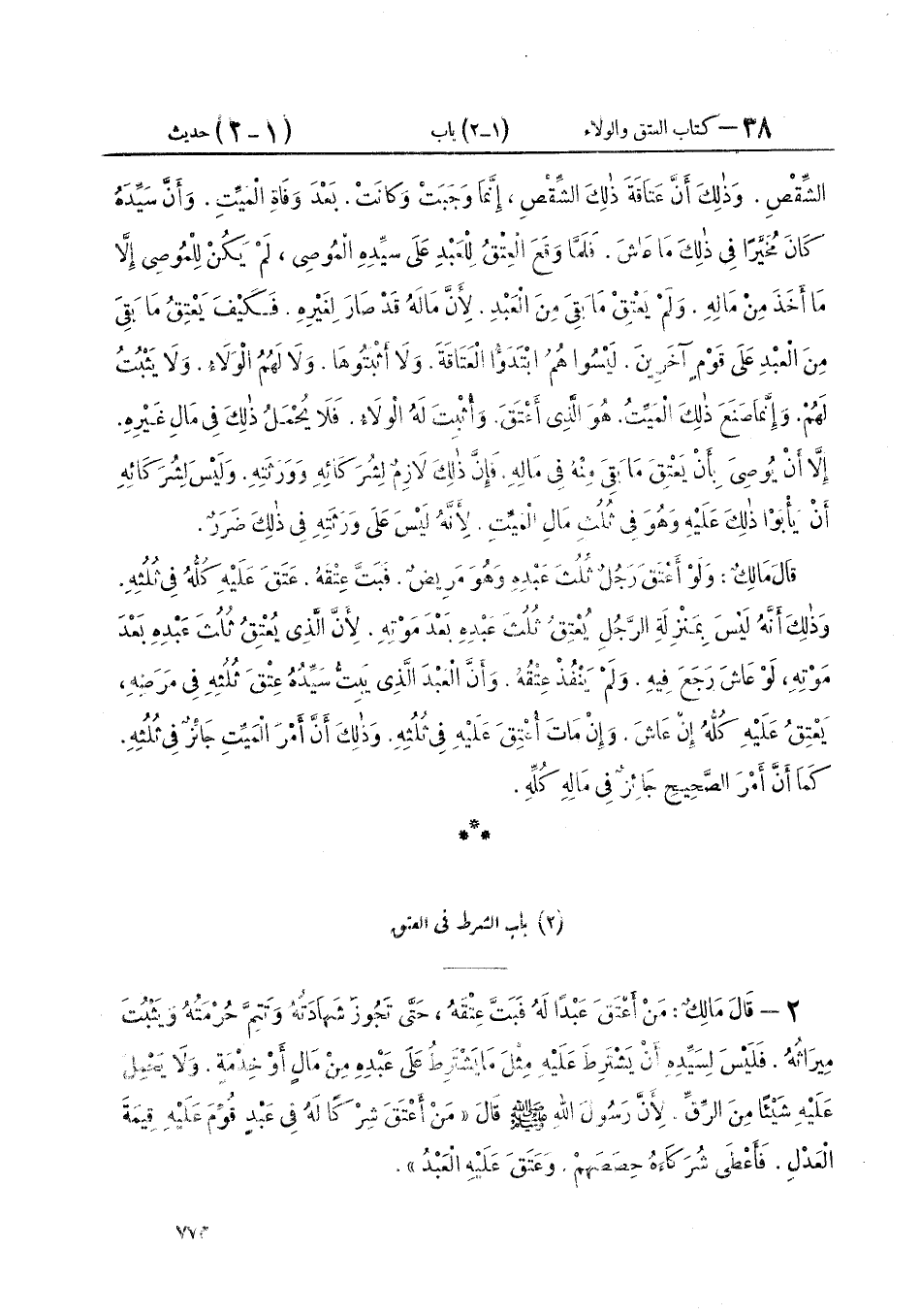 ٢ - قَالَ مَالِكٌ: مَنْ أَعْتَقَ عَبْدًا لَهُ فَبَتَّ عِتْقَهُ، حَتَّى تَجُوزَ شَهَادَتُهُ وَتَتِمَّ حُرِّيَّتُهُ وَيَثْبُتَ مِيرَاثُهُ. " فَلَيْسَ لِسَيِّدِهِ أَنْ يَشْتَرِطَ عَلَيْهِ مِثْلَ مَا يَشْتَرِطُ عَلَى عَبْدِهِ مِنْ مَالٍ أَوْ خِدْمَةٍ. وَلَا يَحْمِلَ عَلَيْهِ شَيْئًا مِنَ الرِّقِّ. لِأَنَّ رَسُولَ اللَّهِ صَلَّى اللهُ عَلَيْهِ وَسَلَّمَ قَالَ: «مَنْ أَعْتَقَ شِرْكًا لَهُ فِي عَبْدٍ قُوِّمَ عَلَيْهِ قِيمَةَ الْعَدْلِ. فَأَعْطَى شُرَكَاءَهُ حِصَصَهُمْ. وَعَتَقَ عَلَيْهِ الْعَبْدُ» ⦗٧٧٤⦘ قَالَ مَالِكٌ: «فَهُوَ، إِذَا كَانَ لَهُ الْعَبْدُ خَالِصًا أَحَقُّ بِاسْتِكْمَالِ عَتَاقَتِهِ. وَلَا يَخْلِطُهَا بِشَيْءٍ مِنَ الرِّقِّ»