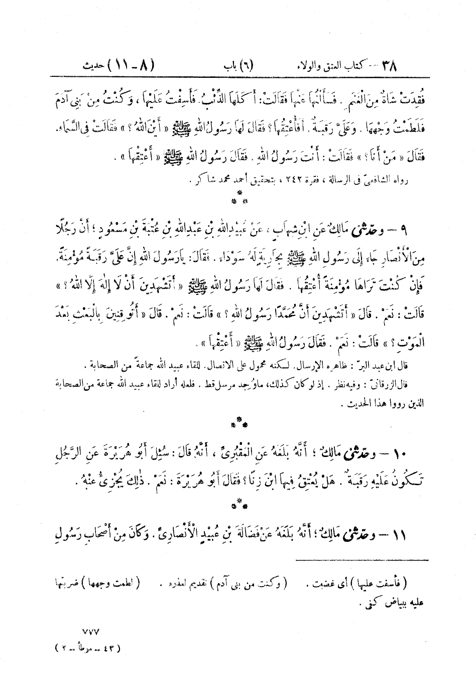 ٩ - وحَدَّثَنِي مَالِكٌ، عَنِ ابْنِ شِهَابٍ، عَنْ عُبَيْدِ اللَّهِ بْنِ عَبْدِ اللَّهِ بْنِ عُتْبَةَ بْنِ مَسْعُودٍ أَنَّ رَجُلًا مِنَ الْأَنْصَارِ جَاءَ إِلَى رَسُولِ اللَّهِ صَلَّى اللهُ عَلَيْهِ وَسَلَّمَ بِجَارِيَةٍ لَهُ سَوْدَاءَ. فَقَالَ: يَا رَسُولَ اللَّهِ إِنَّ عَلَيَّ رَقَبَةً مُؤْمِنَةً. فَإِنْ كُنْتَ تَرَاهَا مُؤْمِنَةً أُعْتِقُهَا. فَقَالَ لَهَا رَسُولُ اللَّهِ صَلَّى اللهُ عَلَيْهِ وَسَلَّمَ: «أَتَشْهَدِينَ أَنْ لَا إِلَهَ إِلَّا اللَّهُ؟» قَالَتْ: نَعَمْ. قَالَ: «أَتَشْهَدِينَ أَنَّ مُحَمَّدًا رَسُولُ اللَّهِ» قَالَتْ: نَعَمْ. قَالَ: «أَتُوقِنِينَ بِالْبَعْثِ بَعْدَ الْمَوْتِ؟» قَالَتْ: نَعَمْ. فَقَالَ رَسُولُ اللَّهِ صَلَّى اللهُ عَلَيْهِ وَسَلَّمَ: «أَعْتِقْهَا»