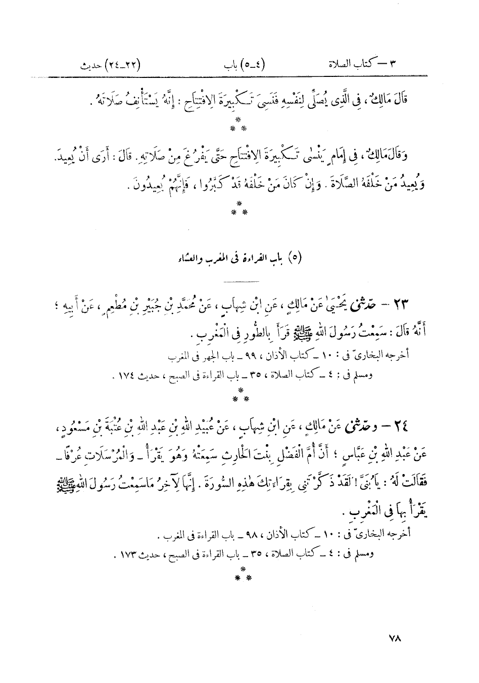 ٢٣ - حَدَّثَنِي يَحْيَى، عَنْ مَالِكٍ، عَنِ ابْنِ شِهَابٍ، عَنْ مُحَمَّدِ بْنِ جُبَيْرِ بْنِ مُطْعِمٍ، عَنْ أَبِيهِ أَنَّهُ قَالَ: سَمِعْتُ رَسُولَ اللَّهِ صَلَّى اللهُ عَلَيْهِ وَسَلَّمَ «قَرَأَ بِالطُّورِ فِي الْمَغْرِبِ»
