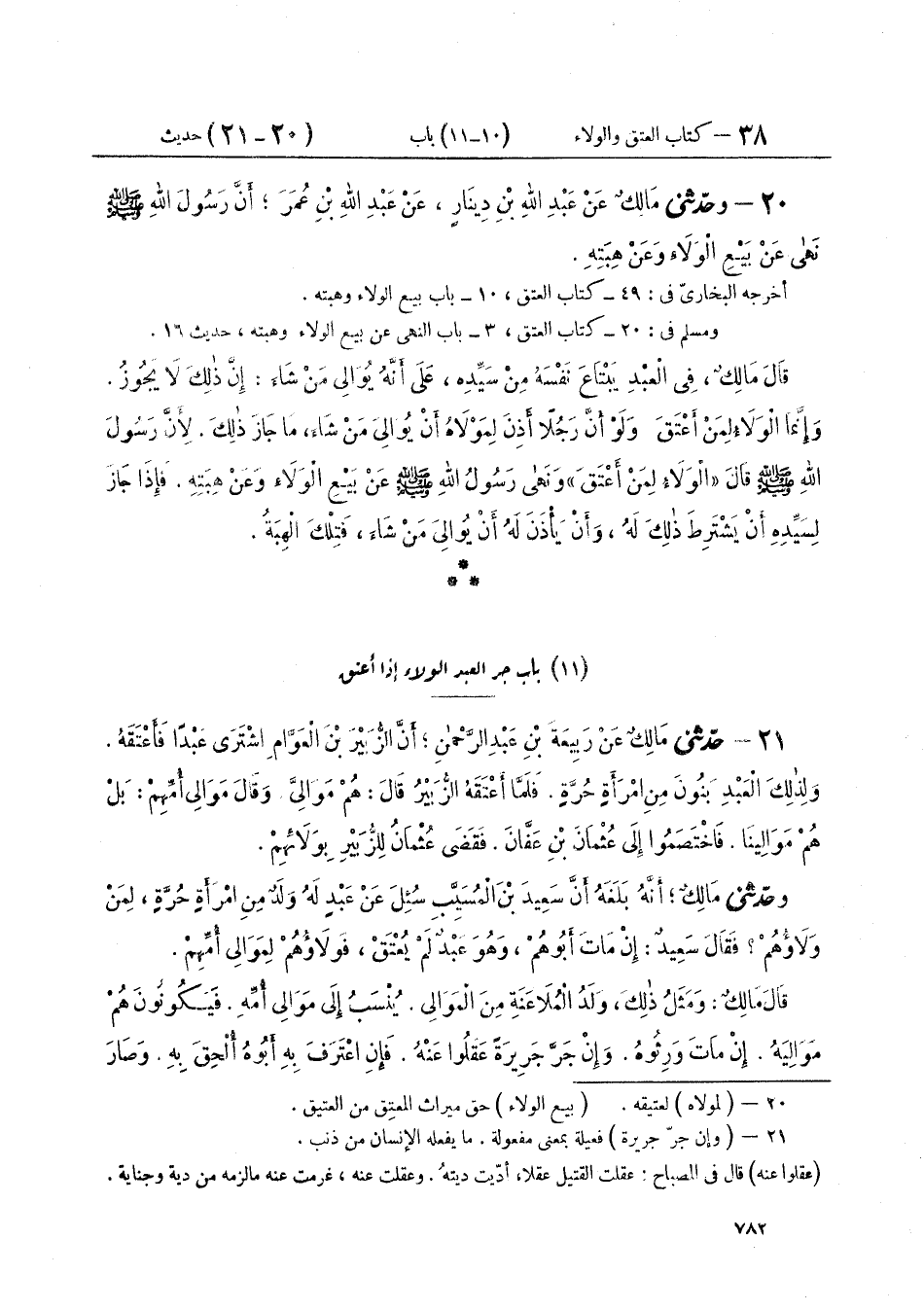 ٢١ - حَدَّثَنِي مَالِكٌ، عَنْ رَبِيعَةَ بْنِ أَبِي عَبْدِ الرَّحْمَنِ، أَنَّ الزُّبَيْرَ بْنَ الْعَوَّامِ، اشْتَرَى عَبْدًا. فَأَعْتَقَهُ. وَلِذَلِكَ الْعَبْدِ بَنُونَ مِنِ امْرَأَةٍ حُرَّةٍ. فَلَمَّا أَعْتَقَهُ الزُّبَيْرُ قَالَ: هُمْ مَوَالِيَّ. وَقَالَ: مَوَالِي أُمِّهِمْ. بَلْ هُمْ مَوَالِينَا. فَاخْتَصَمُوا إِلَى عُثْمَانَ بْنِ عَفَّانَ، «فَقَضَى عُثْمَانُ، لِلزُّبَيْرِ بِوَلَائِهِمْ»