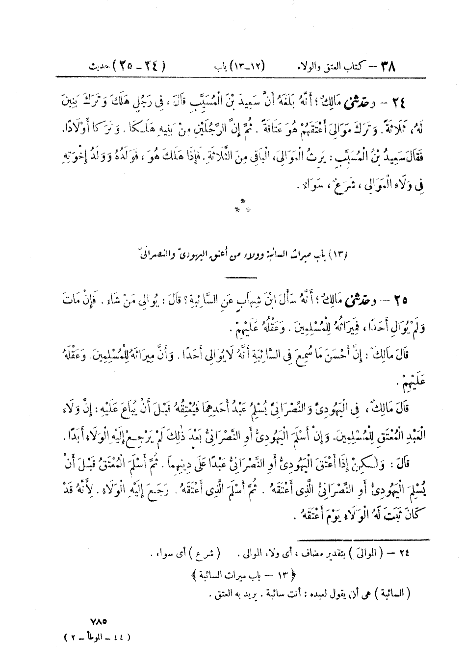 ٢٥ - وَحَدَّثَنِي مَالِكٌ، أَنَّهُ سَأَلَ ابْنَ شِهَابٍ، عَنِ السَّائِبَةِ؟ قَالَ: يُوَالِي مَنْ شَاءَ فَإِنْ مَاتَ وَلَمْ يُوَالِي أَحَدًا فَمِيرَاثُهُ لِلْمُسْلِمِينَ وَعَقْلُهُ عَلَيْهِمْ قَالَ مَالِكٌ إِنَّ أَحْسَنَ مَا سُمِعَ فِي السَّائِبَةِ: «أَنَّهُ لَا يُوَالِي أَحَدًا. وَأَنَّ مِيرَاثَهُ لِلْمُسْلِمِينَ وَعَقْلَهُ عَلَيْهِمْ». قَالَ مَالِكٌ فِي الْيَهُودِيِّ وَالنَّصْرَانِيِّ يُسْلِمُ عَبْدُ أَحَدِهِمَا، فَيُعْتِقُهُ قَبْلَ أَنْ يُبَاعَ عَلَيْهِ: " إِنَّ وَلَاءَ الْعَبْدِ الْمُعْتَقِ لِلْمُسْلِمِينَ، وَإِنْ أَسْلَمَ الْيَهُودِيُّ أَوِ النَّصْرَانِيُّ بَعْدَ ذَلِكَ. لَمْ يَرْجِعْ إِلَيْهِ الْوَلَاءُ أَبَدًا. قَالَ: وَلَكِنْ إِذَا أَعْتَقَ الْيَهُودِيُّ أَوِ النَّصْرَانِيُّ عَبْدًا عَلَى دِينِهِمَا. ثُمَّ أَسْلَمَ الْمُعْتَقُ قَبْلَ أَنْ يُسْلِمَ الْيَهُودِيُّ أَوِ النَّصْرَانِيُّ الَّذِي أَعْتَقَهُ. ثُمَّ أَسْلَمَ الَّذِي أَعْتَقَهُ. رَجَعَ إِلَيْهِ الْوَلَاءُ. لِأَنَّهُ قَدْ كَانَ ثَبَتَ لَهُ الْوَلَاءُ يَوْمَ أَعْتَقَهُ ". ⦗٧٨٦⦘ قَالَ مَالِكٌ: «وَإِنْ كَانَ لِلْيَهُودِيِّ أَوِ النَّصْرَانِيِّ وَلَدٌ مُسْلِمٌ. وَرِثَ مَوَالِيَ أَبِيهِ الْيَهُودِيِّ أَوِ النَّصْرَانِيِّ، إِذَا أَسْلَمَ الْمَوْلَى الْمُعْتَقُ. قَبْلَ أَنْ يُسْلِمَ الَّذِي أَعْتَقَهُ، وَإِنْ كَانَ الْمُعْتَقُ حِينَ أُعْتِقَ مُسْلِمًا. لَمْ يَكُنْ لِوَلَدِ النَّصْرَانِيِّ أَوِ الْيَهُودِيِّ الْمُسْلِمَيْنِ مِنْ وَلَاءِ الْعَبْدِ الْمُسْلِمِ شَيْءٌ. لِأَنَّهُ لَيْسَ لِلْيَهُودِيِّ وَلَا لِلنَّصْرَانِيِّ وَلَاءٌ، فَوَلَاءُ الْعَبْدِ الْمُسْلِمِ لِجَمَاعَةِ الْمُسْلِمِينَ»