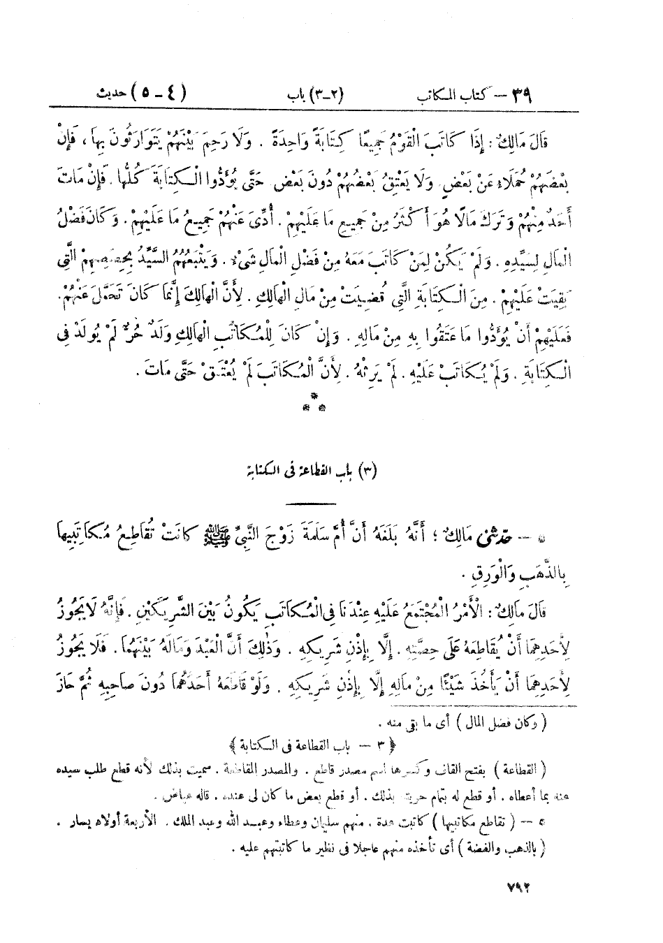 ٥ - حَدَّثَنِي مَالِكٌ أَنَّهُ بَلَغَهُ أَنَّ أُمَّ سَلَمَةَ زَوْجَ النَّبِيِّ صَلَّى اللهُ عَلَيْهِ وَسَلَّمَ «كَانَتْ تُقَاطِعُ مُكَاتَبِيهَا بِالذَّهَبِ وَالْوَرِقِ» قَالَ مَالِكٌ: «الْأَمْرُ الْمُجْتَمَعُ عَلَيْهِ عِنْدَنَا فِي الْمُكَاتَبِ يَكُونُ بَيْنَ الشَّرِيكَيْنِ. فَإِنَّهُ لَا يَجُوزُ لِأَحَدِهِمَا أَنْ يُقَاطِعَهُ عَلَى حِصَّتِهِ. إِلَّا بِإِذْنِ شَرِيكِهِ. وَذَلِكَ أَنَّ الْعَبْدَ وَمَالَهُ بَيْنَهُمَا. فَلَا يَجُوزُ لِأَحَدِهِمَا أَنْ يَأْخُذَ شَيْئًا مِنْ مَالِهِ إِلَّا بِإِذْنِ شَرِيكِهِ. وَلَوْ قَاطَعَهُ أَحَدُهُمَا دُونَ صَاحِبِهِ ثُمَّ حَازَ ⦗٧٩٣⦘ ذَلِكَ. ثُمَّ مَاتَ الْمُكَاتَبُ وَلَهُ مَالٌ. أَوْ عَجَزَ لَمْ يَكُنْ لِمَنْ قَاطَعَهُ شَيْءٌ مِنْ مَالِهِ وَلَمْ يَكُنْ لَهُ أَنْ يَرُدَّ مَا قَاطَعَهُ عَلَيْهِ وَيَرْجِعَ حَقَّهُ فِي رَقَبَتِهِ. وَلَكِنْ مَنْ قَاطَعَ مُكَاتَبًا بِإِذْنِ شَرِيكِهِ ثُمَّ عَجَزَ الْمُكَاتَبُ فَإِنْ أَحَبَّ الَّذِي قَاطَعَهُ أَنْ يَرُدَّ الَّذِي أَخَذَ مِنْهُ مِنَ الْقِطَاعَةِ وَيَكُونُ عَلَى نَصِيبِهِ مِنْ رَقَبَةِ الْمُكَاتَبِ كَانَ ذَلِكَ لَهُ وَإِنْ مَاتَ الْمُكَاتَبُ وَتَرَكَ مَالًا اسْتَوْفَى الَّذِي بَقِيَتْ لَهُ الْكِتَابَةُ حَقَّهُ الَّذِي بَقِيَ لَهُ عَلَى الْمُكَاتَبِ مِنْ مَالِهِ ثُمَّ كَانَ مَا بَقِيَ مِنْ مَالِ الْمُكَاتَبِ بَيْنَ الَّذِي قَاطَعَهُ وَبَيْنَ شَرِيكِهِ عَلَى قَدْرِ حِصَصِهِمَا فِي الْمُكَاتَبِ وَإِنْ كَانَ أَحَدُهُمَا قَاطَعَهُ وَتَمَاسَكَ صَاحِبُهُ بِالْكِتَابَةِ ثُمَّ عَجَزَ الْمُكَاتَبُ قِيلَ لِلَّذِي قَاطَعَهُ إِنْ شِئْتَ أَنْ تَرُدَّ عَلَى صَاحِبِكَ نِصْفَ الَّذِي أَخَذْتَ وَيَكُونُ الْعَبْدُ بَيْنَكُمَا شَطْرَيْنِ وَإِنْ أَبَيْتَ فَجَمِيعُ الْعَبْدِ لِلَّذِي تَمَسَّكَ بِالرِّقِّ خَالِصًا». قَالَ مَالِكٌ فِي الْمُكَاتَبِ يَكُونُ بَيْنَ الرَّجُلَيْنِ: «فَيُقَاطِعُهُ أَحَدُهُمَا بِإِذْنِ صَاحِبِهِ. ثُمَّ يَقْتَضِي الَّذِي تَمَسَّكَ بِالرِّقِّ مِثْلَ مَا قَاطَعَ عَلَيْهِ صَاحِبُهُ. أَوْ أَكْثَرَ مِنْ ذَلِكَ ثُمَّ يَعْجِزُ الْمُكَاتَبُ». قَالَ مَالِكٌ: «فَهُوَ بَيْنَهُمَا لِأَنَّهُ إِنَّمَا اقْتَضَى الَّذِي لَهُ عَلَيْهِ وَإِنِ اقْتَضَى أَقَلَّ مِمَّا أَخَذَ الَّذِي قَاطَعَهُ ثُمَّ عَجَزَ الْمُكَاتَبُ فَأَحَبَّ الَّذِي قَاطَعَهُ أَنْ يَرُدَّ عَلَى صَاحِبِهِ نِصْفَ مَا تَفَضَّلَهُ بِهِ، وَيَكُونُ الْعَبْدُ بَيْنَهُمَا نِصْفَيْنِ، فَذَلِكَ لَهُ وَإِنْ أَبَى فَجَمِيعُ الْعَبْدِ لِلَّذِي لَمْ يُقَاطِعْهُ وَإِنْ مَاتَ الْمُكَاتَبُ وَتَرَكَ مَالًا. فَأَحَبَّ الَّذِي قَاطَعَهُ أَنْ يَرُدَّ عَلَى صَاحِبِهِ نِصْفَ مَا تَفَضَّلَهُ بِهِ. وَيَكُونُ الْمِيرَاثُ بَيْنَهُمَا. فَذَلِكَ لَهُ. وَإِنْ كَانَ الَّذِي تَمَسَّكَ بِالْكِتَابَةِ قَدْ أَخَذَ مِثْلَ مَا قَاطَعَ عَلَيْهِ شَرِيكُهُ. أَوْ أَفْضَلَ فَالْمِيرَاثُ بَيْنَهُمَا بِقَدْرِ مِلْكِهِمَا لِأَنَّهُ إِنَّمَا أَخَذَ حَقَّهُ» قَالَ مَالِكٌ فِي الْمُكَاتَبِ يَكُونُ بَيْنَ الرَّجُلَيْنِ: «فَيُقَاطِعُ أَحَدُهُمَا عَلَى نِصْفِ حَقِّهِ بِإِذْنِ صَاحِبِهِ. ثُمَّ يَقْبِضُ الَّذِي تَمَسَّكَ بِالرِّقِّ أَقَلَّ مِمَّا قَاطَعَ عَلَيْهِ صَاحِبُهُ ثُمَّ يَعْجِزُ الْمُكَاتَبُ». قَالَ مَالِكٌ: «إِنْ أَحَبَّ الَّذِي قَاطَعَ الْعَبْدَ أَنْ يُرَدَّ عَلَى صَاحِبِهِ نِصْفَ مَا تَفَضَّلَهُ بِهِ. كَانَ الْعَبْدُ بَيْنَهُمَا شَطْرَيْنِ وَإِنْ أَبَى أَنْ يَرُدَّ فَلِلَّذِي تَمَسَّكَ بِالرِّقِّ حِصَّةُ صَاحِبِهِ الَّذِي كَانَ قَاطَعَ عَلَيْهِ الْمُكَاتَبَ». قَالَ مَالِكٌ وَتَفْسِيرُ ذَلِكَ " أَنَّ الْعَبْدَ يَكُونُ بَيْنَهُمَا شَطْرَيْنِ. فَيُكَاتِبَانِه
