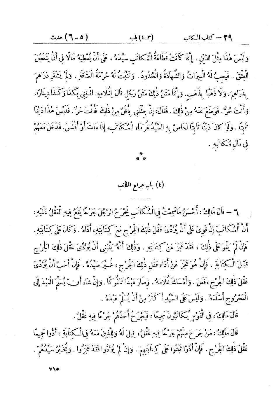 ٦ - قَالَ مَالِكٌ: أَحْسَنُ مَا سَمِعْتُ فِي الْمُكَاتَبِ يَجْرَحُ الرَّجُلَ جَرْحًا يَقَعُ فِيهِ الْعَقْلُ عَلَيْهِ: «أَنَّ الْمُكَاتَبَ إِنْ قَوِيَ عَلَى أَنْ يُؤَدِّيَ عَقْلَ ذَلِكَ الْجَرْحِ مَعَ كِتَابَتِهِ، أَدَّاهُ. وَكَانَ عَلَى كِتَابَتِهِ. فَإِنْ لَمْ يَقْوَ عَلَى ذَلِكَ فَقَدْ عَجَزَ عَنْ كِتَابَتِهِ. وَذَلِكَ أَنَّهُ يَنْبَغِي أَنْ يُؤَدِّيَ عَقْلَ ذَلِكَ الْجَرْحِ قَبْلَ الْكِتَابَةِ. فَإِنْ هُوَ عَجَزَ عَنْ أَدَاءِ عَقْلِ ذَلِكَ الْجَرْحِ خُيِّرَ سَيِّدُهُ. فَإِنْ أَحَبَّ أَنْ يُؤَدِّيَ عَقْلَ ذَلِكَ الْجَرْحِ فَعَلَ وَأَمْسَكَ غُلَامَهُ وَصَارَ عَبْدًا مَمْلُوكًا. وَإِنْ شَاءَ أَنْ يُسَلِّمَ الْعَبْدَ إِلَى الْمَجْرُوحِ أَسْلَمَهُ. وَلَيْسَ عَلَى السَّيِّدِ أَكْثَرُ مِنْ أَنْ يُسَلِّمَ عَبْدَهُ» قَالَ مَالِكٌ فِي الْقَوْمِ يُكَاتَبُونَ جَمِيعًا: «فَيَجْرَحُ أَحَدُهُمْ جَرْحًا فِيهِ عَقْلٌ» قَالَ مَالِكٌ: " مَنْ جَرَحَ مِنْهُمْ جَرْحًا فِيهِ عَقْلٌ. قِيلَ لَهُ وَلِلَّذِينَ مَعَهُ فِي الْكِتَابَةِ أَدُّوا جَمِيعًا عَقْلَ ذَلِكَ الْجَرْحِ. فَإِنْ أَدَّوْا ثَبَتُوا عَلَى كِتَابَتِهِمْ. وَإِنْ لَمْ يُؤَدُّوا فَقَدْ عَجَزُوا. وَيُخَيَّرُ سَيِّدُهُمْ