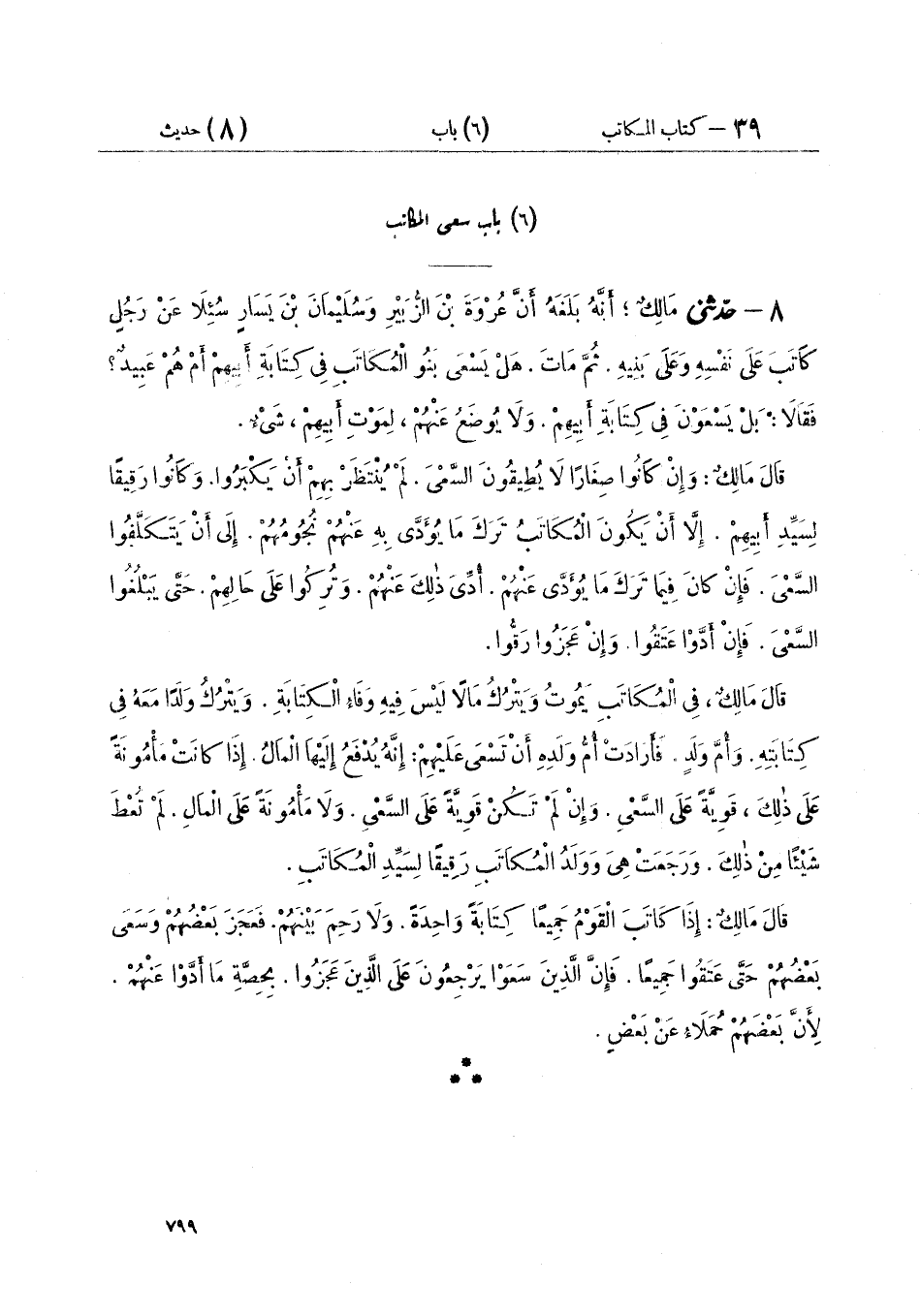 ٨ - حَدَّثَنِي مَالِكٌ أَنَّهُ بَلَغَهُ أَنَّ عُرْوَةَ بْنَ الزُّبَيْرِ، وَسُلَيْمَانَ بْنَ يَسَارٍ، سُئِلَا عَنْ رَجُلٍ كَاتَبَ عَلَى نَفْسِهِ وَعَلَى بَنِيهِ ثُمَّ مَاتَ. هَلْ يَسْعَى بَنُو الْمُكَاتَبِ فِي كِتَابَةِ أَبِيهِمْ أَمْ هُمْ عَبِيدٌ؟ فَقَالَا: «بَلْ يَسْعَوْنَ فِي كِتَابَةِ أَبِيهِمْ وَلَا يُوضَعُ عَنْهُمْ لِمَوْتِ أَبِيهِمْ شَيْءٌ» قَالَ مَالِكٌ: «وَإِنْ كَانُوا صِغَارًا لَا يُطِيقُونَ السَّعْيَ. لَمْ يُنْتَظَرْ بِهِمْ أَنْ يَكْبَرُوا، وَكَانُوا رَقِيقًا لِسَيِّدِ أَبِيهِمْ إِلَّا أَنْ يَكُونَ الْمُكَاتَبُ تَرَكَ مَا يُؤَدَّى بِهِ عَنْهُمْ نُجُومُهُمْ. إِلَى أَنْ يَتَكَلَّفُوا السَّعْيَ. فَإِنْ كَانَ فِيمَا تَرَكَ مَا يُؤَدَّى عَنْهُمْ، أُدِّيَ ذَلِكَ عَنْهُمْ. وَتُرِكُوا عَلَى حَالِهِمْ. حَتَّى يَبْلُغُوا السَّعْيَ. فَإِنْ أَدَّوْا عَتَقُوا وَإِنْ عَجَزُوا رَقُّوا» قَالَ مَالِكٌ فِي الْمُكَاتَبِ يَمُوتُ وَيَتْرُكُ مَالًا لَيْسَ فِيهِ وَفَاءُ الْكِتَابَةِ. وَيَتْرُكُ وَلَدًا مَعَهُ فِي كِتَابَتِهِ وَأُمَّ وَلَدٍ. فَأَرَادَتْ أُمُّ وَلَدِهِ أَنْ تَسْعَى عَلَيْهِمْ: «إِنَّهُ يُدْفَعُ إِلَيْهَا الْمَالُ إِذَا كَانَتْ مَأْمُونَةً عَلَى ذَلِكَ قَوِيَّةً عَلَى السَّعْيِ. وَإِنْ لَمْ تَكُنْ قَوِيَّةً عَلَى السَّعْيِ. وَلَا مَأْمُونَةً عَلَى الْمَالِ لَمْ تُعْطَ شَيْئًا مِنْ ذَلِكَ. وَرَجَعَتْ هِيَ وَوَلَدُ الْمُكَاتَبِ رَقِيقًا لِسَيِّدِ الْمُكَاتَبِ» قَالَ مَالِكٌ: «إِذَا كَاتَبَ الْقَوْمُ جَمِيعًا كِتَابَةً وَاحِدَةً. وَلَا رَحِمَ بَيْنَهُمْ فَعَجَزَ بَعْضُهُمْ وَسَعَى بَعْضُهُمْ حَتَّى عَتَقُوا جَمِيعًا. فَإِنَّ الَّذِينَ سَعَوْا يَرْجِعُونَ عَلَى الَّذِينَ عَجَزُوا بِحِصَّةِ مَا أَدَّوْا عَنْهُمْ لِأَنَّ بَعْضَهُمْ حُمَلَاءُ عَنْ بَعْضٍ»
