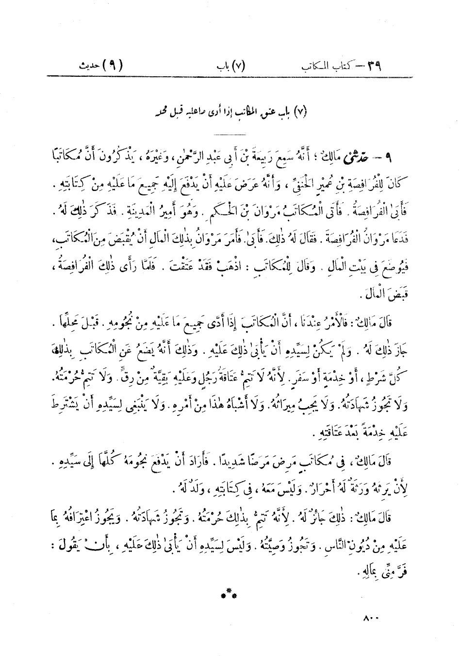 ٩ - حَدَّثَنِي مَالِكٌ، أَنَّهُ سَمِعَ رَبِيعَةَ بْنَ أَبِي عَبْدِ الرَّحْمَنِ، وَغَيْرَهُ يَذْكُرُونَ أَنَّ مُكَاتَبًا كَانَ لِلْفُرَافِصَةِ بْنِ عُمَيْرٍ الْحَنَفِيِّ وَأَنَّهُ عَرَضَ عَلَيْهِ أَنْ يَدْفَعَ إِلَيْهِ جَمِيعَ مَا عَلَيْهِ مِنْ كِتَابَتِهِ. فَأَبَى الْفُرَافِصَةُ فَأَتَى الْمُكَاتَبُ مَرْوَانَ بْنَ الْحَكَمِ وَهُوَ أَمِيرُ الْمَدِينَةِ فَذَكَرَ ذَلِكَ لَهُ فَدَعَا مَرْوَانُ الْفُرَافِصَةَ فَقَالَ لَهُ ذَلِكَ. فَأَبَى فَأَمَرَ مَرْوَانُ بِذَلِكَ الْمَالِ أَنْ يُقْبَضَ مِنَ الْمُكَاتَبِ فَيُوضَعَ فِي بَيْتِ الْمَالِ. وَقَالَ لِلْمُكَاتَبِ اذْهَبْ فَقَدْ عُتِقْتَ. فَلَمَّا رَأَى ذَلِكَ الْفُرَافِصَةُ قَبَضَ الْمَالَ قَالَ مَالِكٌ: «فَالْأَمْرُ عِنْدَنَا أَنَّ الْمُكَاتَبَ إِذَا أَدَّى جَمِيعَ مَا عَلَيْهِ مِنْ نُجُومِهِ قَبْلَ مَحِلِّهَا. جَازَ ذَلِكَ لَهُ. وَلَمْ يَكُنْ لِسَيِّدِهِ أَنْ يَأْبَى ذَلِكَ عَلَيْهِ وَذَلِكَ أَنَّهُ يَضَعُ عَنِ الْمُكَاتَبِ بِذَلِكَ كُلَّ شَرْطٍ أَوْ خِدْمَةٍ أَوْ سَفَرٍ. لِأَنَّهُ لَا تَتِمُّ عَتَاقَةُ رَجُلٍ وَعَلَيْهِ بَقِيَّةٌ مِنْ رِقٍّ. وَلَا تَتِمُّ حُرْمَتُهُ وَلَا تَجُوزُ شَهَادَتُهُ وَلَا يَجِبُ مِيرَاثُهُ وَلَا أَشْبَاهُ هَذَا مِنْ أَمْرِهِ. وَلَا يَنْبَغِي لِسَيِّدِهِ أَنْ يَشْتَرِطَ عَلَيْهِ خِدْمَةً بَعْدَ عَتَاقَتِهِ» قَالَ مَالِكٌ فِي مُكَاتَبٍ مَرِضَ مَرَضًا شَدِيدًا فَأَرَادَ أَنْ يَدْفَعَ نُجُومَهُ كُلَّهَا إِلَى سَيِّدِهِ: «لِأَنْ يَرِثَهُ وَرَثَةٌ لَهُ أَحْرَارٌ. وَلَيْسَ مَعَهُ فِي كِتَابَتِهِ وَلَدٌ لَهُ» قَالَ مَالِكٌ: ذَلِكَ جَائِزٌ لَهُ لِأَنَّهُ تَتِمُّ بِذَلِكَ حُرْمَتُهُ وَتَجُوزُ شَهَادَتُهُ وَيَجُوزُ اعْتِرَافُهُ بِمَا عَلَيْهِ مِنْ دُيُونِ النَّاسِ. وَتَجُوزُ وَصِيَّتُهُ وَلَيْسَ لِسَيِّدِهِ أَنْ يَأْبَى ذَلِكَ عَلَيْهِ بِأَنْ يَقُولَ فَرَّ مِنِّي بِمَالِهِ "