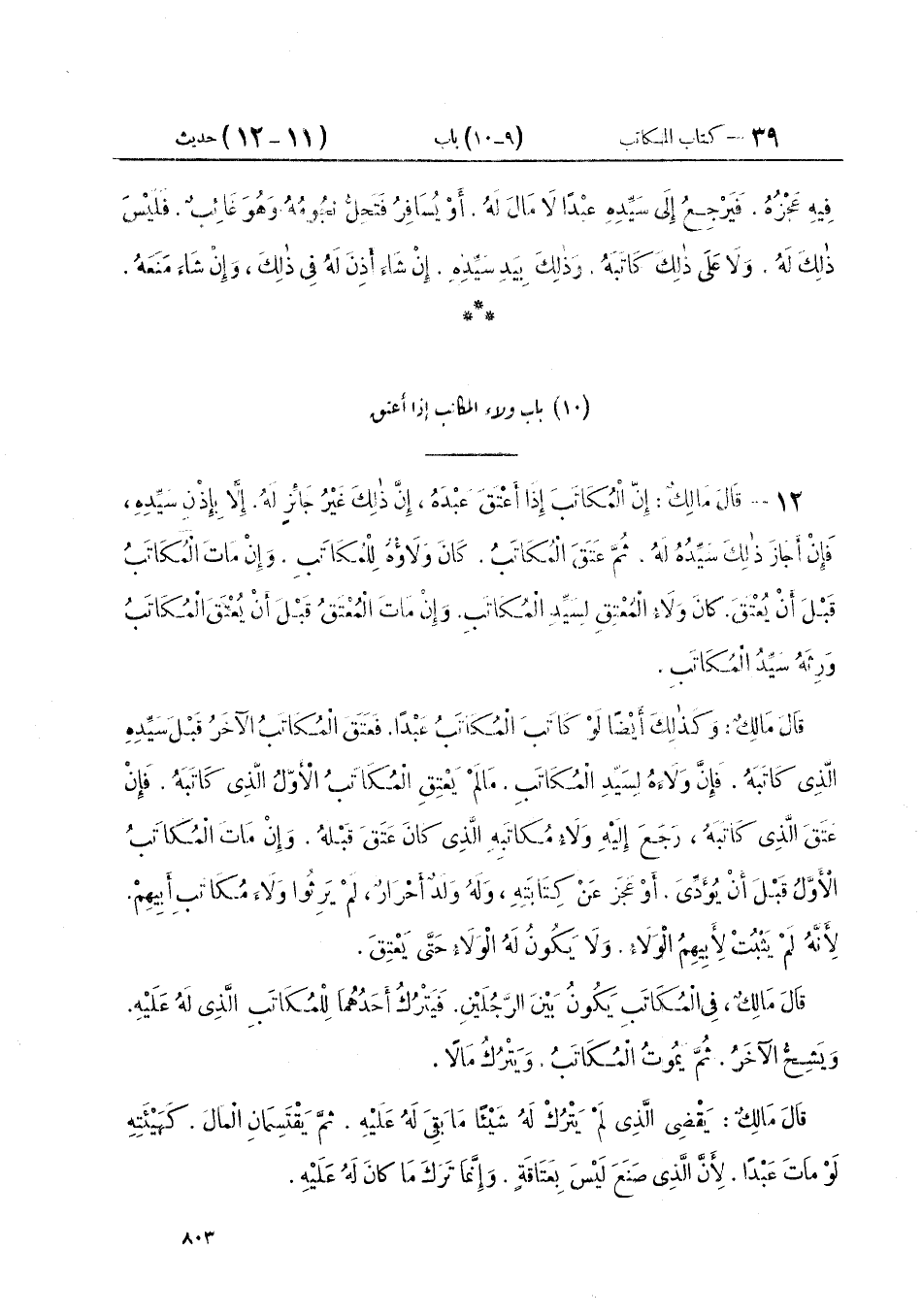 ١٢ - قَالَ مَالِكٌ: «إِنَّ الْمُكَاتَبَ إِذَا أَعْتَقَ عَبْدَهُ إِنَّ ذَلِكَ غَيْرُ جَائِزٍ لَهُ. إِلَّا بِإِذْنِ سَيِّدِهِ فَإِنْ أَجَازَ ذَلِكَ سَيِّدُهُ لَهُ ثُمَّ عَتَقَ الْمُكَاتَبُ كَانَ وَلَاؤُهُ لِلْمُكَاتَبِ. وَإِنْ مَاتَ الْمُكَاتَبُ قَبْلَ أَنْ يُعْتَقَ كَانَ وَلَاءُ الْمُعْتَقِ لِسَيِّدِ الْمُكَاتَبِ وَإِنْ مَاتَ الْمُعْتَقُ قَبْلَ أَنْ يُعْتَقَ الْمُكَاتَبُ وَرِثَهُ سَيِّدُ الْمُكَاتَبِ» قَالَ مَالِكٌ: وَكَذَلِكَ أَيْضًا لَوْ كَاتَبَ الْمُكَاتَبُ عَبْدًا فَعَتَقَ الْمُكَاتَبُ الْآخَرُ قَبْلَ سَيِّدِهِ الَّذِي كَاتَبَهُ فَإِنَّ وَلَاءَهُ لِسَيِّدِ الْمُكَاتَبِ مَا لَمْ يَعْتِقِ الْمُكَاتَبُ الْأَوَّلُ الَّذِي كَاتَبَهُ. فَإِنْ عَتَقَ الَّذِي كَاتَبَهُ رَجَعَ إِلَيْهِ وَلَاءُ مُكَاتَبِهِ الَّذِي كَانَ عَتَقَ قَبْلَهُ. وَإِنْ مَاتَ الْمُكَاتَبُ الْأَوَّلُ قَبْلَ أَنْ يُؤَدِّيَ أَوْ عَجَزَ عَنْ كِتَابَتِهِ وَلَهُ وَلَدٌ أَحْرَارٌ لَمْ يَرِثُوا وَلَاءَ مُكَاتَبِ أَبِيهِمْ لِأَنَّهُ لَمْ يَثْبُتْ لِأَبِيهِمُ الْوَلَاءُ. وَلَا يَكُونُ لَهُ الْوَلَاءُ حَتَّى يَعْتِقَ «قَالَ مَالِكٌ» فِي الْمُكَاتَبِ يَكُونُ بَيْنَ الرَّجُلَيْنِ فَيَتْرُكُ أَحَدُهُمَا لِلْمُكَاتَبِ الَّذِي لَهُ عَلَيْهِ وَيَشِحُّ الْآخَرُ ثُمَّ يَمُوتُ الْمُكَاتَبُ وَيَتْرُكُ مَالًا " قَالَ مَالِكٌ: «يَقْضِي الَّذِي لَمْ يَتْرُكْ لَهُ شَيْئًا مَا بَقِيَ لَهُ عَلَيْهِ. ثُمَّ يَقْتَسِمَانِ الْمَالَ كَهَيْئَتِهِ لَوْ مَاتَ عَبْدًا لِأَنَّ الَّذِي صَنَعَ لَيْسَ بِعَتَاقَةٍ. وَإِنَّمَا تَرَكَ مَا كَانَ لَهُ عَلَيْهِ» ⦗٨٠٤⦘ قَالَ مَالِكٌ وَمِمَّا يُبَيِّنُ ذَلِكَ: «أَنَّ الرَّجُلَ إِذَا مَاتَ وَتَرَكَ مُكَاتَبًا وَتَرَكَ بَنِينَ رِجَالًا وَنِسَاءً. ثُمَّ أَعْتَقَ أَحَدُ الْبَنِينَ نَصِيبَهُ مِنَ الْمُكَاتَبِ إِنَّ ذَلِكَ لَا يُثْبِتُ لَهُ مِنَ الْوَلَاءِ شَيْئًا وَلَوْ كَانَتْ عَتَاقَةً لَثَبَتَ الْوَلَاءُ لِمَنْ أَعْتَقَ مِنْهُمْ مِنْ رِجَالِهِمْ وَنِسَائِهِمْ» قَالَ مَالِكٌ: وَمِمَّا يُبَيِّنُ ذَلِكَ أَيْضًا " أَنَّهُمْ إِذَا أَعْتَقَ أَحَدُهُمْ نَصِيبَهُ ثُمَّ عَجَزَ الْمُكَاتَبُ لَمْ يُقَوَّمْ عَلَى الَّذِي أَعْتَقَ نَصِيبَهُ مَا بَقِيَ مِنَ الْمُكَاتَبِ وَلَوْ كَانَتْ عَتَاقَةً قُوِّمَ عَلَيْهِ حَتَّى يَعْتِقَ فِي مَالِهِ كَمَا قَالَ رَسُولُ اللَّهِ صَلَّى اللهُ عَلَيْهِ وَسَلَّمَ: «مَنْ أَعْتَقَ شِرْكًا لَهُ فِي عَبْدٍ قُوِّمَ عَلَيْهِ قِيمَةَ الْعَدْلِ. فَإِنْ لَمْ يَكُنْ لَهُ مَالٌ عَتَقَ مِنْهُ مَا عَتَقَ» قَالَ: وَمِمَّا يُبَيِّنُ ذَلِكَ أَيْضًا: أَنَّ مِنْ سُنَّةِ الْمُسْلِمِينَ الَّتِي لَا اخْتِلَافَ فِيهَا. أَنَّ مَنْ أَعْتَقَ شِرْكًا لَهُ فِي مُكَاتَبٍ لَمْ يُعْتَقْ عَلَيْهِ فِي مَالِهِ وَلَوْ عَتَقَ عَلَيْهِ. كَانَ الْوَلَاءُ لَهُ دُونَ شُرَكَائِهِ وَمِمَّا يُبَيِّنُ ذَلِكَ أَيْضًا: أَنَّ مِنْ سُنَّةِ الْمُسْلِمِينَ أَنَّ الْوَلَاءَ لِمَنْ عَقَدَ الْكِتَابَةَ. وَأَنَّهُ لَيْسَ لِمَنْ وَرِثَ سَيِّدَ الْمُكَاتَبِ مِنَ النِّسَاءِ مِنْ وَلَاءِ الْمُكَاتَبِ. وَإِنْ أَعْتَقْنَ نَصِيبَهُنَّ شَيْءٌ إِنَّمَا وَلَاؤُهُ لِوَلَدِ سَيِّدِ الْمُكَاتَبِ الذُّكُورِ أَوْ عَصَبَتِهِ مِنَ الرِّجَالِ "
