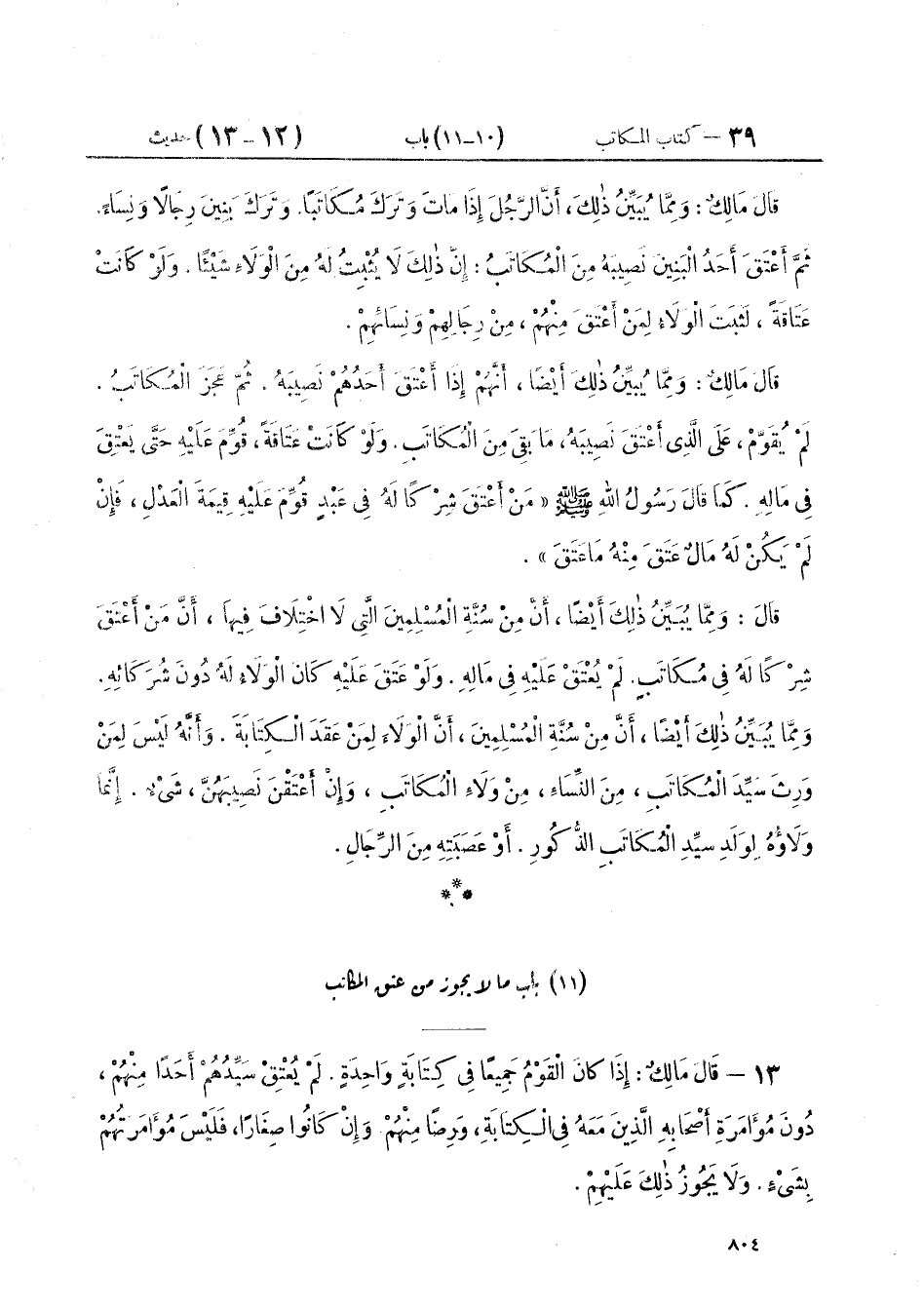 ١٣ - قَالَ مَالِكٌ: " إِذَا كَانَ الْقَوْمُ جَمِيعًا فِي كِتَابَةٍ وَاحِدَةٍ. لَمْ يُعْتِقْ سَيِّدُهُمْ أَحَدًا مِنْهُمْ دُونَ مُؤَامَرَةِ أَصْحَابِهِ الَّذِينَ مَعَهُ فِي الْكِتَابَةِ وَرِضًا مِنْهُمْ. وَإِنْ كَانُوا صِغَارًا فَلَيْسَ مُؤَامَرَتُهُمْ بِشَيْءٍ. وَلَا يَجُوزُ ذَلِكَ عَلَيْهِمْ. ⦗٨٠٥⦘ قَالَ: وَذَلِكَ أَنَّ الرَّجُلَ رُبَّمَا كَانَ يَسْعَى عَلَى جَمِيعِ الْقَوْمِ وَيُؤَدِّي عَنْهُمْ كِتَابَتَهُمْ لِتَتِمَّ بِهِ عَتَاقَتُهُمْ فَيَعْمِدُ السَّيِّدُ إِلَى الَّذِي يُؤَدِّي عَنْهُمْ. وَبِهِ نَجَاتُهُمْ مِنَ الرِّقِّ، فَيُعْتِقُهُ. فَيَكُونُ ذَلِكَ عَجْزًا لِمَنْ بَقِيَ مِنْهُمْ وَإِنَّمَا أَرَادَ بِذَلِكَ الْفَضْلَ وَالزِّيَادَةَ لِنَفْسِهِ فَلَا يَجُوزُ ذَلِكَ عَلَى مَنْ بَقِيَ مِنْهُمْ وَقَدْ قَالَ رَسُولُ اللَّهِ صَلَّى اللهُ عَلَيْهِ وَسَلَّمَ: «لَا ضَرَرَ وَلَا ضِرَارَ وَهَذَا أَشَدُّ الضَّرَرِ» قَالَ مَالِكٌ فِي الْعَبِيدِ يُكَاتَبُونَ جَمِيعًا: «إِنَّ لِسَيِّدِهِمْ أَنْ يُعْتِقَ مِنْهُمُ الْكَبِيرَ الْفَانِيَ وَالصَّغِيرَ الَّذِي لَا يُؤَدِّي وَاحِدٌ مِنْهُمَا شَيْئًا وَلَيْسَ عِنْدَ وَاحِدٍ مِنْهُمَا عَوْنٌ وَلَا قُوَّةٌ فِي كِتَابَتِهِمْ فَذَلِكَ جَائِزٌ لَهُ»