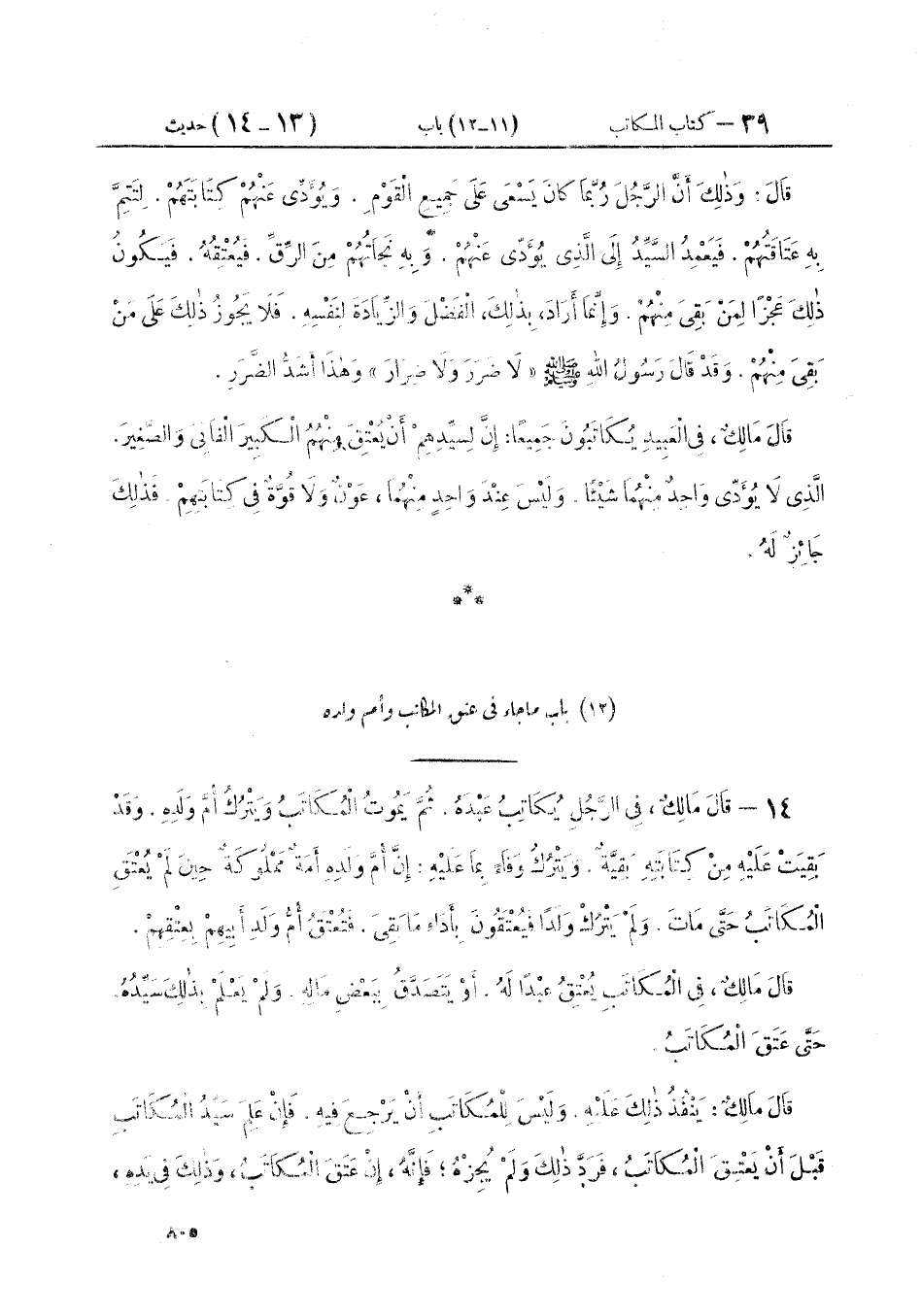 ١٤ - قَالَ مَالِكٌ فِي الرَّجُلِ يُكَاتِبُ عَبْدَهُ. ثُمَّ يَمُوتُ الْمُكَاتَبُ وَيَتْرُكُ أُمَّ وَلَدِهِ. وَقَدْ بَقِيَتْ عَلَيْهِ مِنْ كِتَابَتِهِ بَقِيَّةٌ وَيَتْرُكُ وَفَاءً بِمَا عَلَيْهِ: «إِنَّ أُمَّ وَلَدِهِ أَمَةٌ مَمْلُوكَةٌ حِينَ لَمْ يُعْتَقِ الْمُكَاتَبُ حَتَّى مَاتَ. وَلَمْ يَتْرُكْ وَلَدًا فَيُعْتَقُونَ بِأَدَاءِ مَا بَقِيَ فَتُعْتَقُ أُمُّ وَلَدِ أَبِيهِمْ بِعِتْقِهِمْ» قَالَ مَالِكٌ: «فِي الْمُكَاتَبِ يُعْتِقُ عَبْدًا لَهُ أَوْ يَتَصَدَّقُ بِبَعْضِ مَالِهِ وَلَمْ يَعْلَمْ بِذَلِكَ سَيِّدُهُ حَتَّى عَتَقَ الْمُكَاتَبُ» قَالَ مَالِكٌ: «يَنْفُذُ ذَلِكَ عَلَيْهِ وَلَيْسَ لِلْمُكَاتَبِ أَنْ يَرْجِعَ فِيهِ فَإِنْ عَلِمَ سَيِّدُ الْمُكَاتَبِ قَبْلَ أَنْ يَعْتِقَ الْمُكَاتَبُ فَرَدَّ ذَلِكَ وَلَمْ يُجِزْهُ فَإِنَّهُ إِنْ عَتَقَ الْمُكَاتَبُ وَذَلِكَ فِي يَدِهِ ⦗٨٠٦⦘ لَمْ يَكُنْ عَلَيْهِ أَنْ يُعْتِقَ ذَلِكَ الْعَبْدَ وَلَا أَنْ يُخْرِجَ تِلْكَ الصَّدَقَةَ إِلَّا أَنْ يَفْعَلَ ذَلِكَ طَائِعًا مِنْ عِنْدِ نَفْسِهِ»
