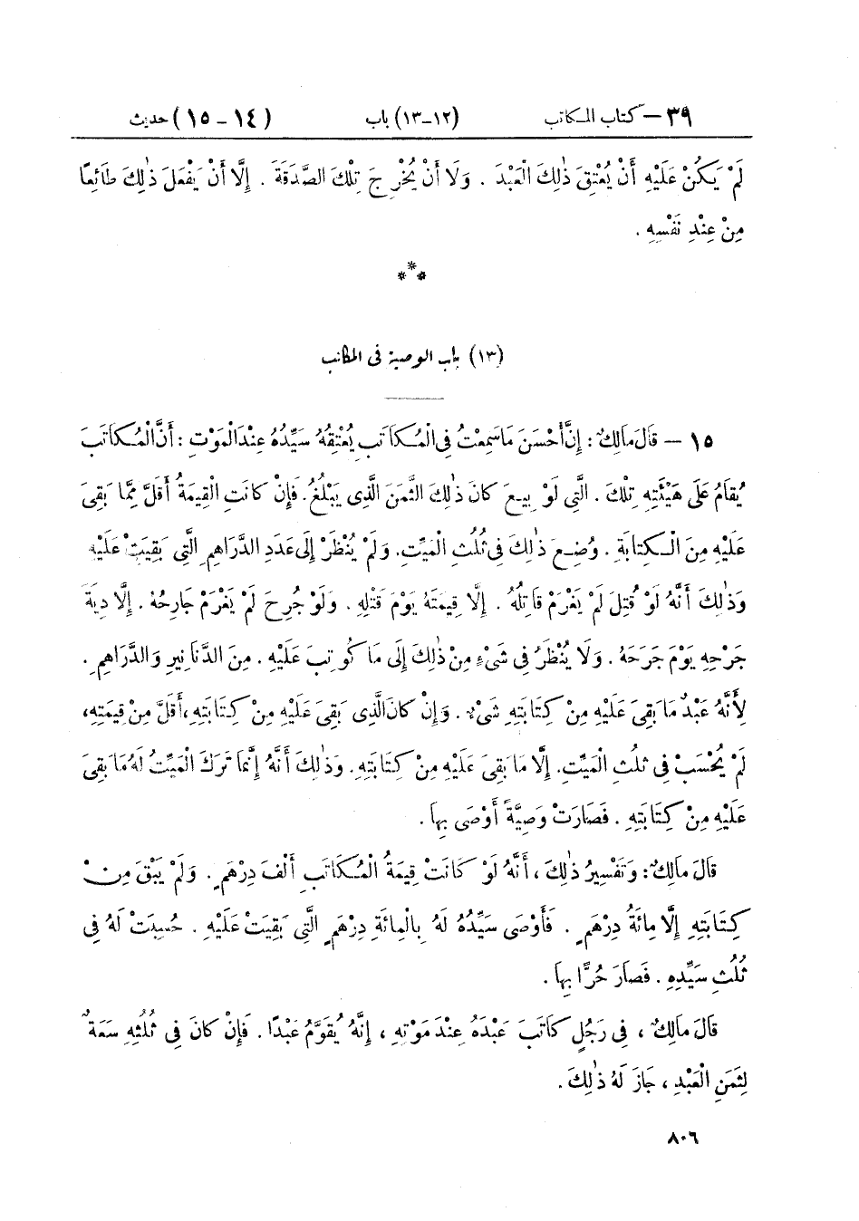 ١٥ - قَالَ مَالِكٌ إِنَّ أَحْسَنَ مَا سَمِعْتُ فِي الْمُكَاتَبِ يُعْتِقُهُ سَيِّدُهُ عِنْدَ الْمَوْتِ: «أَنَّ الْمُكَاتَبَ يُقَامُ عَلَى هَيْئَتِهِ تِلْكَ الَّتِي لَوْ بِيعَ كَانَ ذَلِكَ الثَّمَنَ الَّذِي يَبْلُغُ فَإِنْ كَانَتِ الْقِيمَةُ أَقَلَّ مِمَّا بَقِيَ عَلَيْهِ مِنَ الْكِتَابَةِ وُضِعَ ذَلِكَ فِي ثُلُثِ الْمَيِّتِ. وَلَمْ يُنْظَرْ إِلَى عَدَدِ الدَّرَاهِمِ الَّتِي بَقِيَتْ عَلَيْهِ. وَذَلِكَ أَنَّهُ لَوْ قُتِلَ لَمْ يَغْرَمْ قَاتِلُهُ إِلَّا قِيمَتَهُ يَوْمَ قَتْلِهِ وَلَوْ جُرِحَ لَمْ يَغْرَمْ جَارِحُهُ إِلَّا دِيَةَ جَرْحِهِ يَوْمَ جَرَحَهُ. وَلَا يُنْظَرُ فِي شَيْءٍ مِنْ ذَلِكَ إِلَى مَا كُوتِبَ عَلَيْهِ مِنَ الدَّنَانِيرِ وَالدَّرَاهِمِ. لِأَنَّهُ عَبْدٌ مَا بَقِيَ عَلَيْهِ مِنْ كِتَابَتِهِ شَيْءٌ وَإِنْ كَانَ الَّذِي بَقِيَ عَلَيْهِ مِنْ كِتَابَتِهِ أَقَلَّ مِنْ قِيمَتِهِ لَمْ يُحْسَبْ فِي ثُلُثِ الْمَيِّتِ إِلَّا مَا بَقِيَ عَلَيْهِ مِنْ كِتَابَتِهِ. وَذَلِكَ أَنَّهُ إِنَّمَا تَرَكَ الْمَيِّتُ لَهُ مَا بَقِيَ عَلَيْهِ مِنْ كِتَابَتِهِ فَصَارَتْ وَصِيَّةً أَوْصَى بِهَا» قَالَ مَالِكٌ وَتَفْسِيرُ ذَلِكَ «أَنَّهُ لَوْ كَانَتْ قِيمَةُ الْمُكَاتَبِ أَلْفَ دِرْهَمٍ وَلَمْ يَبْقَ مِنْ كِتَابَتِهِ إِلَّا مِائَةُ دِرْهَمٍ. فَأَوْصَى سَيِّدُهُ لَهُ بِالْمِائَةِ دِرْهَمٍ الَّتِي بَقِيَتْ عَلَيْهِ. حُسِبَتْ لَهُ فِي ثُلُثِ سَيِّدِهِ فَصَارَ حُرًّا بِهَا» قَالَ مَالِكٌ فِي رَجُلٍ كَاتَبَ عَبْدَهُ عِنْدَ مَوْتِهِ: «إِنَّهُ يُقَوَّمُ عَبْدًا. فَإِنْ كَانَ فِي ثُلُثِهِ سَعَةٌ لِثَمَنِ الْعَبْدِ جَازَ لَهُ ذَلِكَ»