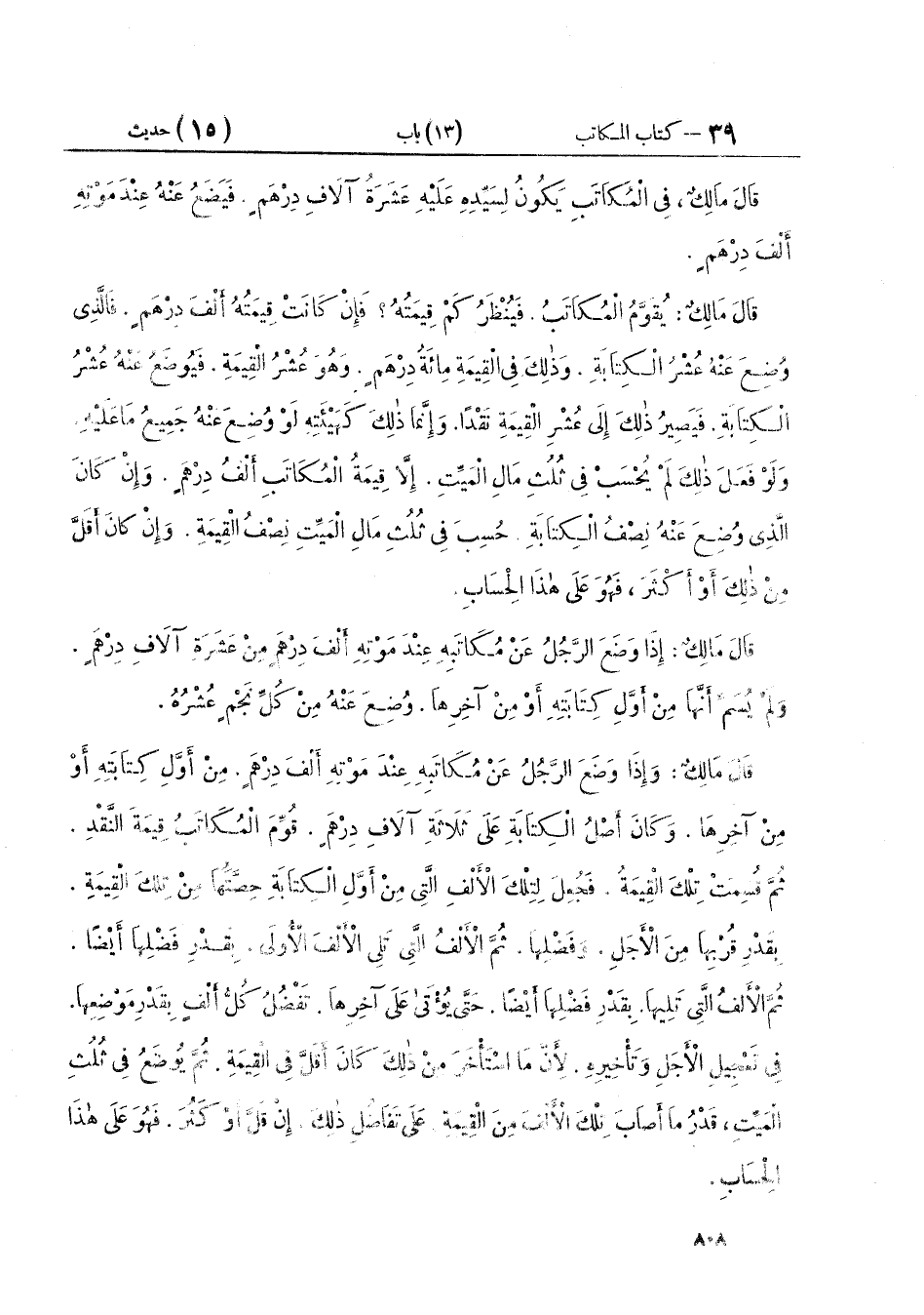 قَالَ مَالِكٌ: «فِي الْمُكَاتَبِ يَكُونُ لِسَيِّدِهِ عَلَيْهِ عَشَرَةُ آلَافِ دِرْهَمٍ فَيَضَعُ عَنْهُ عِنْدَ مَوْتِهِ أَلْفَ دِرْهَمٍ» قَالَ مَالِكٌ: «يُقَوَّمُ الْمُكَاتَبُ فَيُنْظَرُ كَمْ قِيمَتُهُ. فَإِنْ كَانَتْ قِيمَتُهُ أَلْفَ دِرْهَمٍ فَالَّذِي وُضِعَ عَنْهُ عُشْرُ الْكِتَابَةِ. وَذَلِكَ فِي الْقِيمَةِ مِائَةُ دِرْهَمٍ. وَهُوَ عُشْرُ الْقِيمَةِ فَيُوضَعُ عَنْهُ عُشْرُ الْكِتَابَةِ فَيَصِيرُ ذَلِكَ إِلَى عُشْرِ الْقِيمَةِ نَقْدًا. وَإِنَّمَا ذَلِكَ كَهَيْئَتِهِ لَوْ وُضِعَ عَنْهُ جَمِيعُ مَا عَلَيْهِ وَلَوْ فَعَلَ ذَلِكَ لَمْ يُحْسَبْ فِي ثُلُثِ مَالِ الْمَيِّتِ إِلَّا قِيمَةُ الْمُكَاتَبِ أَلْفُ دِرْهَمٍ. وَإِنْ كَانَ الَّذِي وُضِعَ عَنْهُ نِصْفُ الْكِتَابَةِ حُسِبَ فِي ثُلُثِ مَالِ الْمَيِّتِ نِصْفُ الْقِيمَةِ. وَإِنْ كَانَ أَقَلَّ مِنْ ذَلِكَ أَوْ أَكْثَرَ فَهُوَ عَلَى هَذَا الْحِسَابِ» قَالَ مَالِكٌ: «إِذَا وَضَعَ الرَّجُلُ عَنْ مُكَاتَبِهِ عِنْدَ مَوْتِهِ أَلْفَ دِرْهَمٍ مِنْ عَشَرَةِ آلَافِ دِرْهَمٍ وَلَمْ يُسَمِّ أَنَّهَا مِنْ أَوَّلِ كِتَابَتِهِ أَوْ مِنْ آخِرِهَا. وُضِعَ عَنْهُ مِنْ كُلِّ نَجْمٍ عُشْرُهُ» قَالَ مَالِكٌ: «وَإِذَا وَضَعَ الرَّجُلُ عَنْ مُكَاتَبِهِ عِنْدَ الْمَوْتِ أَلْفَ دِرْهَمٍ مِنْ أَوَّلِ كِتَابَتِهِ أَوْ مِنْ آخِرِهَا. وَكَانَ أَصْلُ الْكِتَابَةِ عَلَى ثَلَاثَةِ آلَافِ دِرْهَمٍ قُوِّمَ الْمُكَاتَبُ قِيمَةَ النَّقْدِ ثُمَّ قُسِمَتْ تِلْكَ الْقِيمَةُ فَجُعِلَ لِتِلْكَ الْأَلْفِ الَّتِي مِنْ أَوَّلِ الْكِتَابَةِ حِصَّتُهَا مِنْ تِلْكَ الْقِيمَةِ بِقَدْرِ قُرْبِهَا مِنَ الْأَجَلِ وَفَضْلِهَا. ثُمَّ الْأَلْفُ الَّتِي تَلِي الْأَلْفَ الْأُولَى بِقَدْرِ فَضْلِهَا أَيْضًا. ثُمَّ الْأَلْفُ الَّتِي تَلِيهَا بِقَدْرِ فَضْلِهَا أَيْضًا حَتَّى يُؤْتَى عَلَى آخِرِهَا تَفْضُلُ كُلُّ أَلْفٍ بِقَدْرِ مَوْضِعِهَا فِي تَعْجِيلِ الْأَجَلِ وَتَأْخِيرِهِ؛ لِأَنَّ مَا اسْتَأْخَرَ مِنْ ذَلِكَ كَانَ أَقَلَّ فِي الْقِيمَةِ ثُمَّ يُوضَعُ فِي ثُلُثِ الْمَيِّتِ قَدْرُ مَا أَصَابَ تِلْكَ الْأَلْفَ مِنَ الْقِيمَةِ عَلَى تَفَاضُلِ ذَلِكَ إِنْ قَلَّ أَوْ كَثُرَ. فَهُوَ عَلَى هَذَا الْحِسَابِ»
