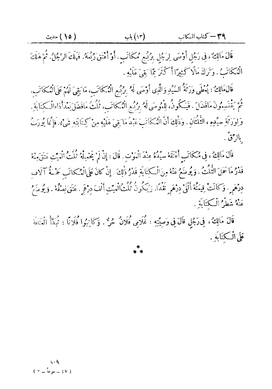 قَالَ مَالِكٌ: «فِي رَجُلٍ أَوْصَى لِرَجُلٍ بِرُبُعِ مُكَاتَبٍ أَوْ أَعْتَقَ رُبُعَهُ. فَهَلَكَ الرَّجُلُ ثُمَّ هَلَكَ الْمُكَاتَبُ وَتَرَكَ مَالًا كَثِيرًا أَكْثَرَ مِمَّا بَقِيَ عَلَيْهِ» قَالَ مَالِكٌ: «يُعْطَى وَرَثَةُ السَّيِّدِ وَالَّذِي أَوْصَى لَهُ بِرُبُعِ الْمُكَاتَبِ مَا بَقِيَ لَهُمْ عَلَى الْمُكَاتَبِ ثُمَّ يَقْتَسِمُونَ مَا فَضَلَ فَيَكُونُ لِلْمُوصَى لَهُ بِرُبُعِ الْمُكَاتَبِ ثُلُثُ مَا فَضَلَ بَعْدَ أَدَاءِ الْكِتَابَةِ وَلِوَرَثَةِ سَيِّدِهِ الثُّلُثَانِ. وَذَلِكَ أَنَّ الْمُكَاتَبَ عَبْدٌ مَا بَقِيَ عَلَيْهِ مِنْ كِتَابَتِهِ شَيْءٌ فَإِنَّمَا يُورَثُ بِالرِّقِّ» قَالَ مَالِكٌ فِي مُكَاتَبٍ أَعْتَقَهُ سَيِّدُهُ عِنْدَ الْمَوْتِ قَالَ: «إِنْ لَمْ يَحْمِلْهُ ثُلُثُ الْمَيِّتِ عَتَقَ مِنْهُ قَدْرُ مَا حَمَلَ الثُّلُثُ وَيُوضَعُ عَنْهُ مِنَ الْكِتَابَةِ قَدْرُ ذَلِكَ. إِنْ كَانَ عَلَى الْمُكَاتَبِ خَمْسَةُ آلَافِ دِرْهَمٍ وَكَانَتْ قِيمَتُهُ أَلْفَيْ دِرْهَمٍ نَقْدًا. وَيَكُونُ ثُلُثُ الْمَيِّتِ أَلْفَ دِرْهَمٍ. عَتَقَ نِصْفُهُ وَيُوضَعُ عَنْهُ شَطْرُ الْكِتَابَةِ» قَالَ مَالِكٌ: فِي رَجُلٍ قَالَ: «فِي وَصِيَّتِهِ غُلَامِي فُلَانٌ حُرٌّ وَكَاتِبُوا فُلَانًا تُبَدَّأُ الْعَتَاقَةُ عَلَى الْكِتَابَةِ»