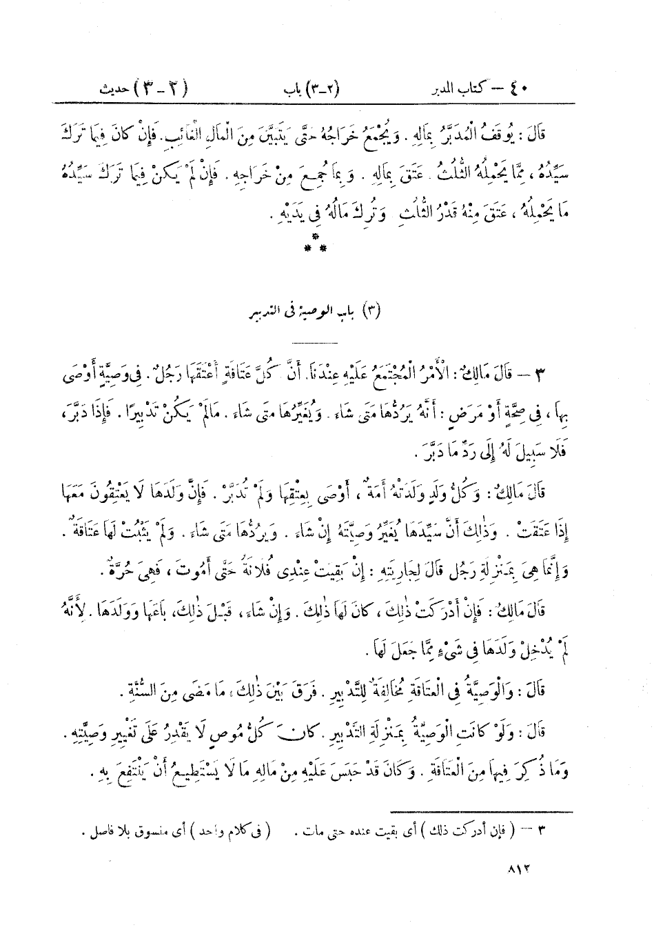 ٣ - قَالَ مَالِكٌ الْأَمْرُ الْمُجْتَمَعُ عَلَيْهِ عِنْدَنَا: " أَنَّ كُلَّ عَتَاقَةٍ أَعْتَقَهَا رَجُلٌ. فِي وَصِيَّةٍ أَوْصَى بِهَا فِي صِحَّةٍ أَوْ مَرَضٍ: أَنَّهُ يَرُدُّهَا مَتَى شَاءَ. وَيُغَيِّرُهَا مَتَى شَاءَ، مَا لَمْ يَكُنْ تَدْبِيرًا. فَإِذَا دَبَّرَ، فَلَا سَبِيلَ لَهُ إِلَى رَدِّ مَا دَبَّرَ " قَالَ مَالِكٌ: " وَكُلُّ وَلَدٍ وَلَدَتْهُ أَمَةٌ، أَوْصَى بِعِتْقِهَا وَلَمْ تُدَبَّرْ. فَإِنَّ وَلَدَهَا لَا يَعْتِقُونَ مَعَهَا إِذَا عَتَقَتْ. وَذَلِكَ أَنَّ سَيِّدَهَا يُغَيِّرُ وَصِيَّتَهُ إِنْ شَاءَ. وَيَرُدُّهَا مَتَى شَاءَ. وَلَمْ يَثْبُتْ لَهَا عَتَاقَةٌ. وَإِنَّمَا هِيَ بِمَنْزِلَةِ رَجُلٍ قَالَ لِجَارِيَتِهِ: إِنْ بَقِيَتْ عِنْدِي فُلَانَةُ حَتَّى أَمُوتَ، فَهِيَ حُرَّةٌ " قَالَ مَالِكٌ: فَإِنْ أَدْرَكَتْ ذَلِكَ، كَانَ لَهَا ذَلِكَ. وَإِنْ شَاءَ، قَبْلَ ذَلِكَ، بَاعَهَا وَوَلَدَهَا لِأَنَّهُ لَمْ يُدْخِلْ وَلَدَهَا فِي شَيْءٍ مِمَّا جَعَلَ لَهَا. قَالَ: وَالْوَصِيَّةُ فِي الْعَتَاقَةِ مُخَالِفَةٌ لِلتَّدْبِيرِ، فَرَقَ بَيْنَ ذَلِكَ مَا مَضَى مِنَ السُّنَّةِ. قَالَ: وَلَوْ كَانَتِ الْوَصِيَّةُ بِمَنْزِلَةِ التَّدْبِيرِ. كَانَ كُلُّ مُوصٍ لَا يَقْدِرُ عَلَى تَغْيِيرِ وَصِيَّتِهِ. وَمَا ذُكِرَ فِيهَا مِنَ الْعَتَاقَةِ. وَكَانَ قَدْ حَبَسَ عَلَيْهِ مِنْ مَالِهِ مَا لَا يَسْتَطِيعُ أَنْ يَنْتَفِعَ بِهِ "