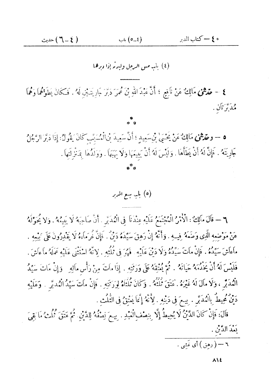 ٤ - حَدَّثَنِي مَالِكٌ عَنْ نَافِعٍ، أَنَّ عَبْدَ اللَّهِ بْنَ عُمَرَ، «دَبَّرَ جَارِيَتَيْنِ لَهُ فَكَانَ يَطَؤُهُمَا وَهُمَا مُدَبَّرَتَانِ»
