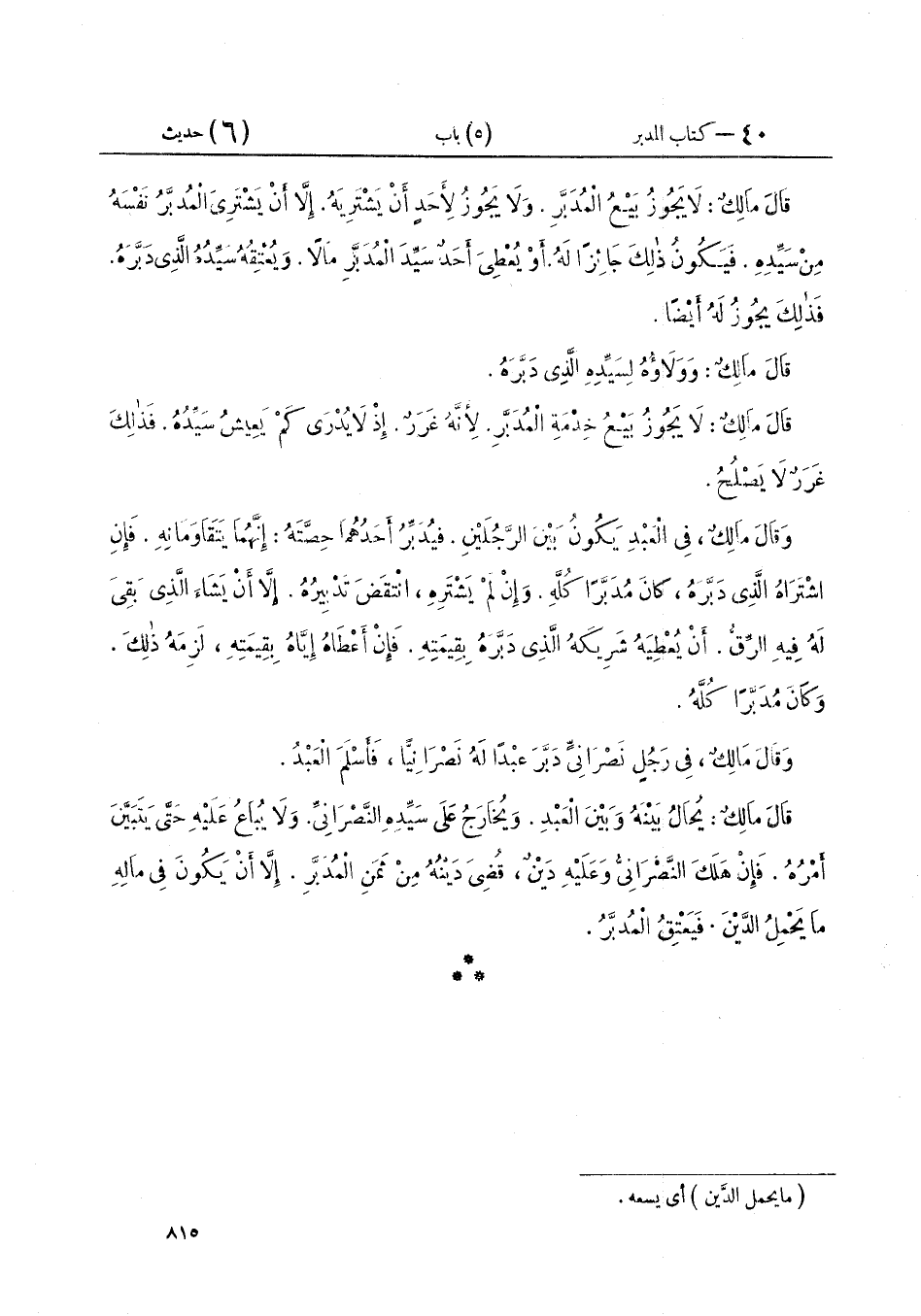 قَالَ مَالِكٌ: «لَا يَجُوزُ بَيْعُ الْمُدَبَّرِ. وَلَا يَجُوزُ لِأَحَدٍ أَنْ يَشْتَرِيَهُ إِلَّا أَنْ يَشْتَرِيَ الْمُدَبَّرُ نَفْسَهُ مِنْ سَيِّدِهِ فَيَكُونُ ذَلِكَ جَائِزًا لَهُ. أَوْ يُعْطِيَ أَحَدٌ سَيِّدَ الْمُدَبَّرِ مَالًا. وَيُعْتِقُهُ سَيِّدُهُ الَّذِي دَبَّرَهُ. فَذَلِكَ يَجُوزُ لَهُ أَيْضًا» قَالَ مَالِكٌ: «وَوَلَاؤُهُ لِسَيِّدِهِ الَّذِي دَبَّرَهُ» قَالَ مَالِكٌ: «لَا يَجُوزُ بَيْعُ خِدْمَةِ الْمُدَبَّرِ. لِأَنَّهُ غَرَرٌ إِذْ لَا يُدْرَى كَمْ يَعِيشُ سَيِّدُهُ فَذَلِكَ غَرَرٌ لَا يَصْلُحُ» وقَالَ مَالِكٌ فِي الْعَبْدِ يَكُونُ بَيْنَ الرَّجُلَيْنِ. فَيُدَبِّرُ أَحَدُهُمَا حِصَّتَهُ: إِنَّهُمَا يَتَقَاوَمَانِهِ. فَإِنِ اشْتَرَاهُ الَّذِي دَبَّرَهُ كَانَ مُدَبَّرًا كُلَّهُ. وَإِنْ لَمْ يَشْتَرِهِ انْتَقَضَ تَدْبِيرُهُ إِلَّا أَنْ يَشَاءَ الَّذِي بَقِيَ لَهُ فِيهِ الرِّقُّ أَنْ يُعْطِيَهُ شَرِيكَهُ الَّذِي دَبَّرَهُ بِقِيمَتِهِ. فَإِنْ أَعْطَاهُ إِيَّاهُ بِقِيمَتِهِ لَزِمَهُ ذَلِكَ. وَكَانَ مُدَبَّرًا كُلَّهُ " وقَالَ مَالِكٌ: «فِي رَجُلٍ نَصْرَانِيٍّ دَبَّرَ عَبْدًا لَهُ نَصْرَانِيًّا فَأَسْلَمَ الْعَبْدُ» قَالَ مَالِكٌ: «يُحَالُ بَيْنَهُ وَبَيْنَ الْعَبْدِ. وَيُخَارَجُ عَلَى سَيِّدِهِ النَّصْرَانِيِّ. وَلَا يُبَاعُ عَلَيْهِ حَتَّى يَتَبَيَّنَ أَمْرُهُ. فَإِنْ هَلَكَ النَّصْرَانِيُّ وَعَلَيْهِ دَيْنٌ، قُضِيَ دَيْنُهُ مِنْ ثَمَنِ الْمُدَبَّرِ. إِلَّا أَنْ يَكُونَ فِي مَالِهِ مَا يَحْمِلُ الدَّيْنَ. فَيَعْتِقُ الْمُدَبَّرُ»