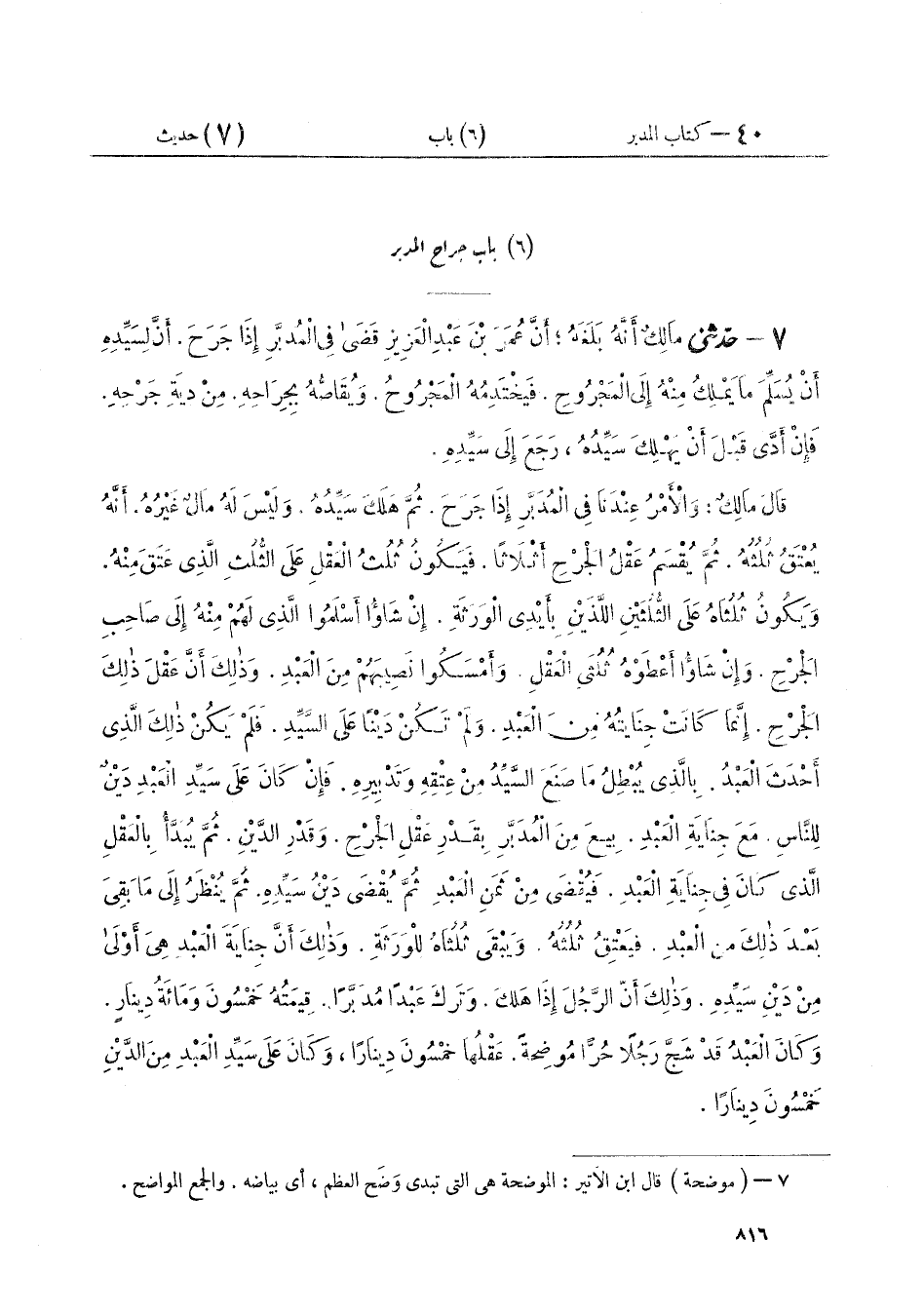 ٧ - حَدَّثَنِي مَالِكٌ أَنَّهُ بَلَغَهُ أَنَّ عُمَرَ بْنَ عَبْدِ الْعَزِيزِ، «قَضَى فِي الْمُدَبَّرِ إِذَا جَرَحَ أَنَّ لِسَيِّدِهِ أَنْ يُسَلِّمَ مَا يَمْلِكُ مِنْهُ إِلَى الْمَجْرُوحِ. فَيَخْتَدِمُهُ الْمَجْرُوحُ وَيُقَاصُّهُ بِجِرَاحِهِ مِنْ دِيَةِ جَرْحِهِ. فَإِنْ أَدَّى قَبْلَ أَنْ يَهْلِكَ سَيِّدُهُ رَجَعَ إِلَى سَيِّدِهِ» قَالَ مَالِكٌ: «وَالْأَمْرُ عِنْدَنَا فِي الْمُدَبَّرِ إِذَا جَرَحَ. ثُمَّ هَلَكَ سَيِّدُهُ وَلَيْسَ لَهُ مَالٌ غَيْرُهُ. أَنَّهُ يُعْتَقُ ثُلُثُهُ. ثُمَّ يُقْسَمُ عَقْلُ الْجَرْحِ أَثْلَاثًا. فَيَكُونُ ثُلُثُ الْعَقْلِ عَلَى الثُّلُثِ الَّذِي عَتَقَ مِنْهُ. وَيَكُونُ ثُلُثَاهُ عَلَى الثُّلُثَيْنِ اللَّذَيْنِ بِأَيْدِي الْوَرَثَةِ إِنْ شَاءُوا أَسْلَمُوا الَّذِي لَهُمْ مِنْهُ إِلَى صَاحِبِ الْجَرْحِ وَإِنْ شَاءُوا أَعْطَوْهُ ثُلُثَيِ الْعَقْلِ، وَأَمْسَكُوا نَصِيبَهُمْ مِنَ الْعَبْدِ. وَذَلِكَ أَنَّ عَقْلَ ذَلِكَ الْجَرْحِ إِنَّمَا كَانَتْ جِنَايَتُهُ مِنَ الْعَبْدِ. وَلَمْ تَكُنْ دَيْنًا عَلَى السَّيِّدِ. فَلَمْ يَكُنْ ذَلِكَ الَّذِي أَحْدَثَ الْعَبْدُ بِالَّذِي يُبْطِلُ مَا صَنَعَ السَّيِّدُ مِنْ عِتْقِهِ وَتَدْبِيرِهِ. فَإِنْ كَانَ عَلَى سَيِّدِ الْعَبْدِ دَيْنٌ لِلنَّاسِ، مَعَ جِنَايَةِ الْعَبْدِ، بِيعَ مِنَ الْمُدَبَّرِ بِقَدْرِ عَقْلِ الْجَرْحِ، وَقَدْرِ الدَّيْنِ. ثُمَّ يُبَدَّأُ بِالْعَقْلِ الَّذِي كَانَ فِي جِنَايَةِ الْعَبْدِ. فَيُقْضَى مِنْ ثَمَنِ الْعَبْدِ. ثُمَّ يُقْضَى دَيْنُ سَيِّدِهِ. ثُمَّ يُنْظَرُ إِلَى مَا بَقِيَ بَعْدَ ذَلِكَ مِنَ الْعَبْدِ، فَيَعْتِقُ ثُلُثُهُ، وَيَبْقَى ثُلُثَاهُ لِلْوَرَثَةِ. وَذَلِكَ أَنَّ جِنَايَةَ الْعَبْدِ هِيَ أَوْلَى مِنْ دَيْنِ سَيِّدِهِ. وَذَلِكَ أَنَّ الرَّجُلَ إِذَا هَلَكَ وَتَرَكَ عَبْدًا مُدَبَّرًا قِيمَتُهُ خَمْسُونَ وَمِائَةُ دِينَارٍ، وَكَانَ الْعَبْدُ قَدْ شَجَّ رَجُلًا حُرًّا مُوضِحَةً عَقْلُهَا خَمْسُونَ دِينَارًا. وَكَانَ عَلَى سَيِّدِ الْعَبْدِ مِنَ الدَّيْنِ خَمْسُونَ دِينَارًا» ⦗٨١٧⦘ قَالَ مَالِكٌ: " فَإِنَّهُ يُبْدَأُ بِالْخَمْسِينَ دِينَارًا الَّتِي فِي عَقْلِ الشَّجَّةِ فَتُقْضَى مِنْ ثَمَنِ الْعَبْدِ. ثُمَّ يُقْضَى دَيْنُ سَيِّدِهِ. ثُمَّ يُنْظَرُ إِلَى مَا بَقِيَ مِنَ الْعَبْدِ. فَيَعْتِقُ ثُلُثُهُ، وَيَبْقَى ثُلُثَاهُ لِلْوَرَثَةِ. فَالْعَقْلُ أَوْجَبُ فِي رَقَبَتِهِ مِنْ دَيْنِ سَيِّدِهِ. وَدَيْنُ سَيِّدِهِ أَوْجَبُ مِنَ التَّدْبِيرِ، الَّذِي إِنَّمَا هُوَ وَصِيَّةٌ فِي ثُلُثِ مَالِ الْمَيِّتِ. فَلَا يَنْبَغِي أَنْ يَجُوزَ شَيْءٌ مِنَ التَّدْبِيرِ، وَعَلَى سَيِّدِ الْمُدَبَّرِ دَيْنٌ لَمْ يُقْضَ. وَإِنَّمَا هُوَ وَصِيَّةٌ. وَذَلِكَ أَنَّ اللَّهَ تَبَارَكَ وَتَعَالَى قَالَ: {مِنْ بَعْدِ وَصِيَّةٍ يُوصَى بِهَا أَوْ دَيْنٍ} [النساء: ١٢] " قالَ مَالِكٌ: «فَإِنْ كَانَ فِي ثُلُثِ الْمَيِّتِ مَا يَعْتِقُ فِيهِ الْمُدَبَّرُ كُلُّهُ عَتَقَ. وَكَانَ عَقْلُ جِنَايَتِهِ دَيْنًا عَلَيْهِ. يُتَّبَعُ بِهِ بَعْدَ عِتْقِهِ. وَإِنْ كَانَ ذَلِكَ الْعَقْلُ الدِّيَةَ كَامِلَةً وَذَلِكَ إِذَا لَمْ يَكُنْ عَلَى سَيِّدِهِ دَيْنٌ» وقَالَ مَالِكٌ فِي الْمُدَبَّرِ إِذَا جَرَحَ رَجُلًا فَأَسْلَمَهُ سَيِّدُهُ إِلَى الْمَجْرُوحِ. ثُمَّ هَلَكَ سَيِّدُهُ. وَعَلَيْهِ دَيْنٌ وَلَمْ يَتْرُكْ مَالًا غَيْرَهُ. فَقَالَ الْوَرَثَةُ: نَحْنُ نُسَلِّمُهُ إِلَى صَاحِبِ الْجُرْحِ. وَقَالَ صَاحِبُ الدَّيْنِ: أَنَا أَزِيدُ عَلَى ذَلِكَ: «إِنَّهُ إِذَا زَادَ الْغَرِيمُ شَيْئًا فَهُوَ أَوْلَى بِهِ وَيُحَطُّ عَنِ الَّذِي عَلَيْهِ الدَّيْنُ قَدْرُ مَا زَادَ الْغَرِيمُ عَلَى دِيَةِ الْجَرْحِ. فَإِنْ لَمْ يَزِدْ شَيْئً
